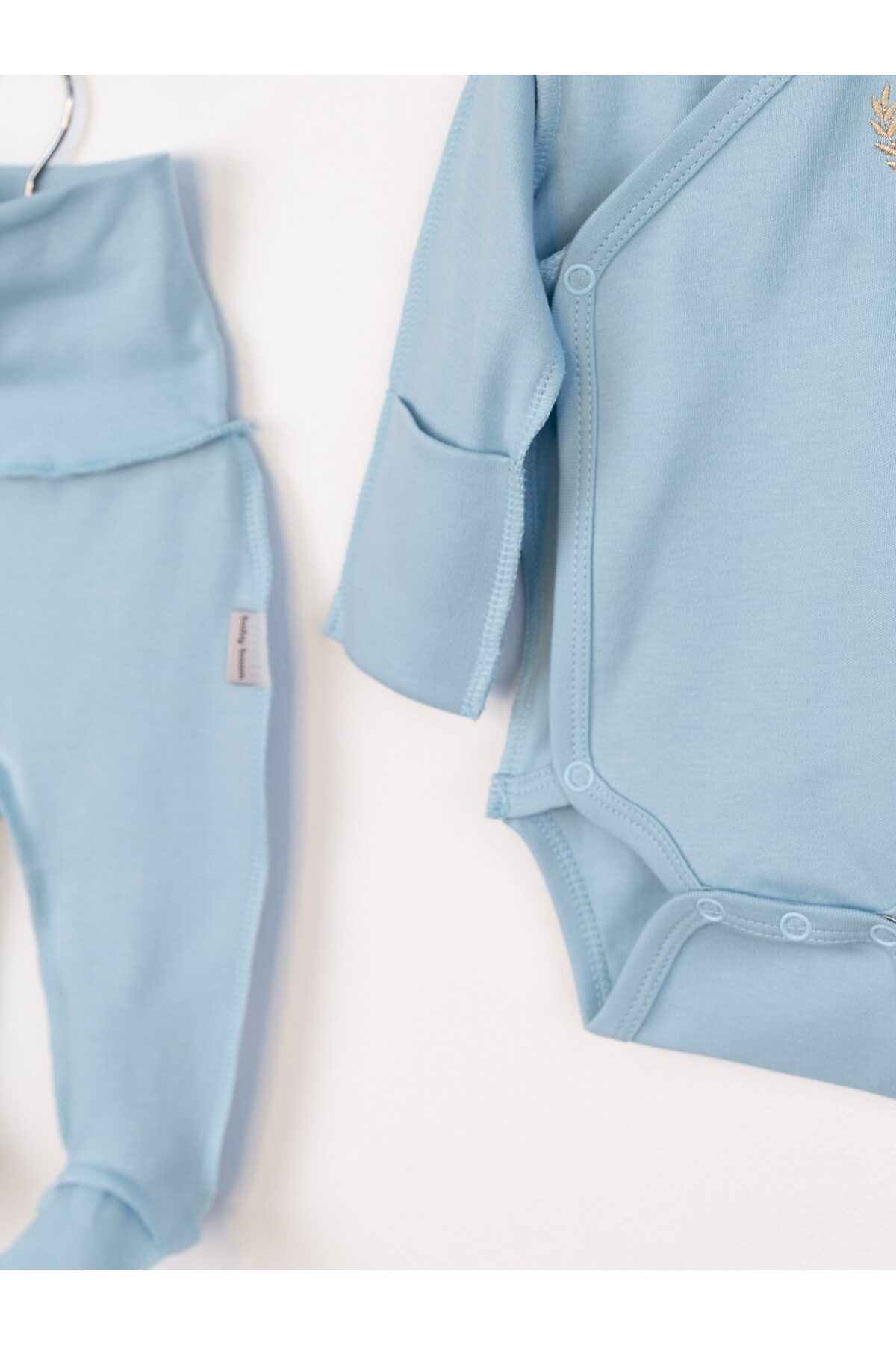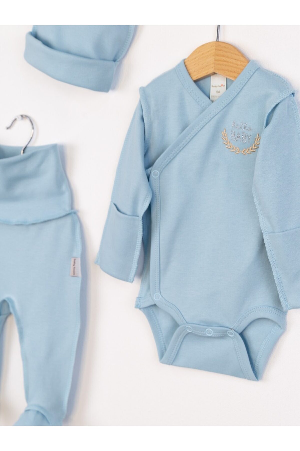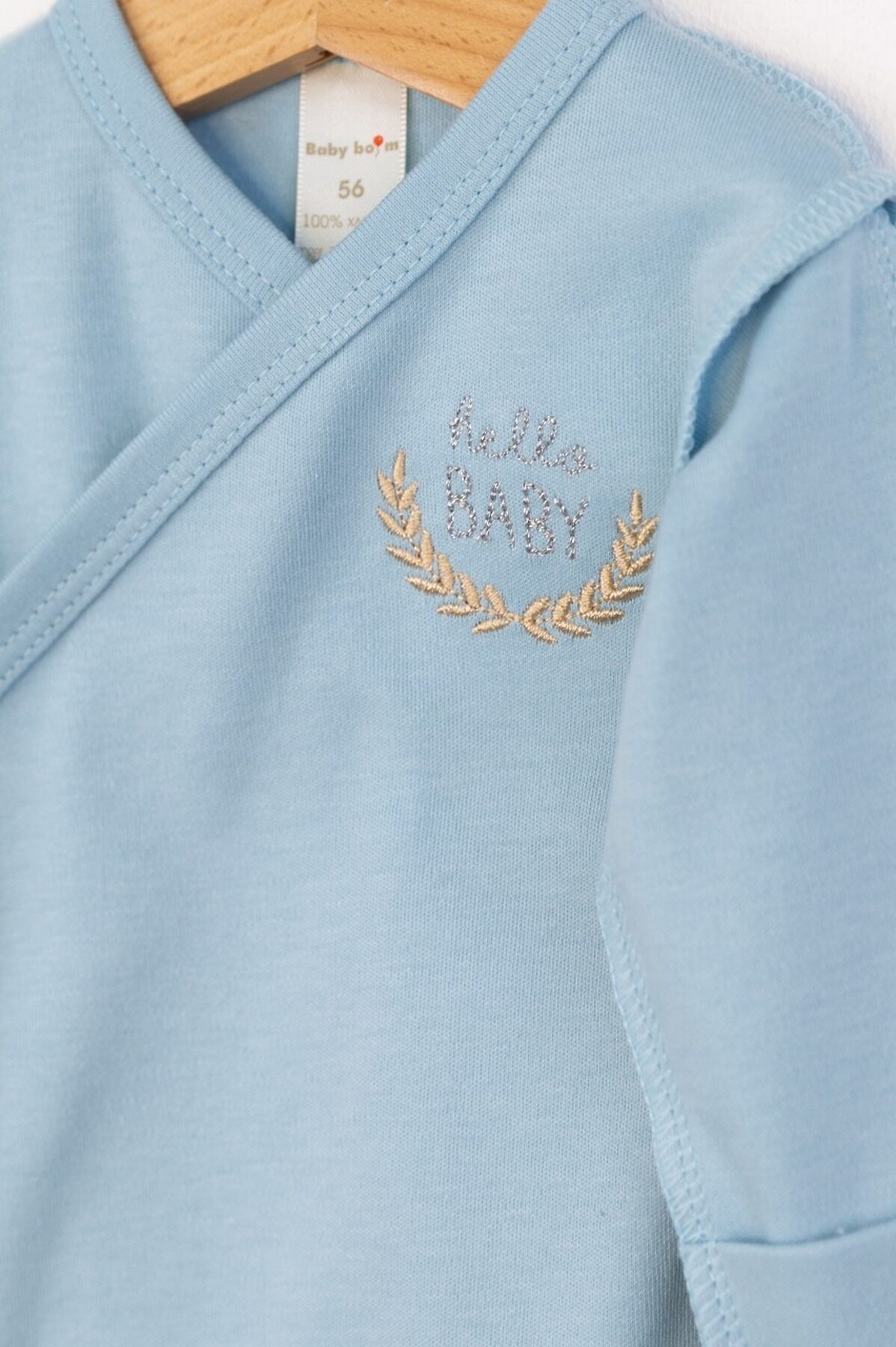 Элегантный комплект для малыша состоит из боди, ползунков с широким поясом и однослойной шапочки. Боди с запахом и антицарапками по низу рукавов, украшен вышивкой по переду. Выполнен швами наружу из интерлока (100% хлопок).