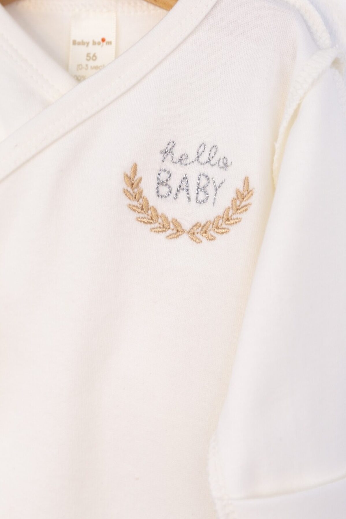 Нежный комплект для малыша, состоит из распашонки с запахом на кнопках с антицарапками, ползунков и шапочки. Перед распашонки украшен вышивкой . Выполнен швами наружу из интерлока (100% хлопок).