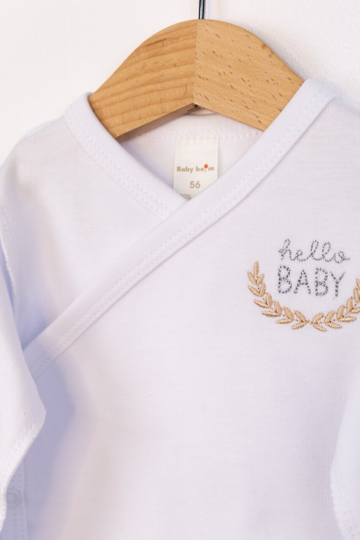 Нежный комплект для малыша, состоит из распашонки с запахом на кнопках с антицарапками, ползунков и шапочки. Перед распашонки украшен вышивкой . Выполнен швами наружу из интерлока (100% хлопок).
