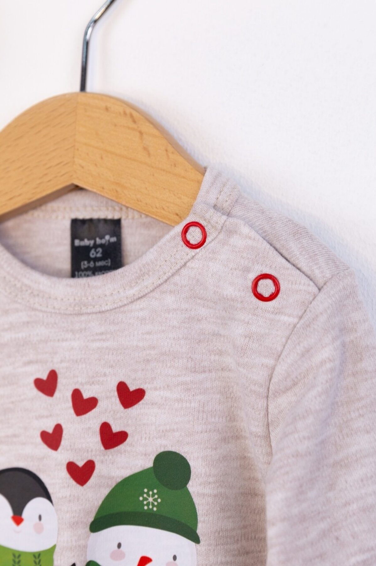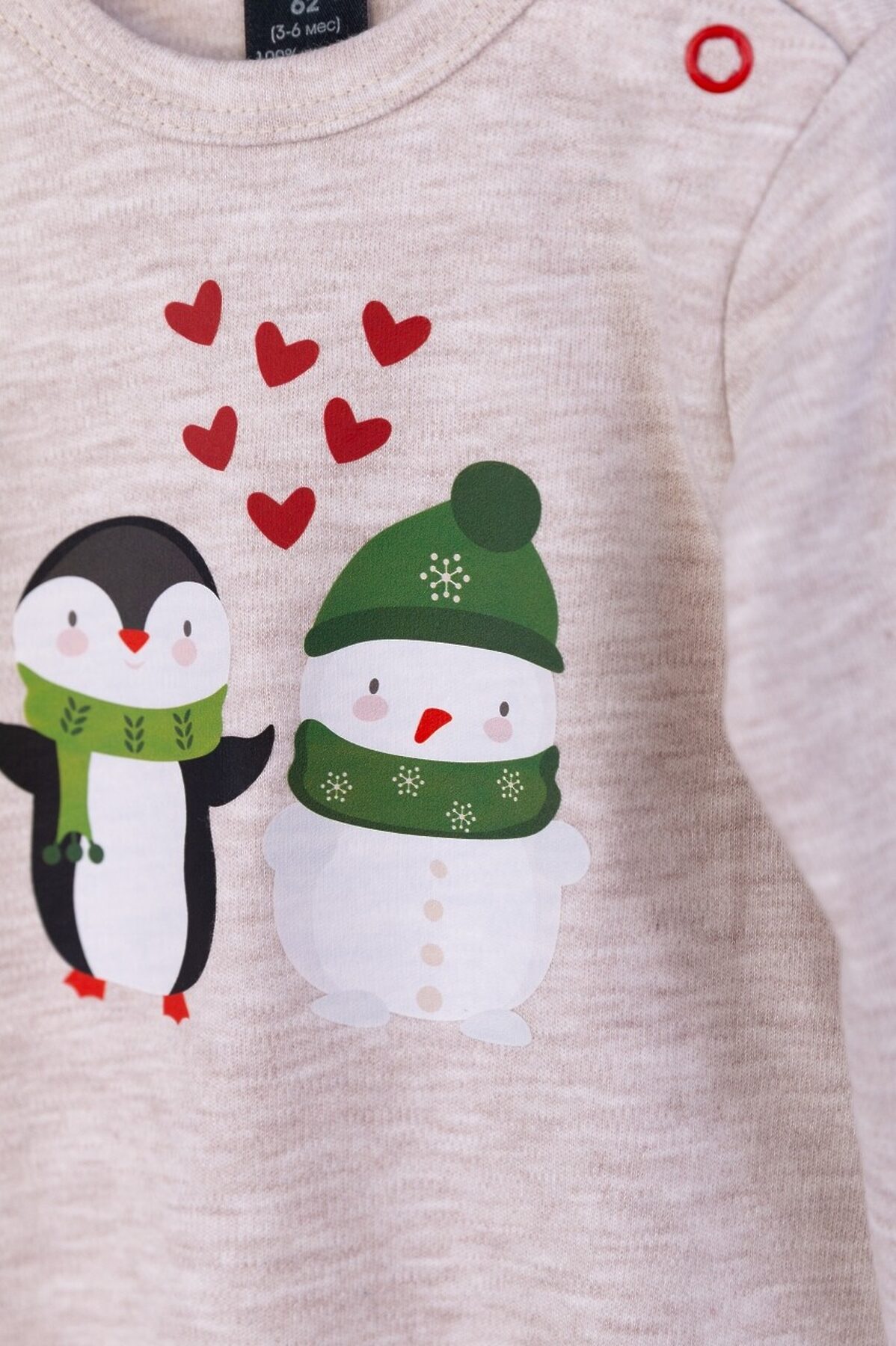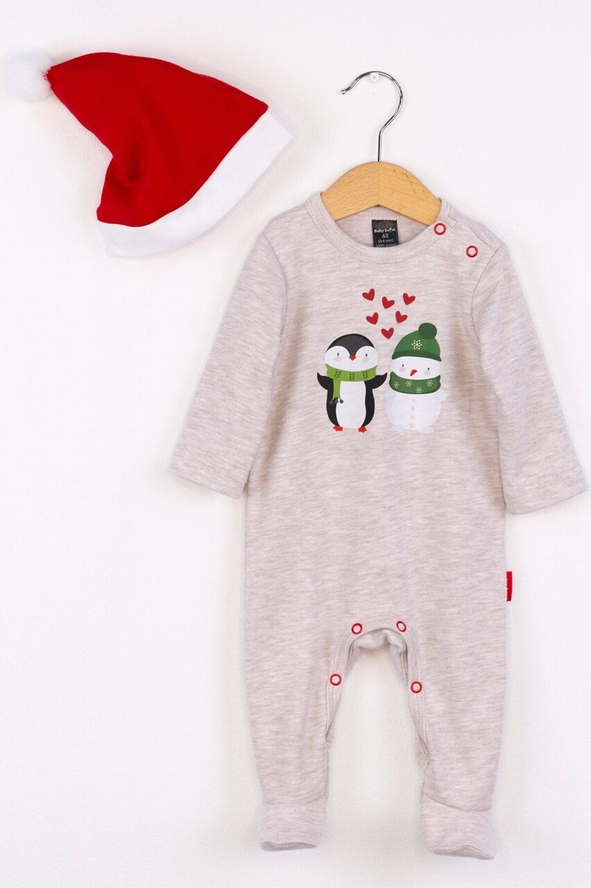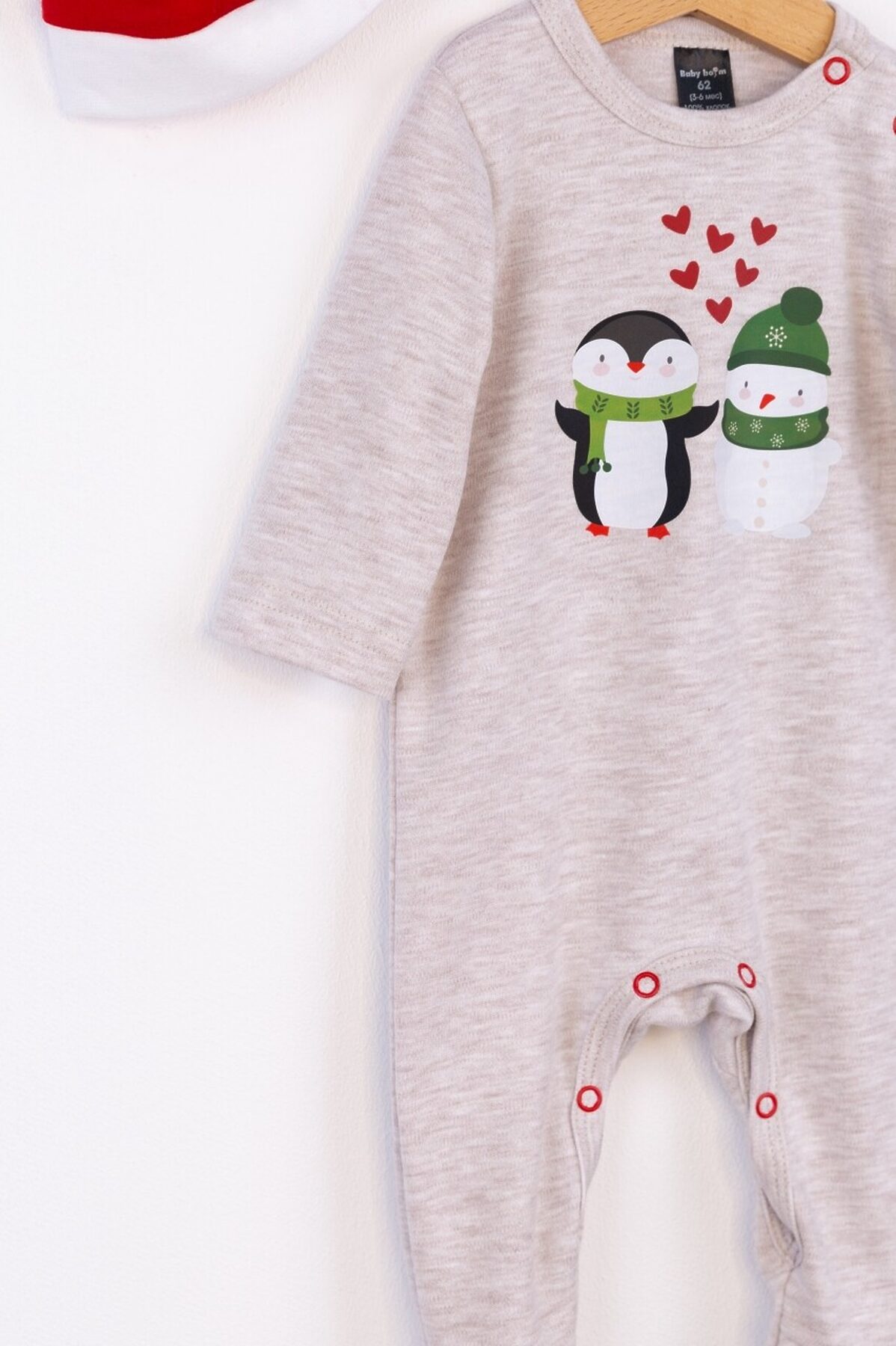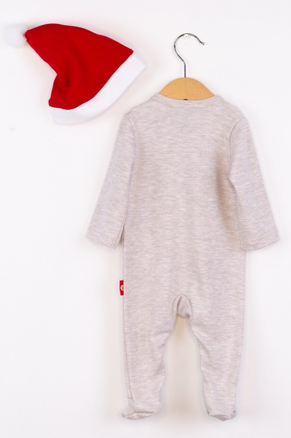 Новогодний комплект состоит из комбинезона и шапочки-колпака. Комбинезон с печатью по переду, застежка на кнопках по плечу и по низу изделия. Выполнен из интерлока (100% хлопок).