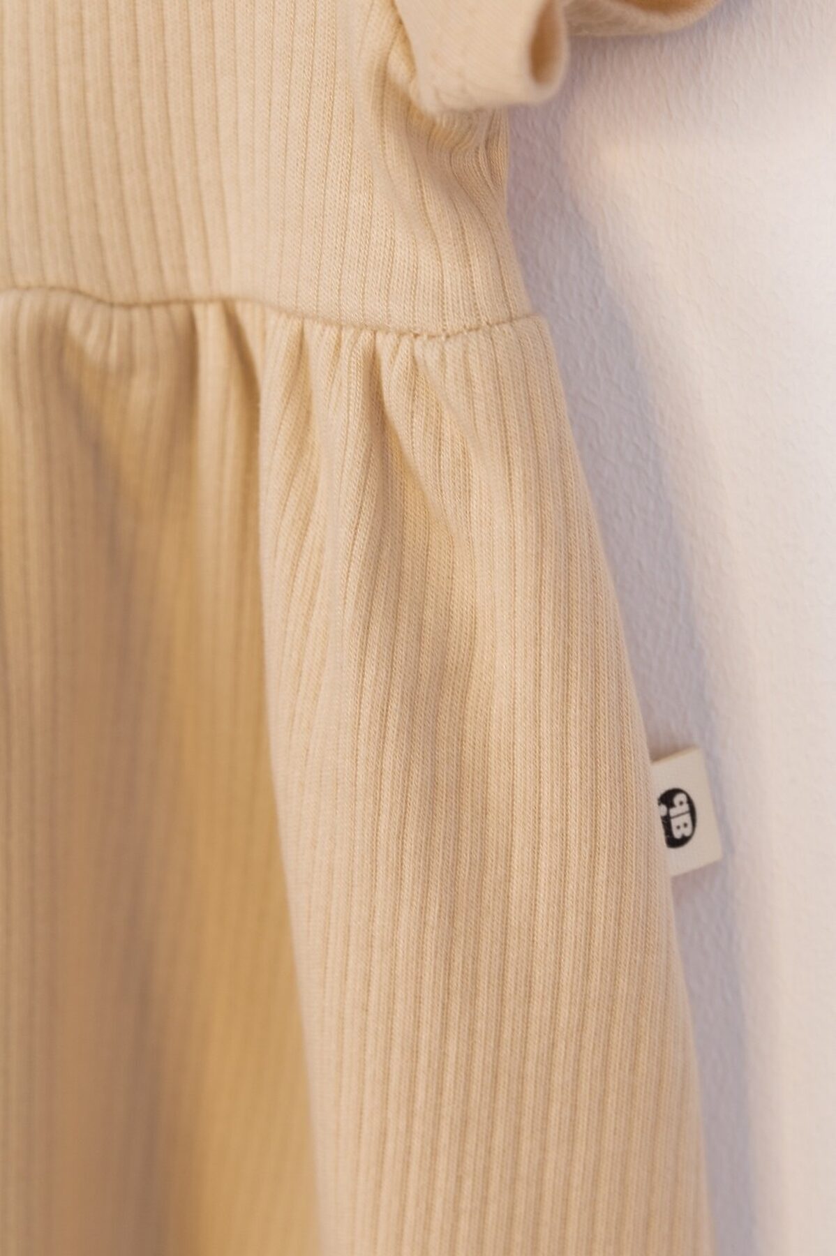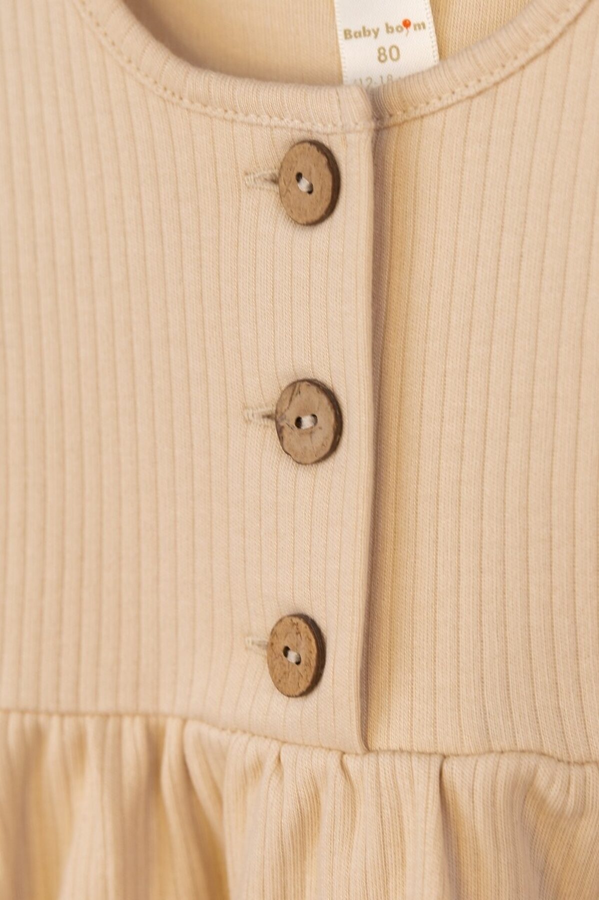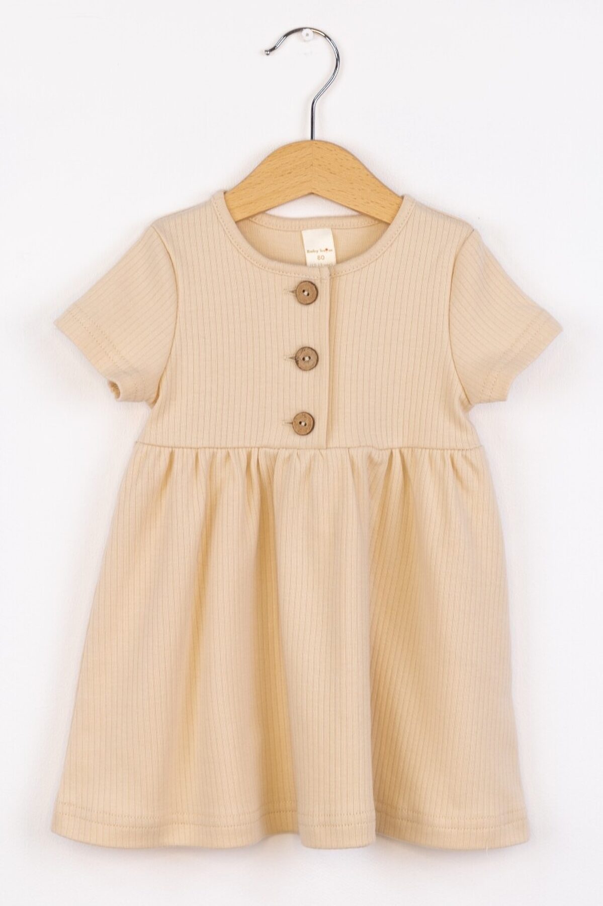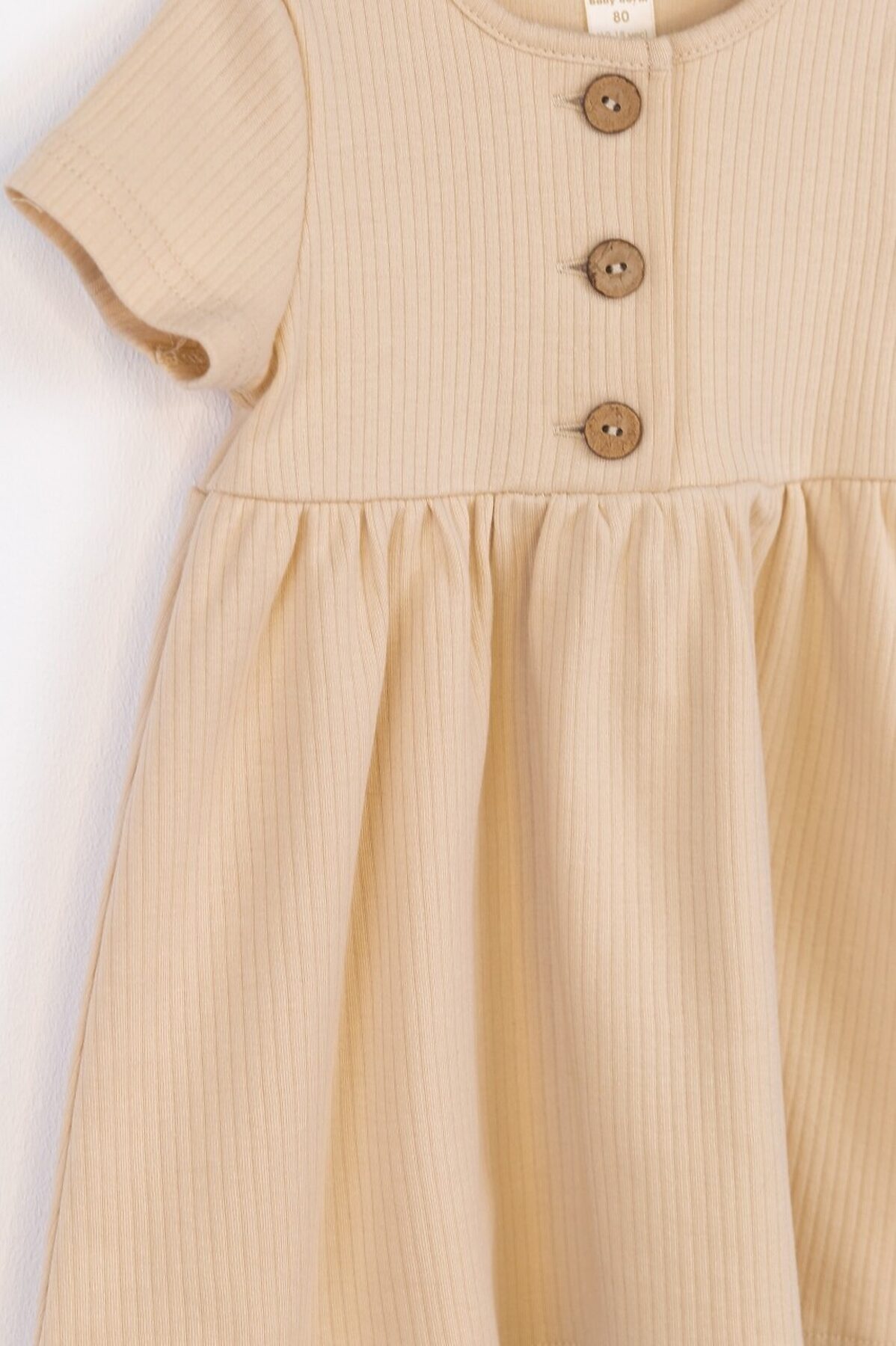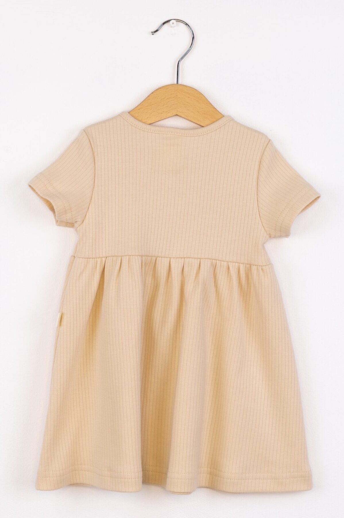 Милое платье из интерлока с выставом (100% хлопок) с коротким рукавом. Отрезная кокетка с застежкой на кокосовых пуговицах по переду, что придает образу особый шарм и теплоту.
