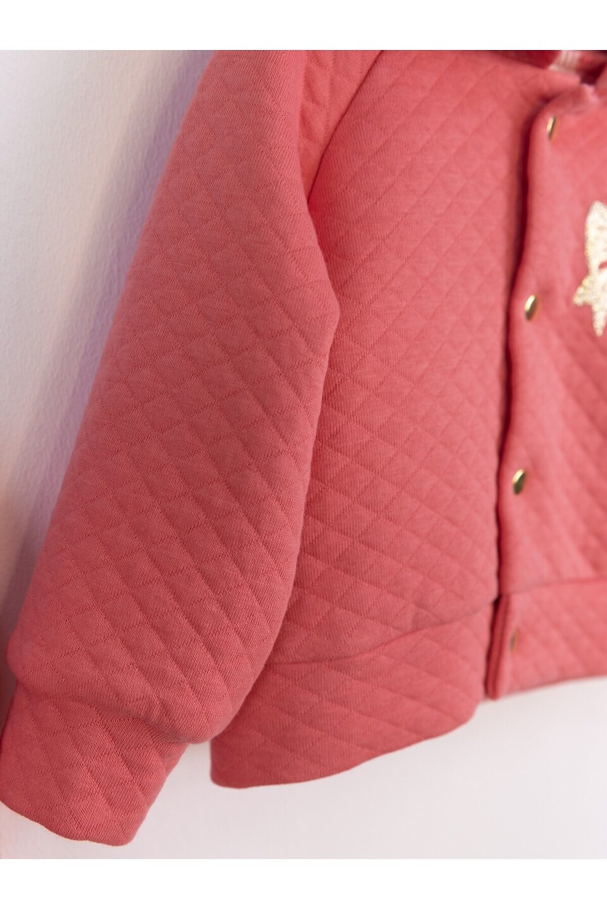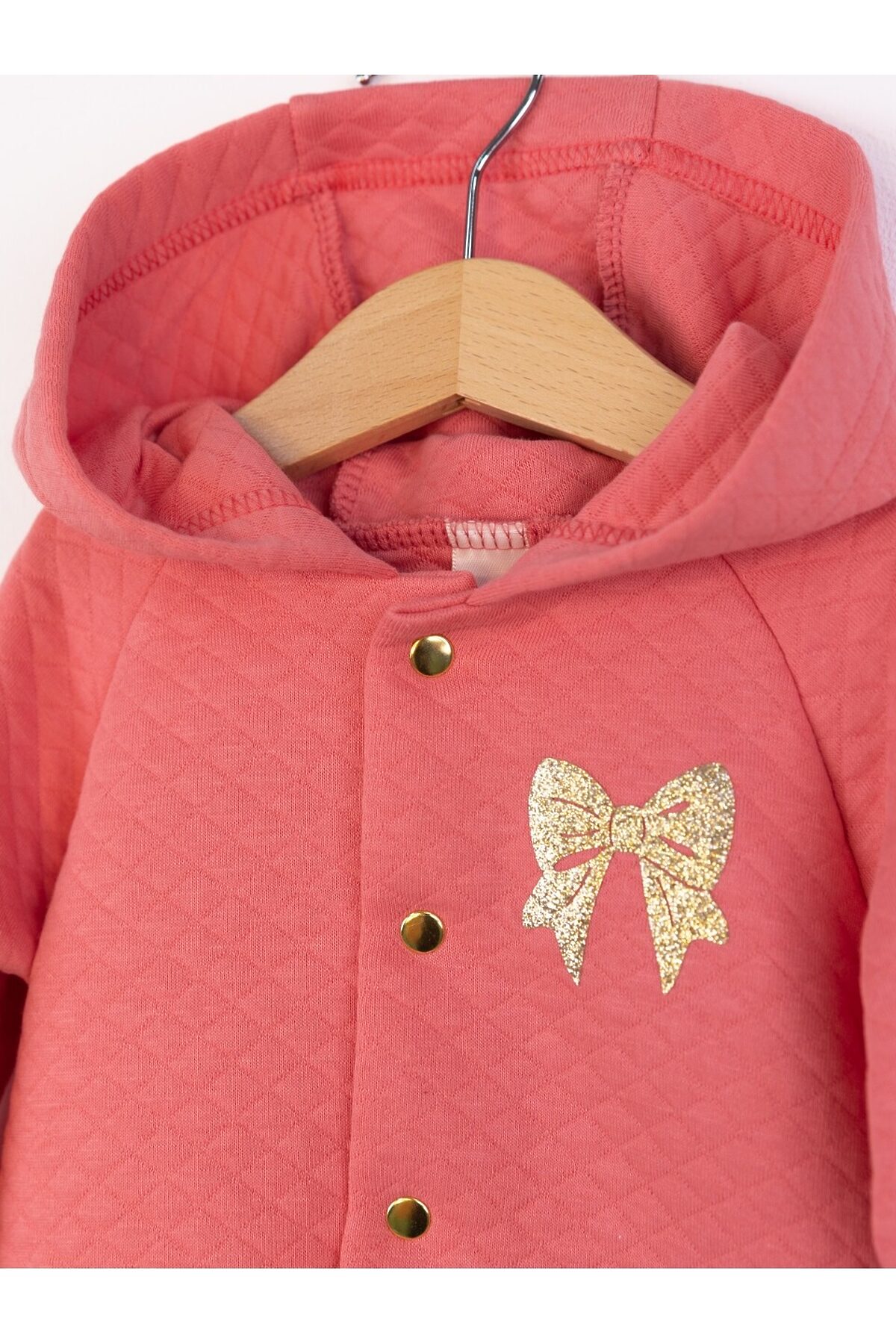Теплый комплект из кофточки с капюшоном на кнопках и брючек. На левой детали переда кофточки аппликация. Выполнен из однотонного капитона (100% хлопок).