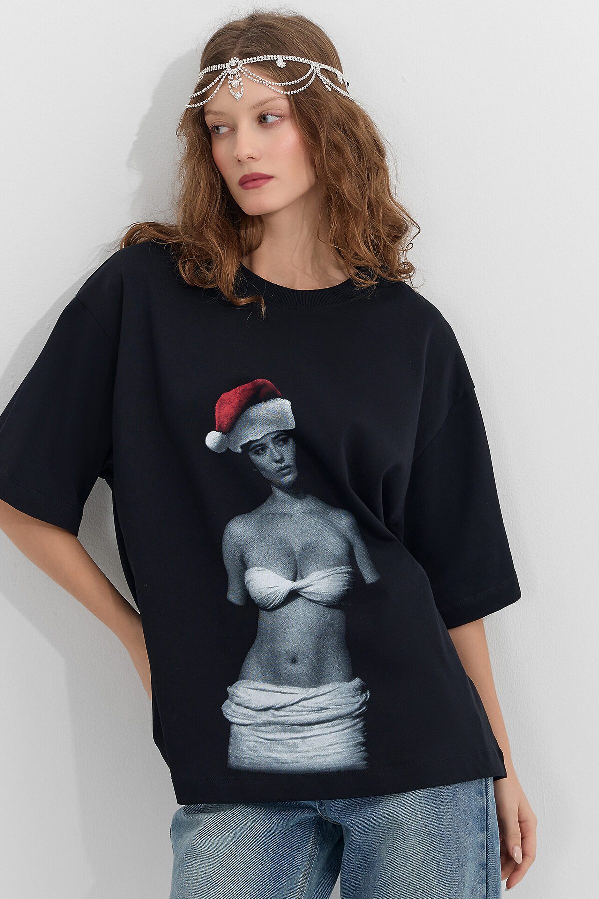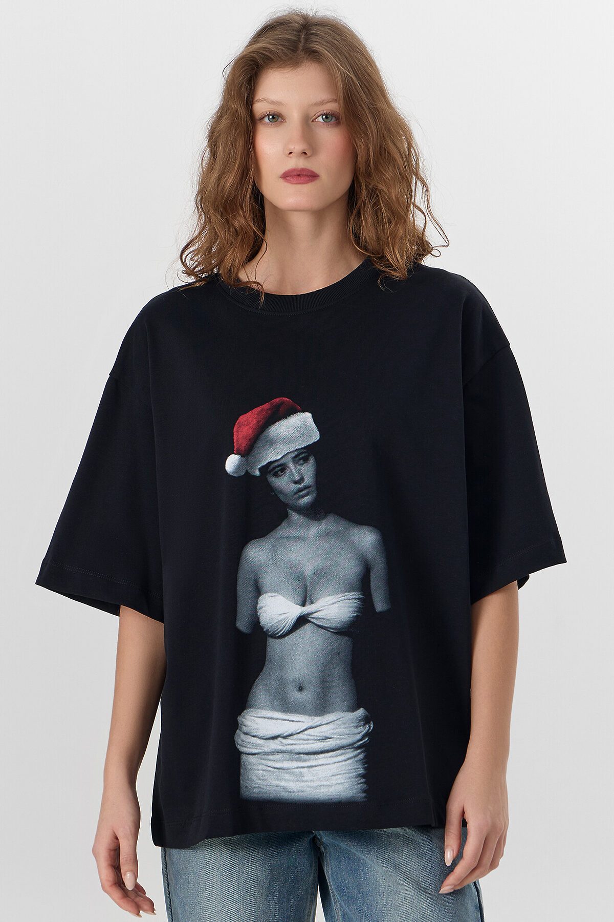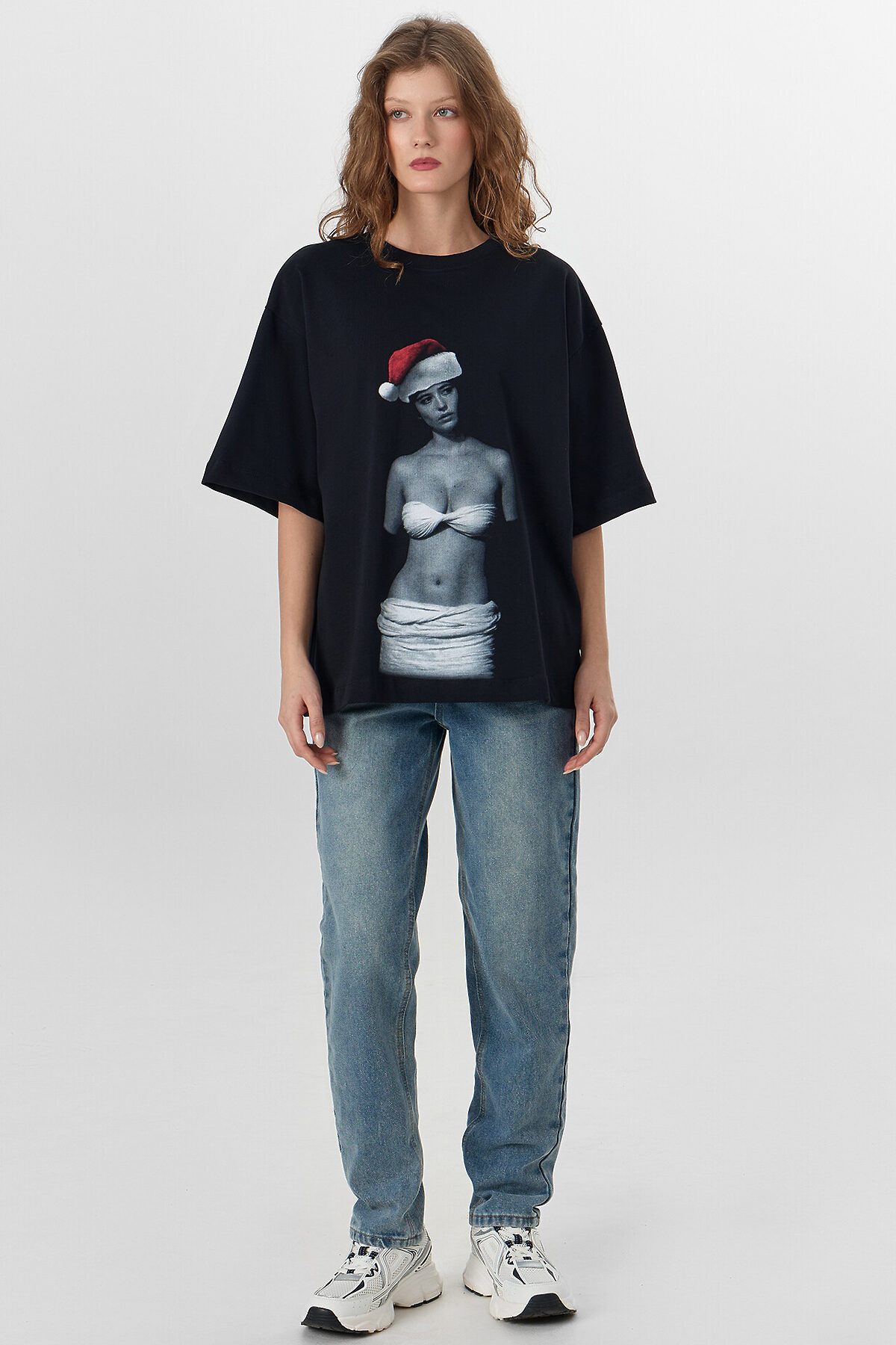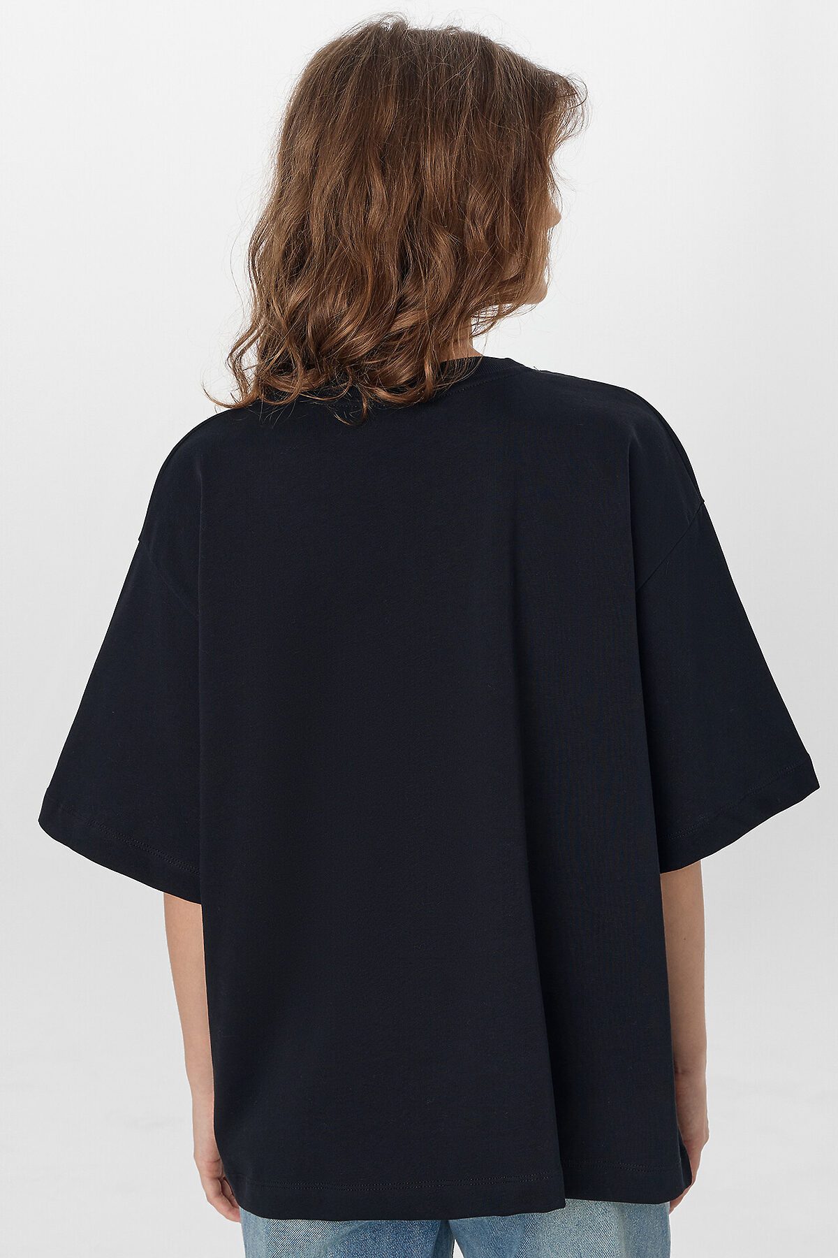 Футболка изготовлена из трикотажного полотна кулирка. Футболка свободная, оверсайз. Горловина округлой формы обработана обтачкой из рибаны. Шов втачивания обтачки по спинке закрыт тесьмой хб 10мм.Рукава втачные, корткие. Линия плеча спущена. Нижние срезы футболки и рукавов обработаны швом вподгибку.