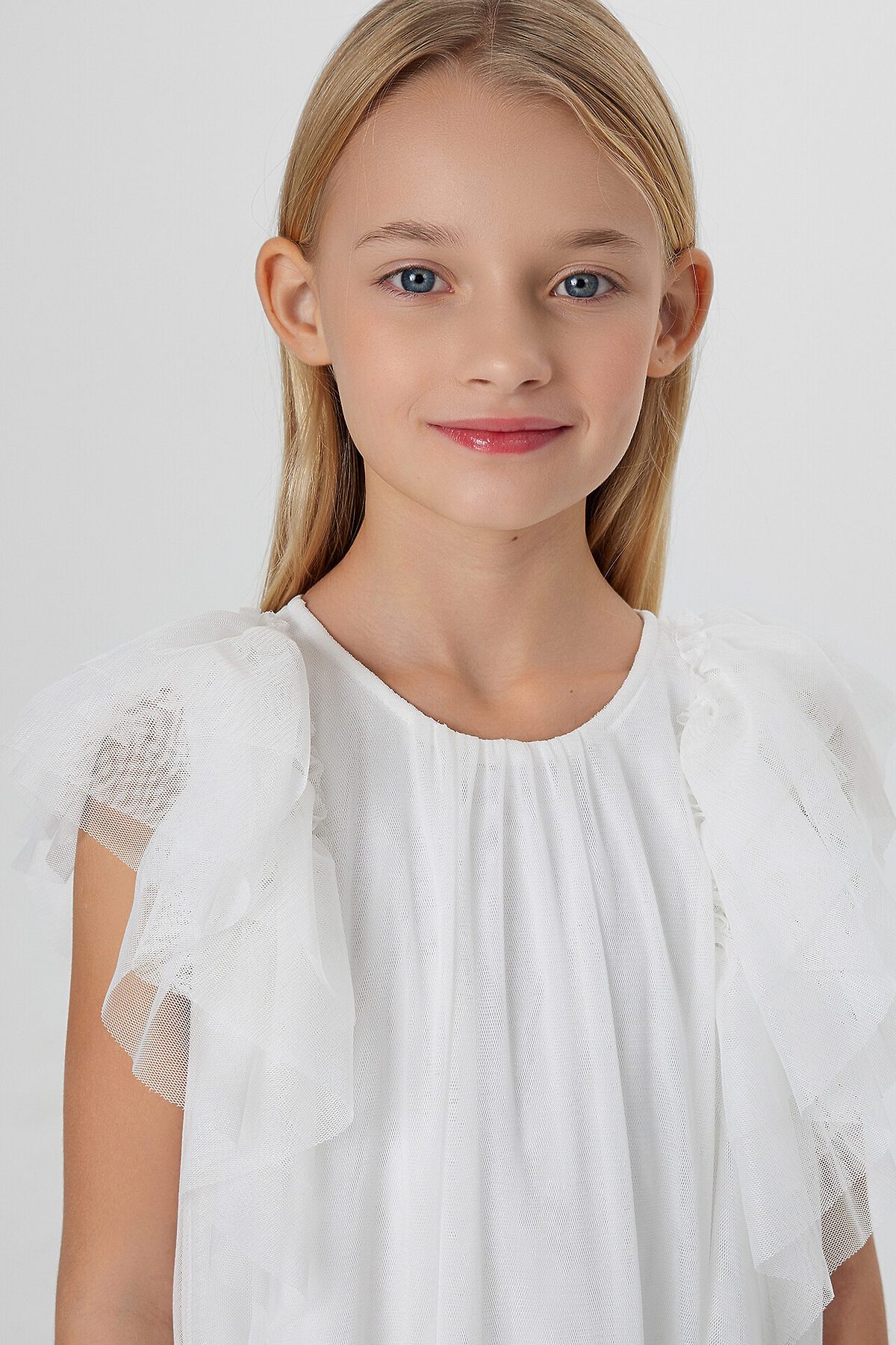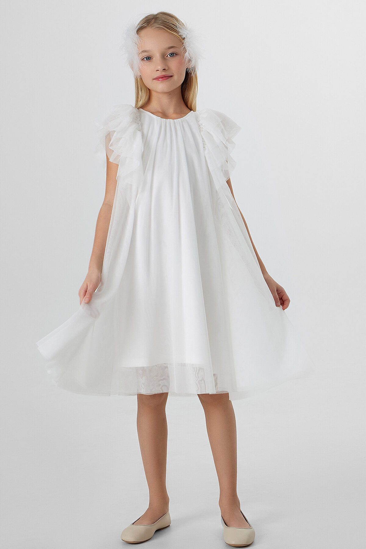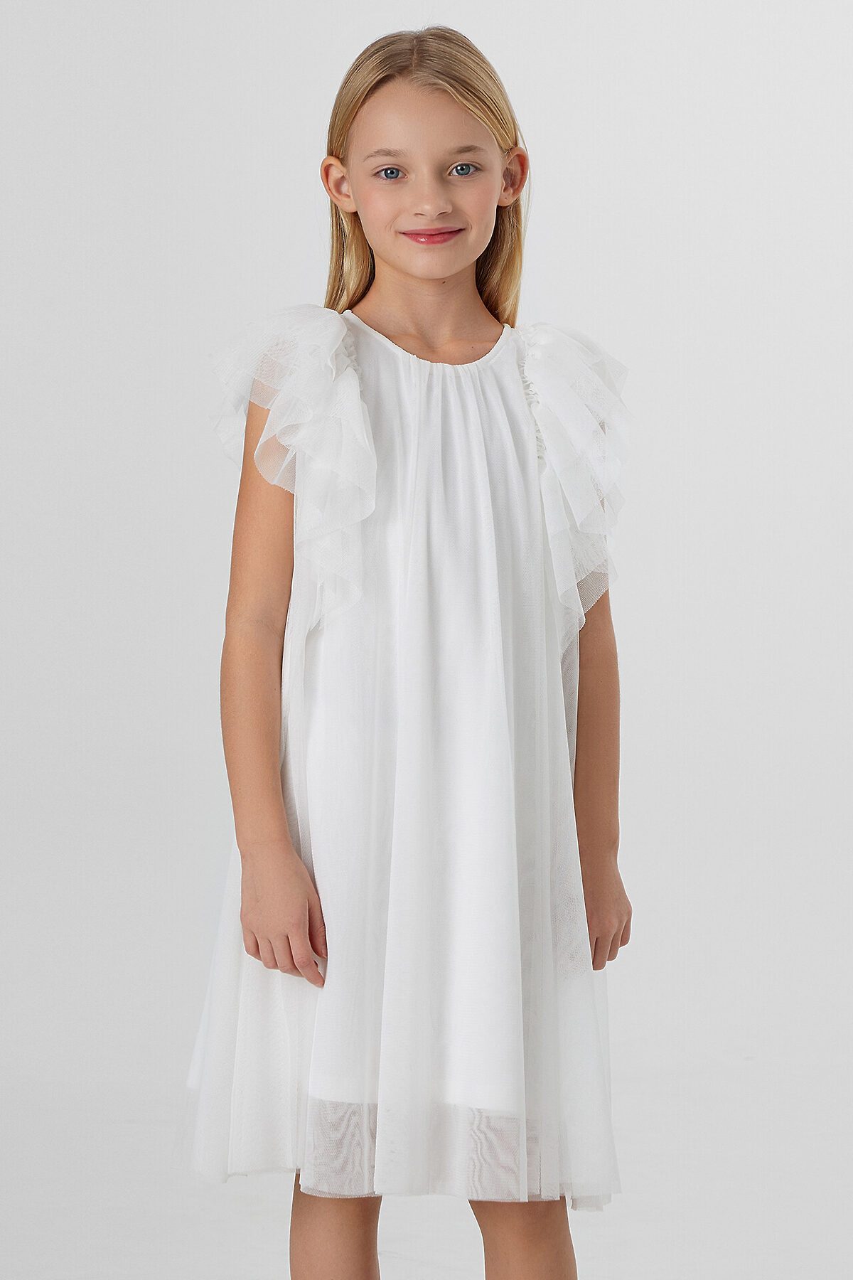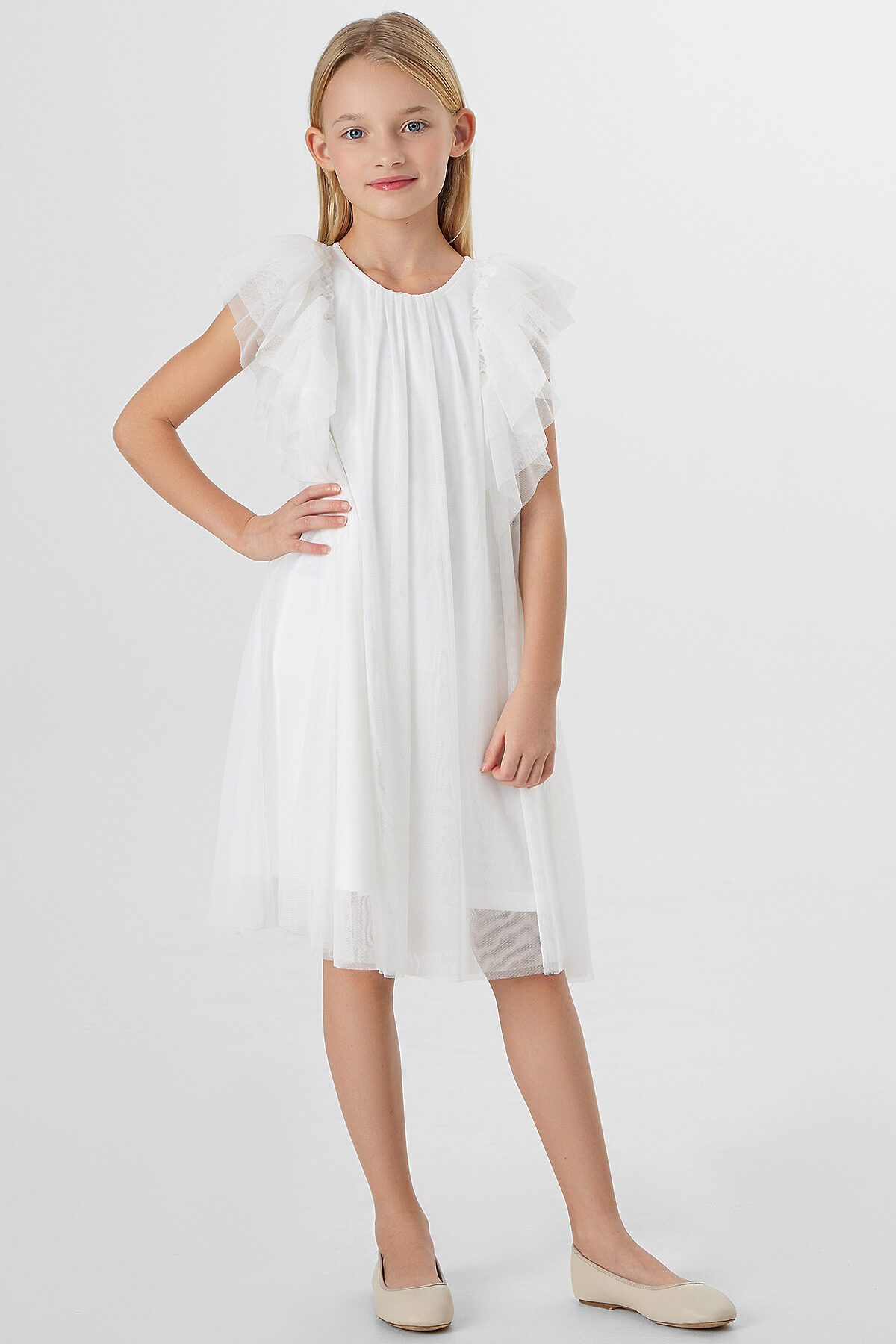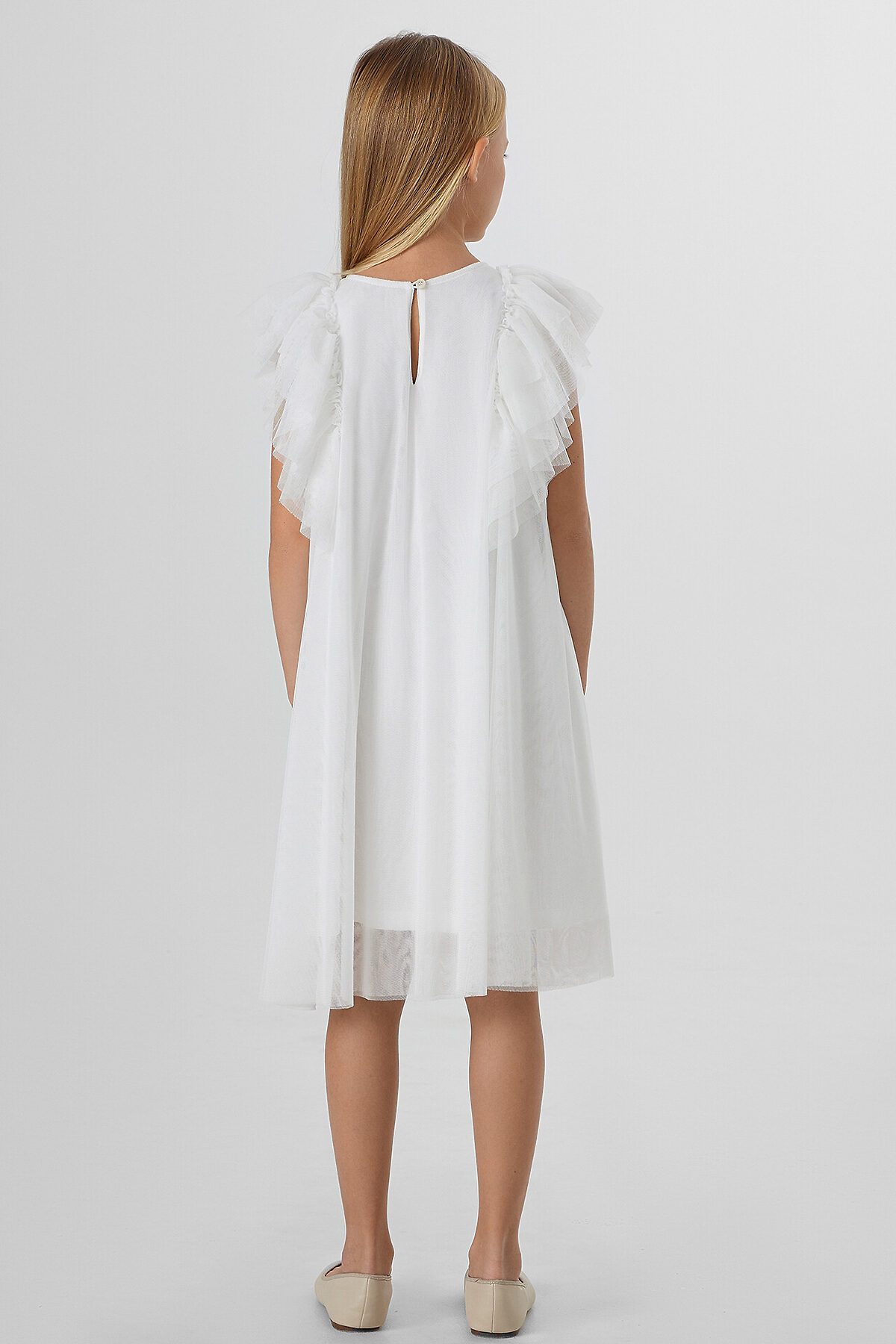 Нарядное платье для девочки создано для особенных праздничных моментов. Модель А-силуэта, где перед и спинка выполнены из единого отрезка ткани без швов на талии, мягко облегает фигуру и обеспечивает комфорт в движении. Круглый вырез горловины и застежка на пуговице сзади обеспечивают удобство надевания.