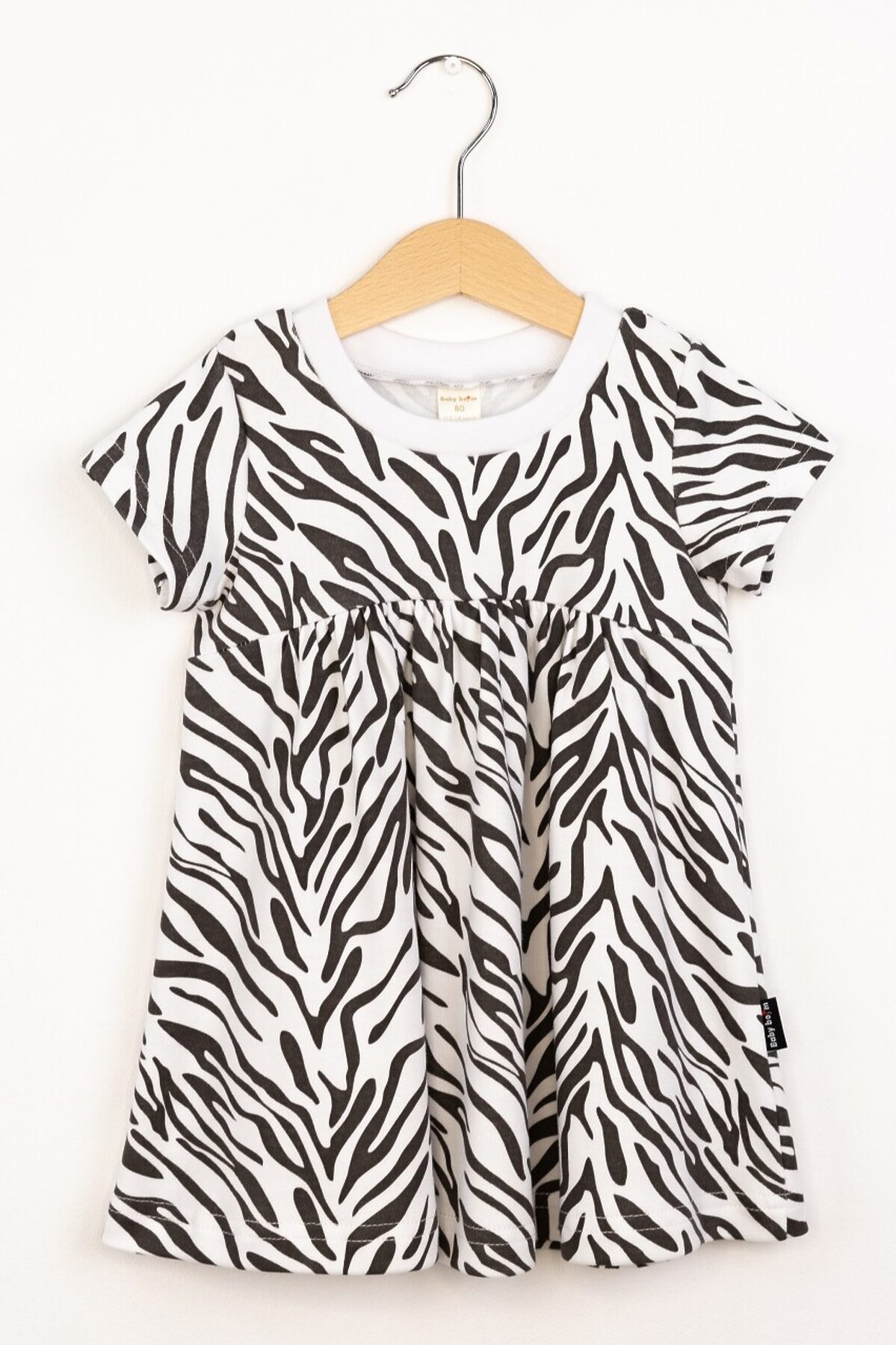 Повседневное платье с коротким рукавчиком и изогнутой отрезной линией талии. Выполнено из набивного интерлока (100% хлопок).