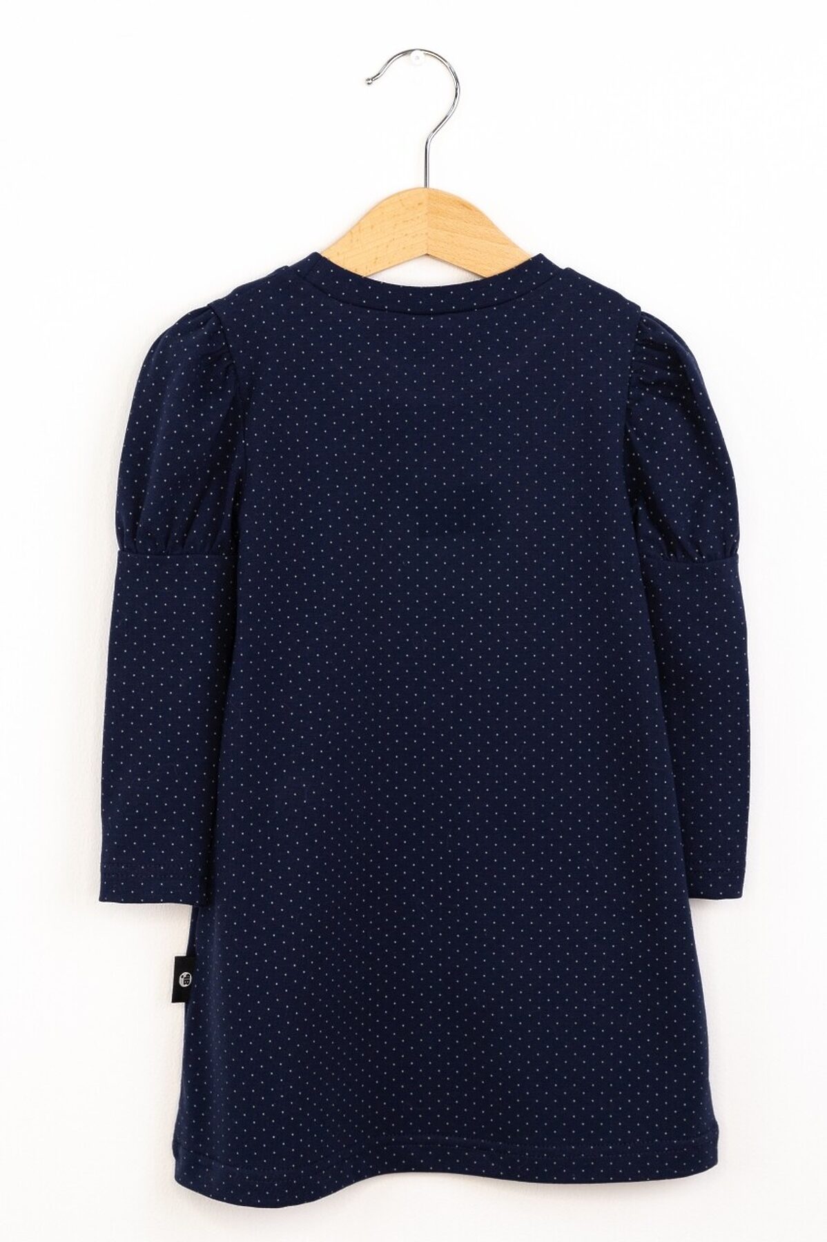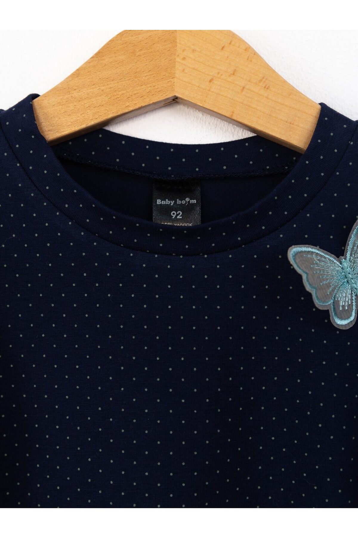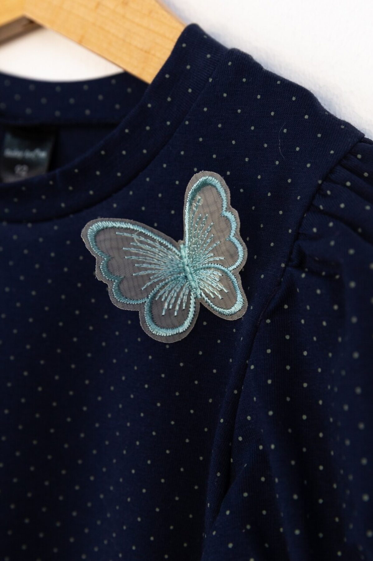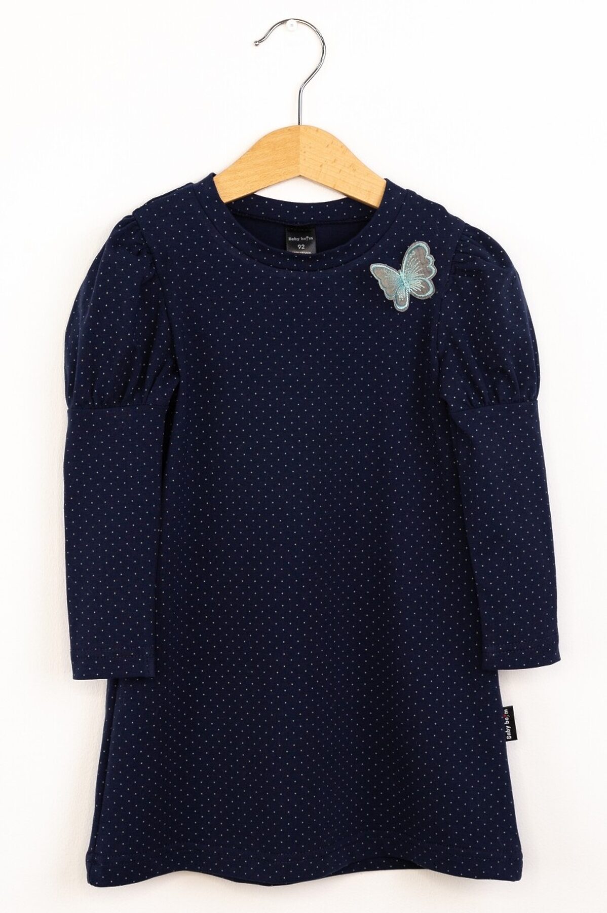 Романтичное платье с длинным рукавом-буфом, украшено вышитой бабочкой из органзы. Выполнено из кулирки (95% хлопок, 5% эластан)