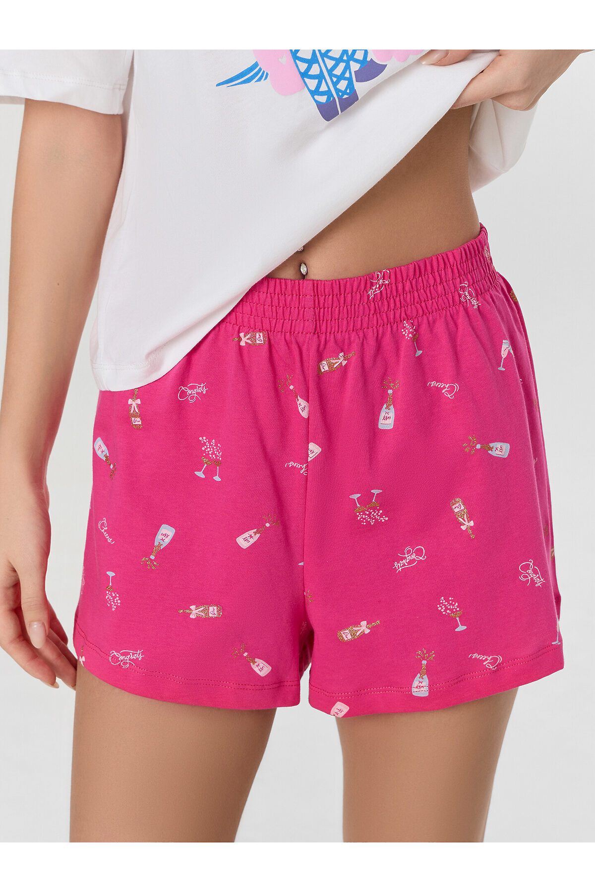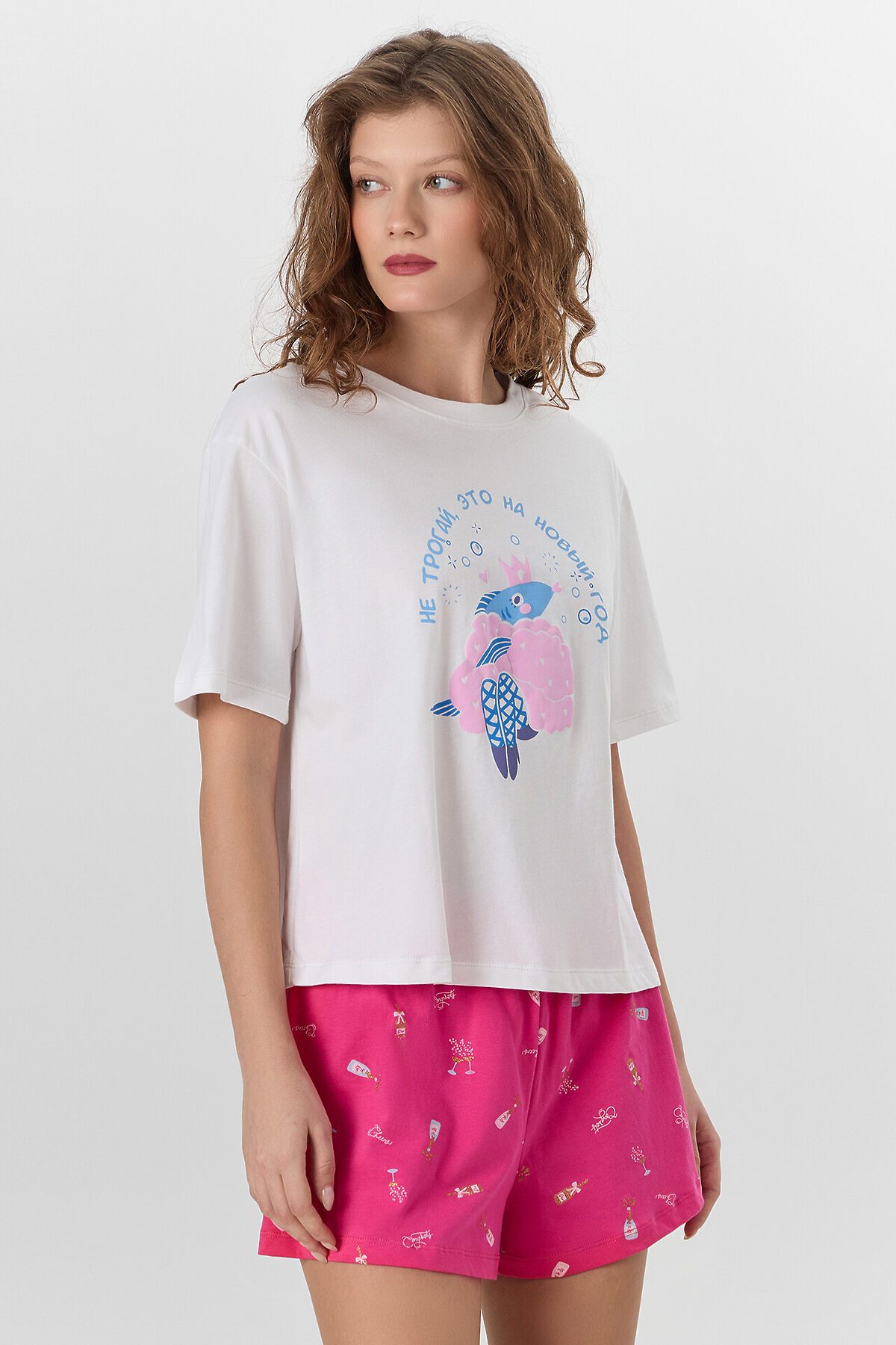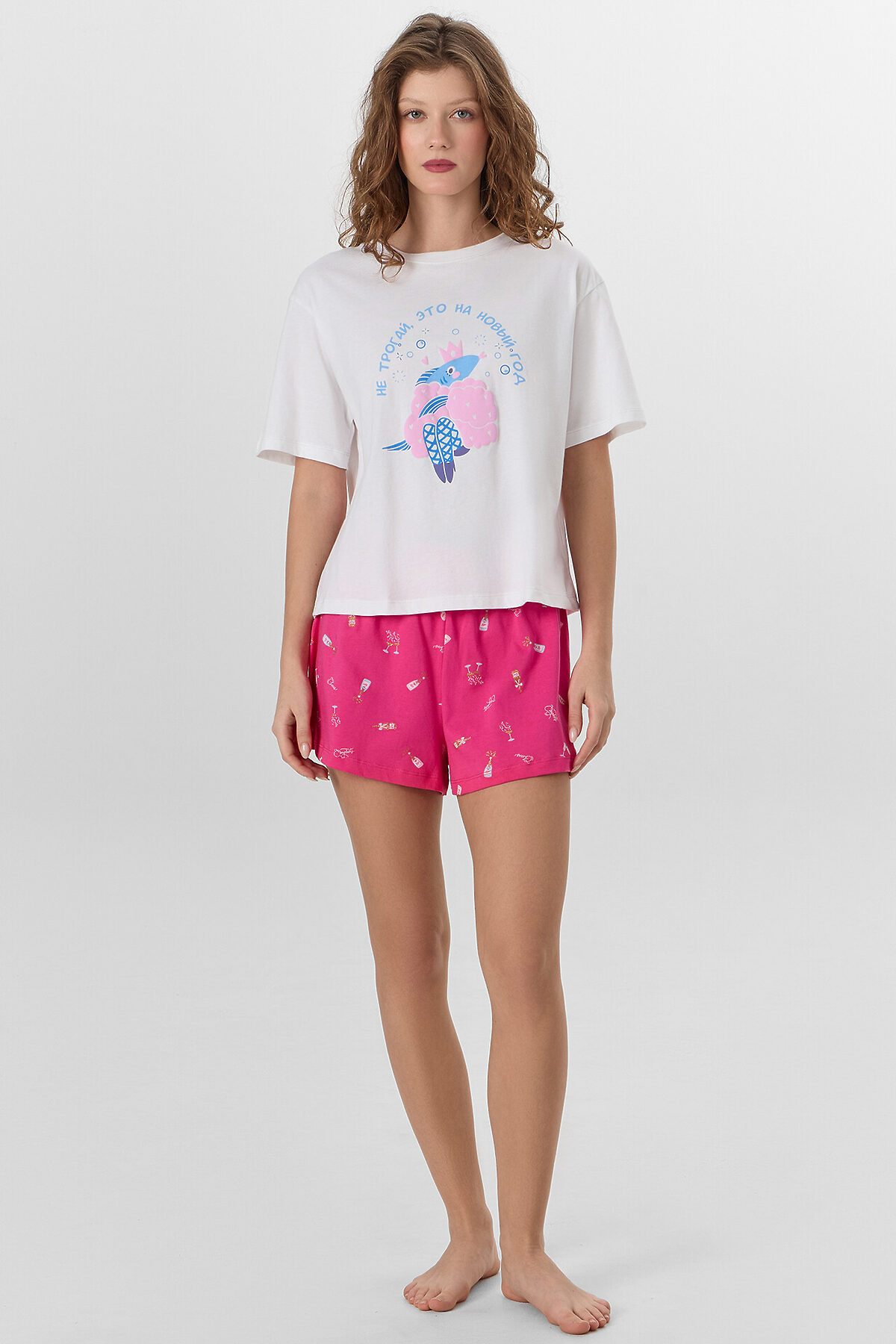 Женская пижама, состоящая из футболки и шорт, выполнена из натурального хлопка — дышащего, мягкого и приятного к телу материала, идеально подходящего для комфортного сна и отдыха. Натуральная ткань обеспечивает хорошую воздухопроницаемость и не вызывает раздражения, что особенно важно для чувствительной кожи. Футболка свободного силуэта с круглой горловиной и слегка спущенной линией плеча создает расслабленный и уютный образ. Свободные рукава не ограничивают движения, а аккуратная обработка низа рукавов и самого изделия швом вподгибку подчеркивает качество пошива и делает модель визуально завершенной. Шорты короткие, свободного кроя, с эластичным поясом, который обеспечивает комфортную посадку без давления. Низ шорт также обработан швом вподгибку, что придает изделию аккуратный вид. Пижама идеально подойдет для домашнего отдыха, сна или уютных вечеров, сочетая в себе легкость, комфорт и лаконичный стиль.