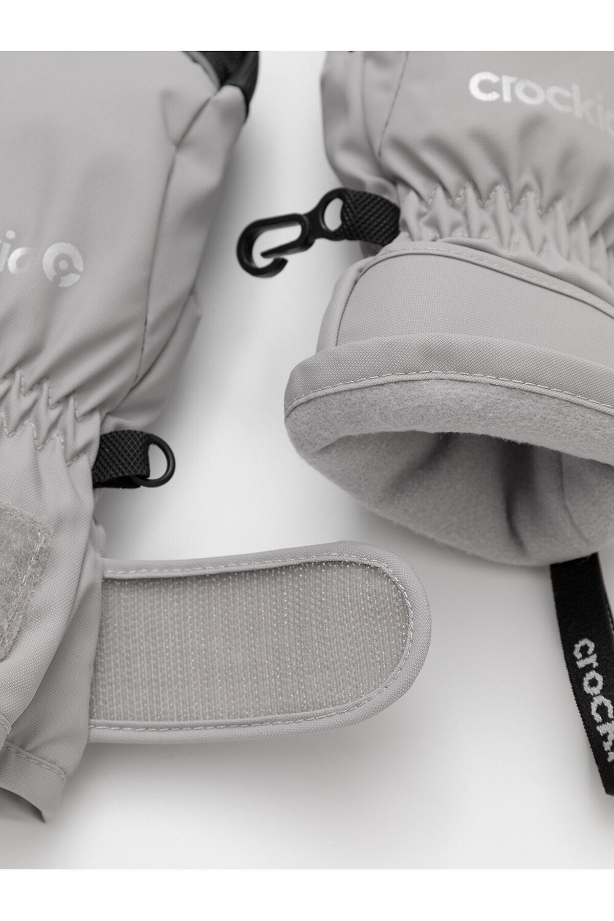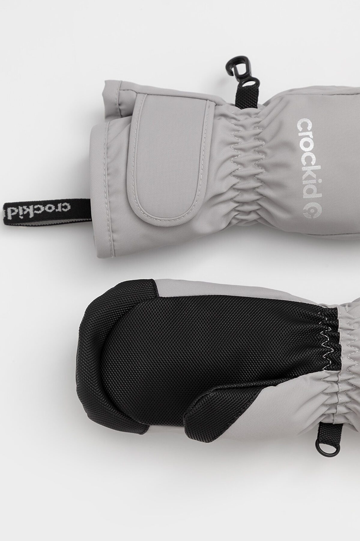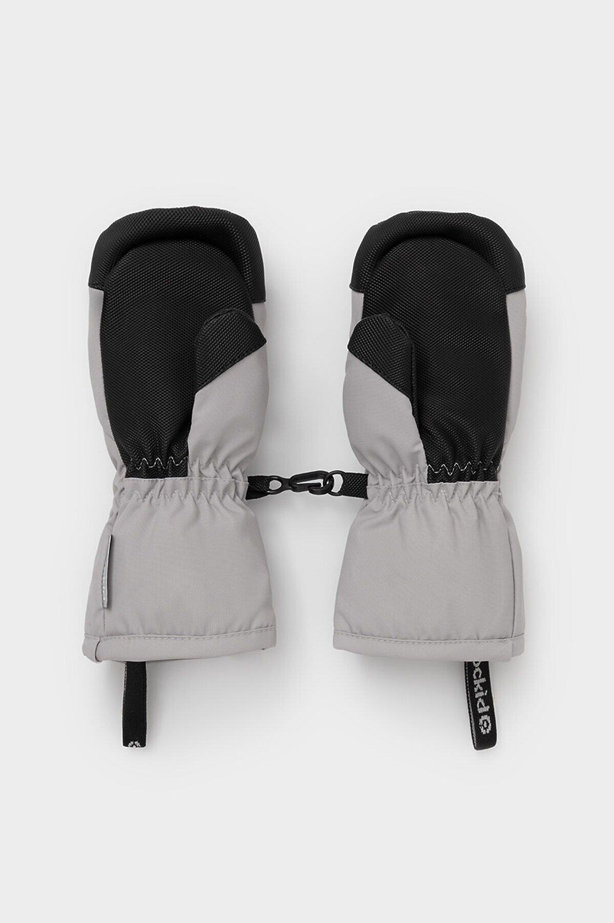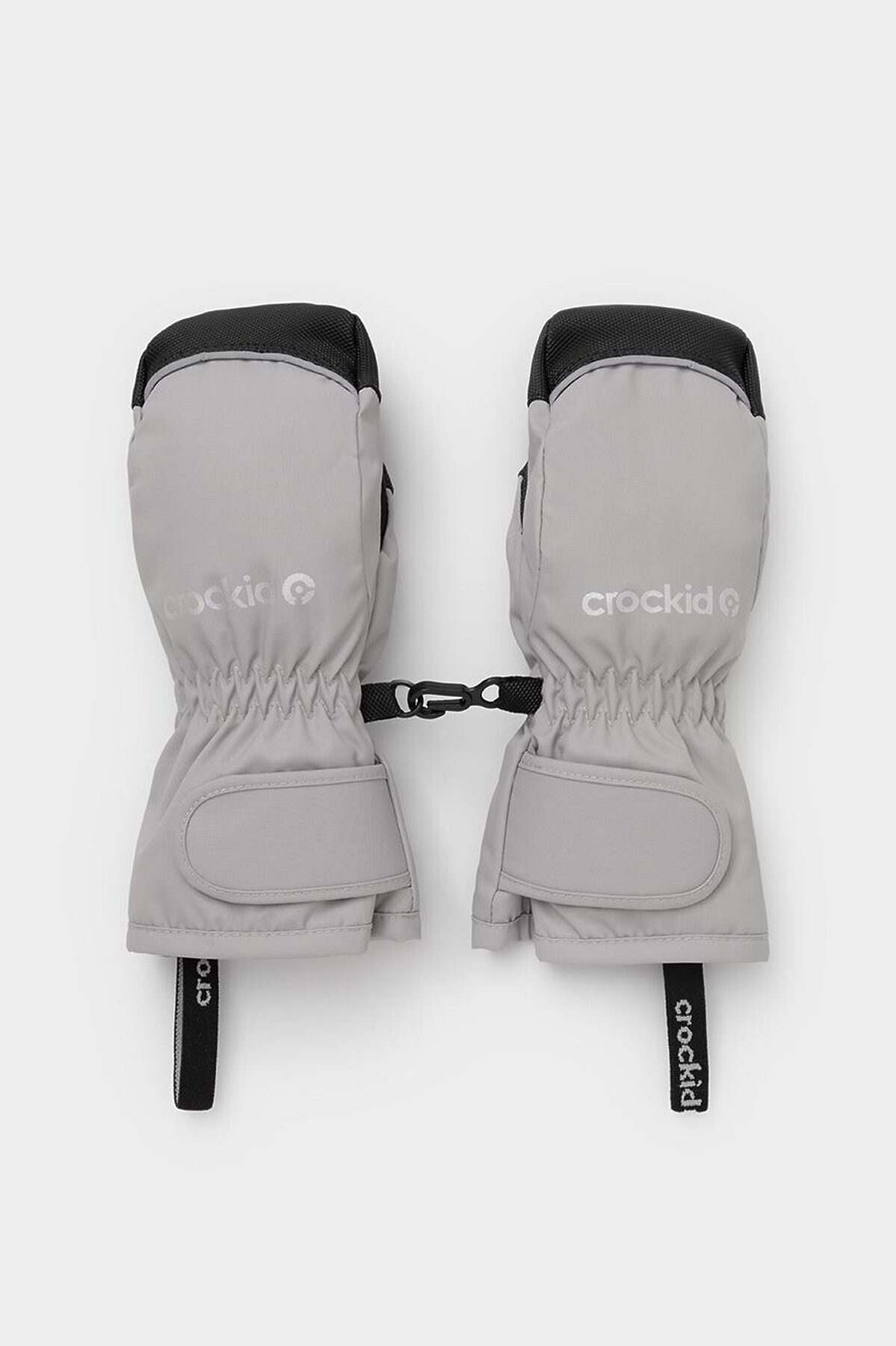 Детские утеплённые рукавицы из однотонной мембранной ткани со вставками из искусственной кожи. Удлинённые манжеты на молнии. Мягкий подклад из флиса. Пластиковый карабин для скрепления рукавиц между собой. Светоотражающие элементы.