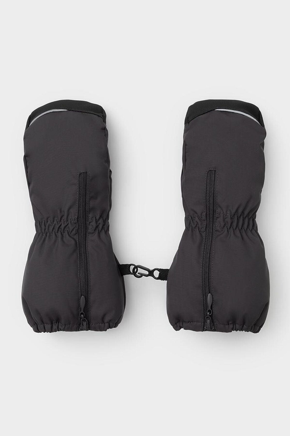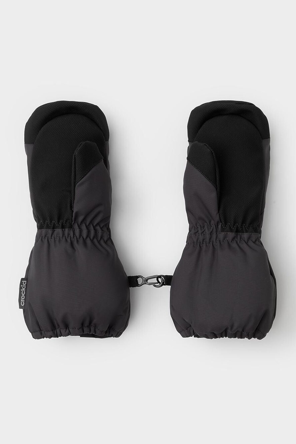 Детские утеплённые рукавицы из однотонной мембранной ткани со вставками из искусственной кожи. Удлинённые манжеты на молнии. Мягкий подклад из флиса. Пластиковый карабин для скрепления рукавиц между собой. Светоотражающие элементы.
