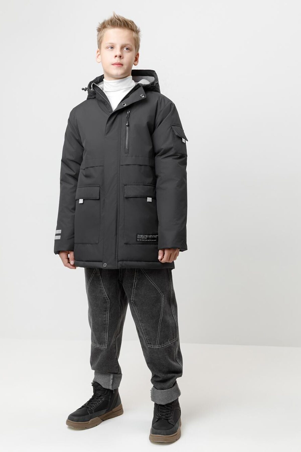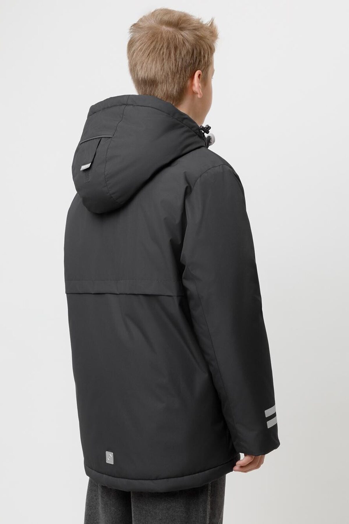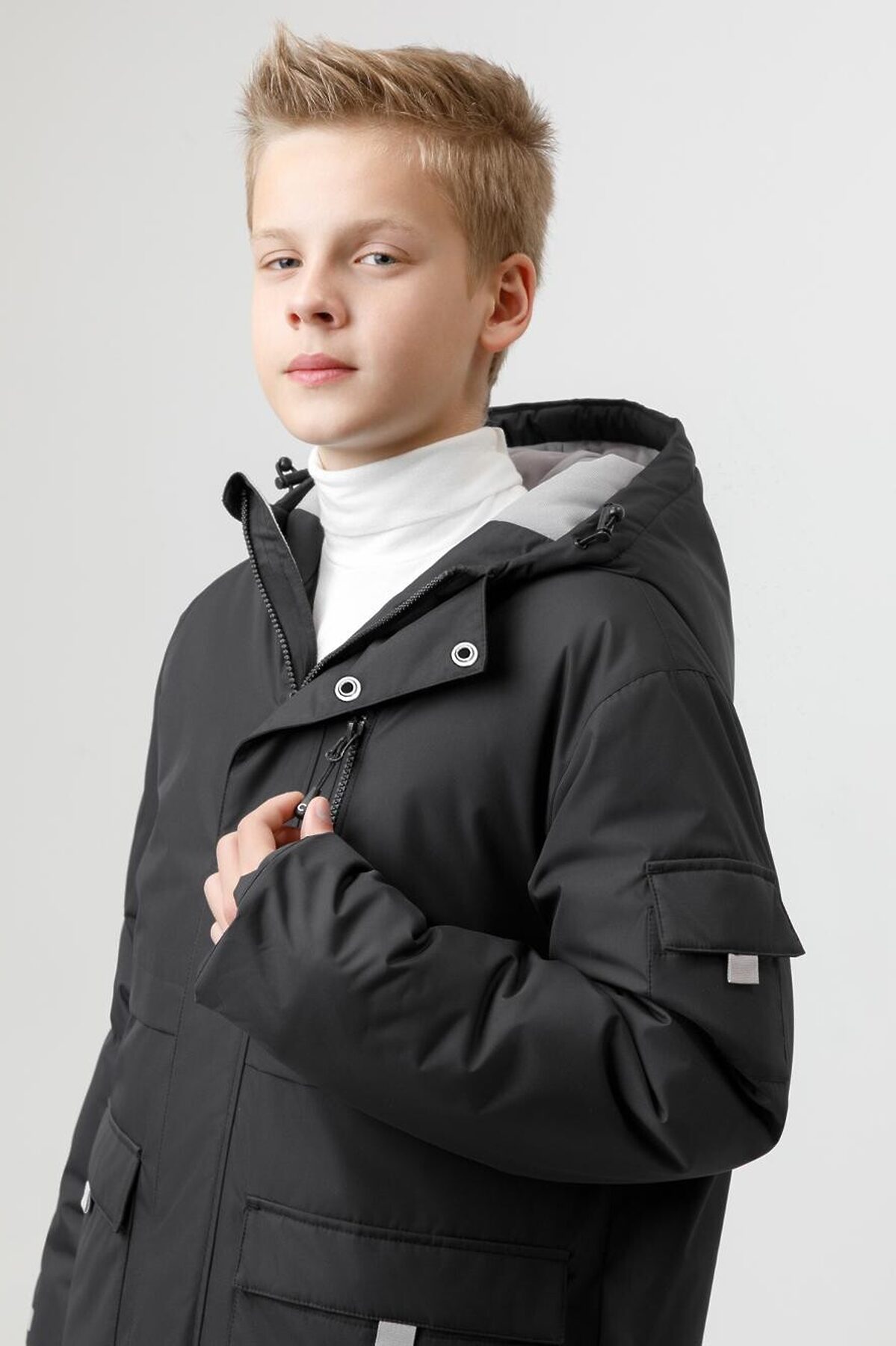 Зимняя куртка для мальчика с утеплителем SEE®: 250 г/м2. Выполнена из мембранной ткани с дополнительной тефлоновой обработкой, которая предохраняет изделие от загрязнений и отталкивает влагу. Подклад выполнен из 100% полиэстера Tricot. Куртка застёгивается на молнию и на дополнительную планку с кнопками. У изделия предусмотрена защита подбородка. Несъёмный капюшон имеет эластичную утяжку со стопперами, глубина капюшона регулируется при помощи липучки. На рукавах внутренние эластичные манжеты. Два накладных кармана с клапанами по бокам и один карман на груди. Во всех изделиях верхнего ассортимента для безопасности ребёнка предусмотрены светоотражающие элементы.