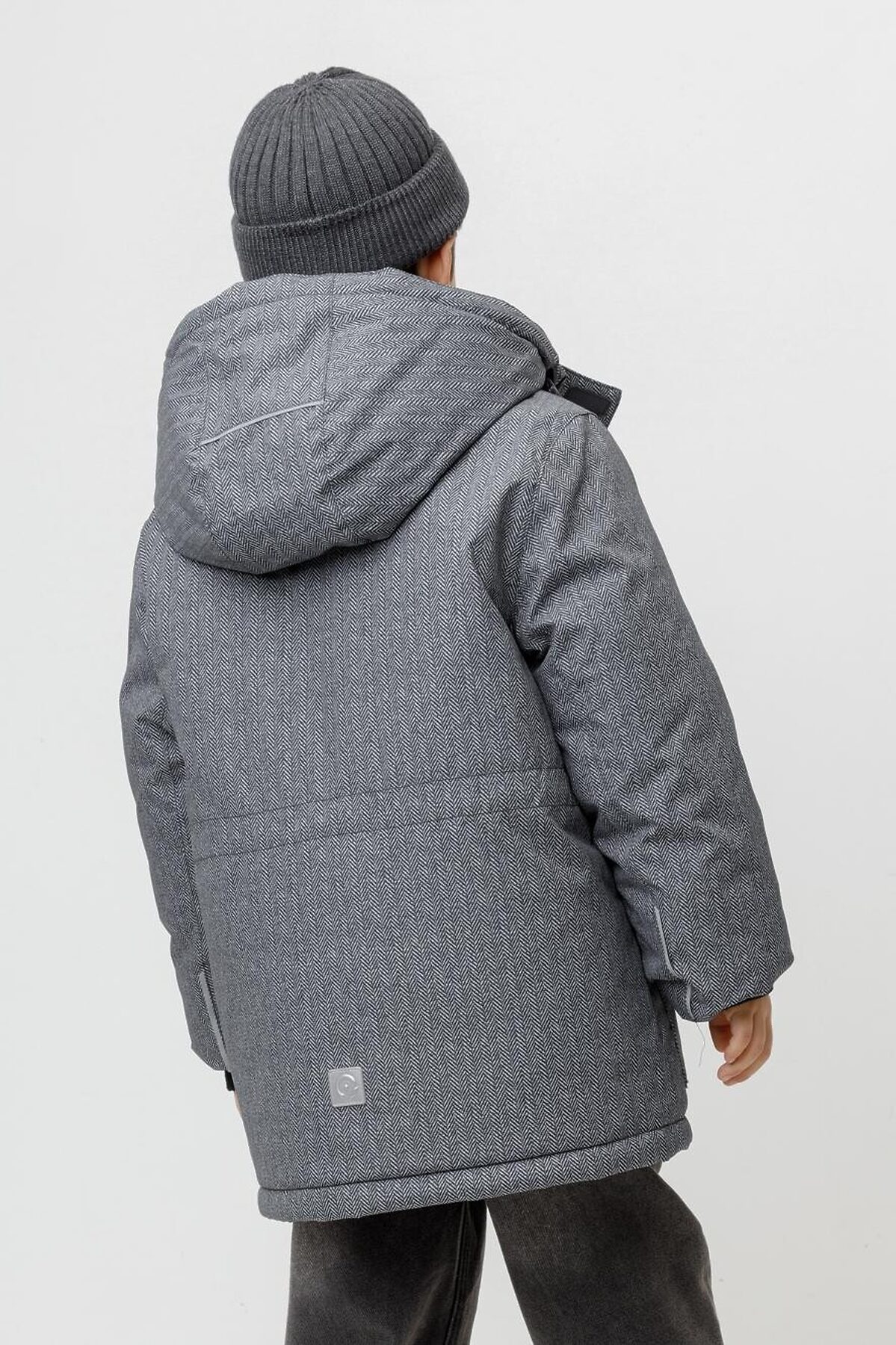 Зимняя куртка для мальчика с утеплителем SEE®: 300 г/м2. Выполнена из мембранной ткани с дополнительной тефлоновой обработкой, которая предохраняет изделие от загрязнений и отталкивает влагу. Подклад выполнен из 100% полиэстера Tricot. Куртка застёгивается на молнию и внешнюю планку с магнитными кнопками, предусмотрена защита подбородка. Съёмный капюшон на кнопках и липучках имеет эластичную утяжку со стопперами. На рукавах внутренние эластичные манжеты. Два накладных кармана с клапанами по бокам. По талии эластичная утяжка со стопперами. Во всех изделиях верхнего ассортимента для безопасности ребёнка предусмотрены светоотражающие элементы.