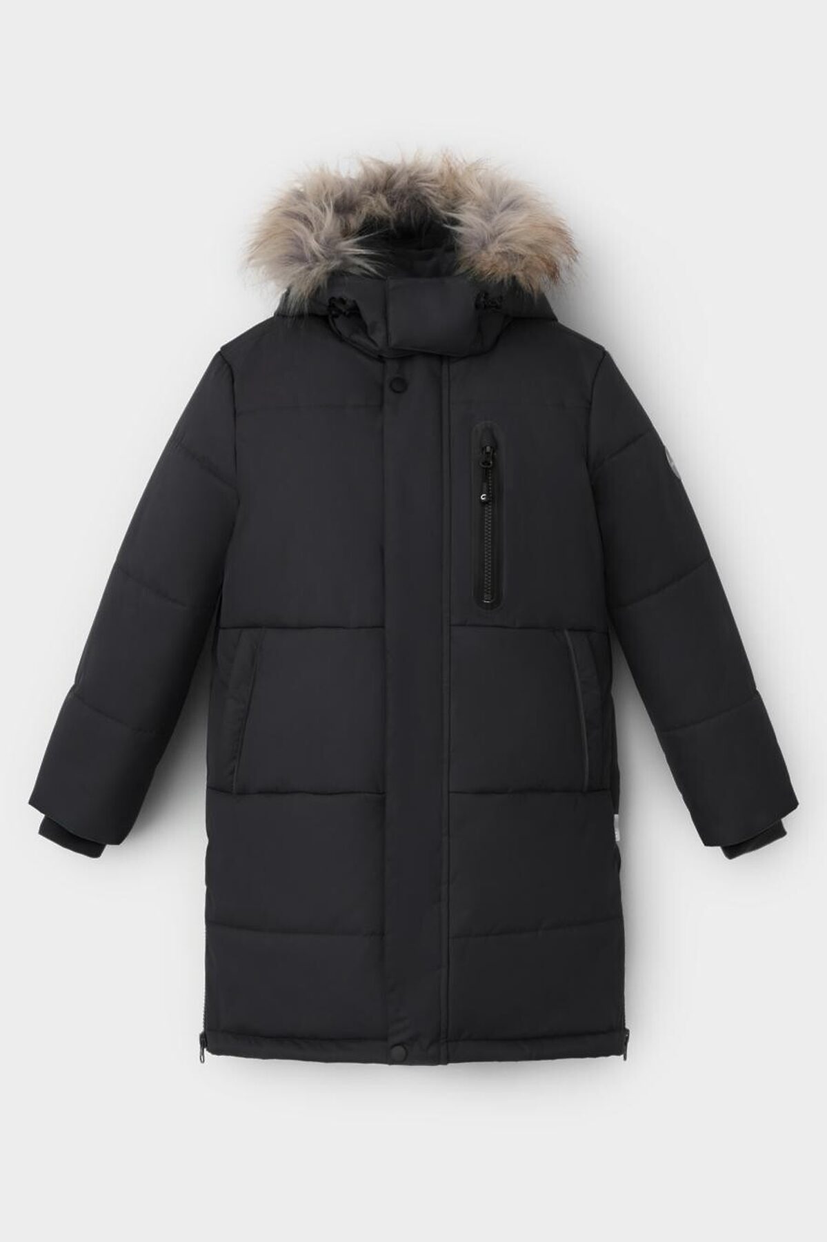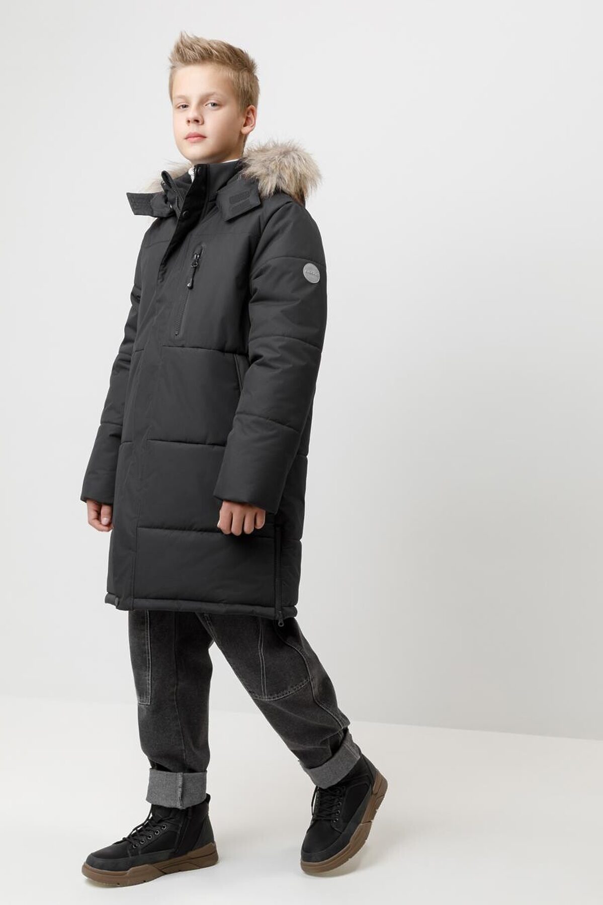 Зимнее пальто для мальчика с утеплителем SEE®: 300 г/м2. Выполнено из мембранной ткани с дополнительной тефлоновой обработкой, которая предохраняет изделие от загрязнений и отталкивает влагу. Подклад выполнен из 100% полиэстера Tricot. Пальто застёгивается на молнию и внешнюю планку с кнопками. Съёмный капюшон имеет эластичную утяжку со стопперами и отстёгивающийся мех на молнии, регулируется по глубине с помощью липучки. На рукавах внутренние эластичные манжеты. По бокам два кармана на молниях и один карман на груди. Во всех изделиях верхнего ассортимента для безопасности ребёнка предусмотрены светоотражающие элементы.