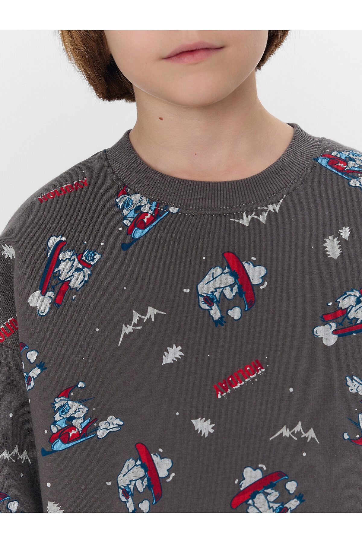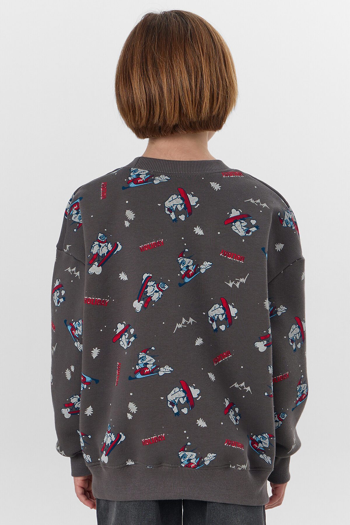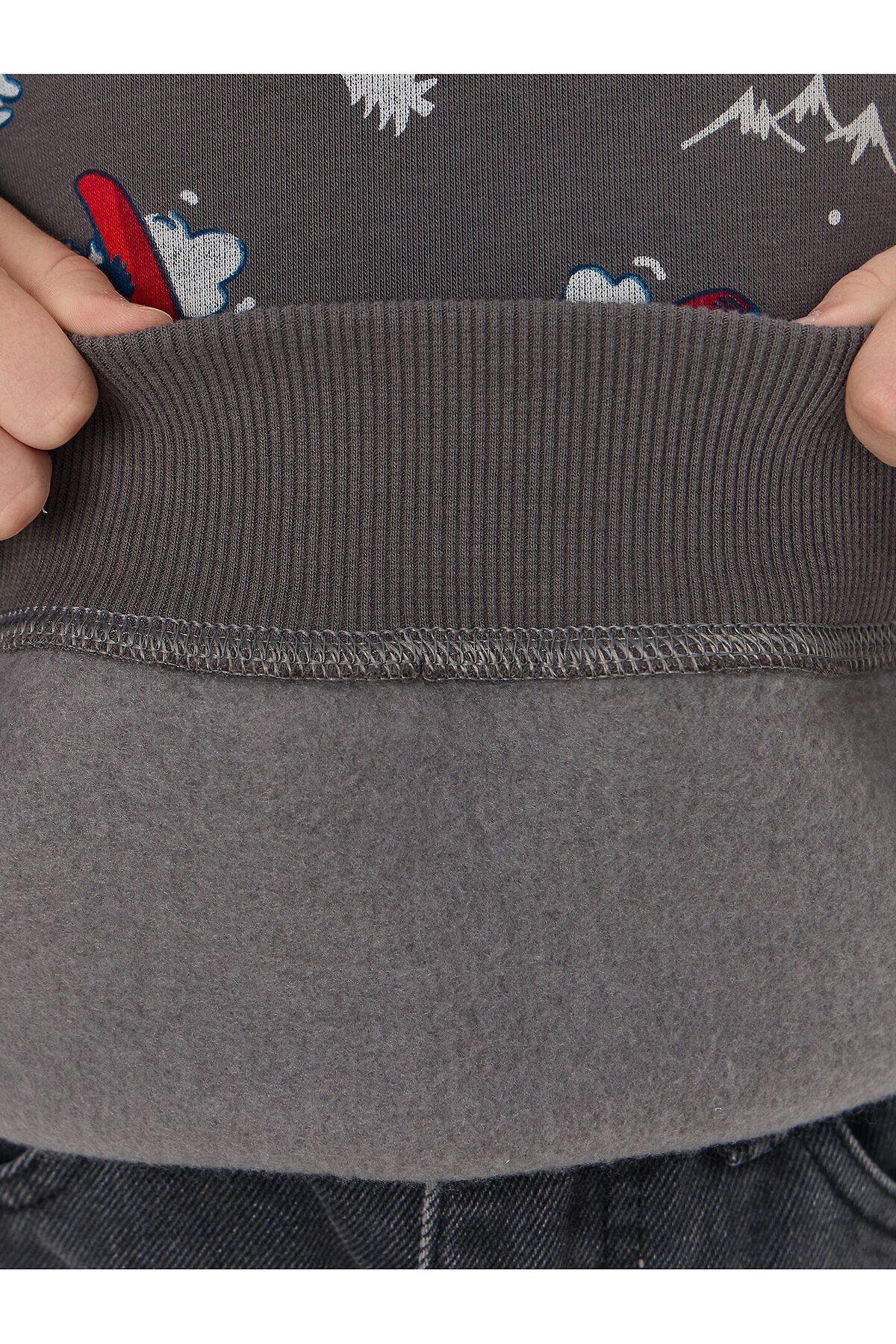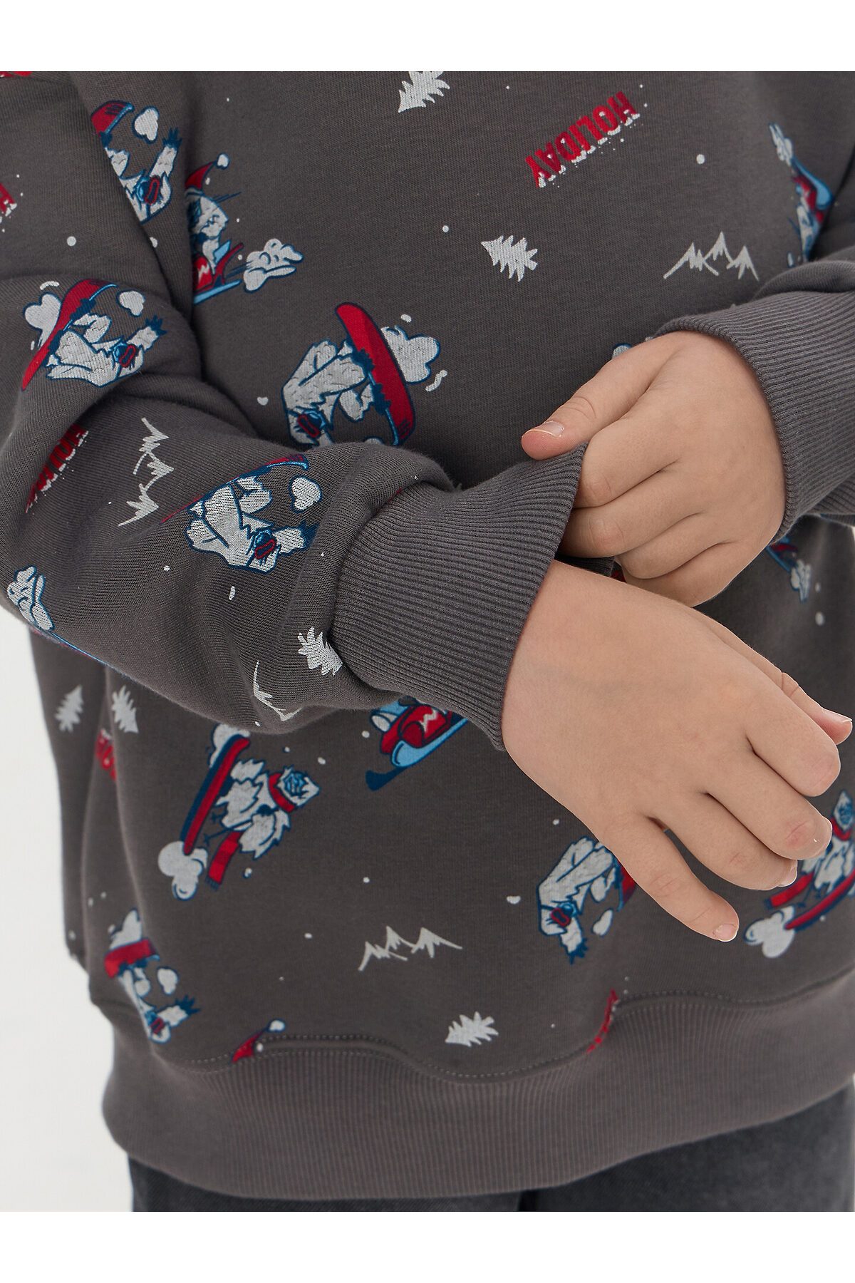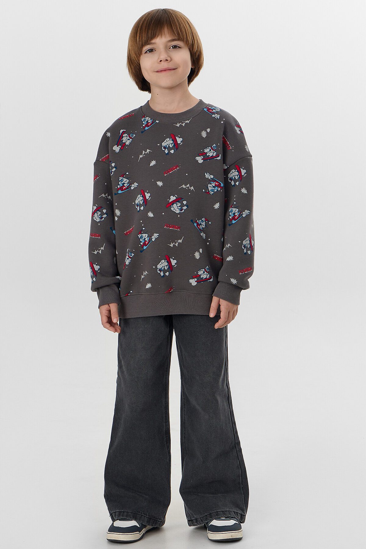 Джемпер изготовлен из футера. Джемпер свободного силуэта. Горловина округлой формы обработана обтачкой из рибаны. Рукава втачные длинные с отрезными манжетами из рибаны. По низу джемпера отрезной пояс из рибаны, отстрочен.