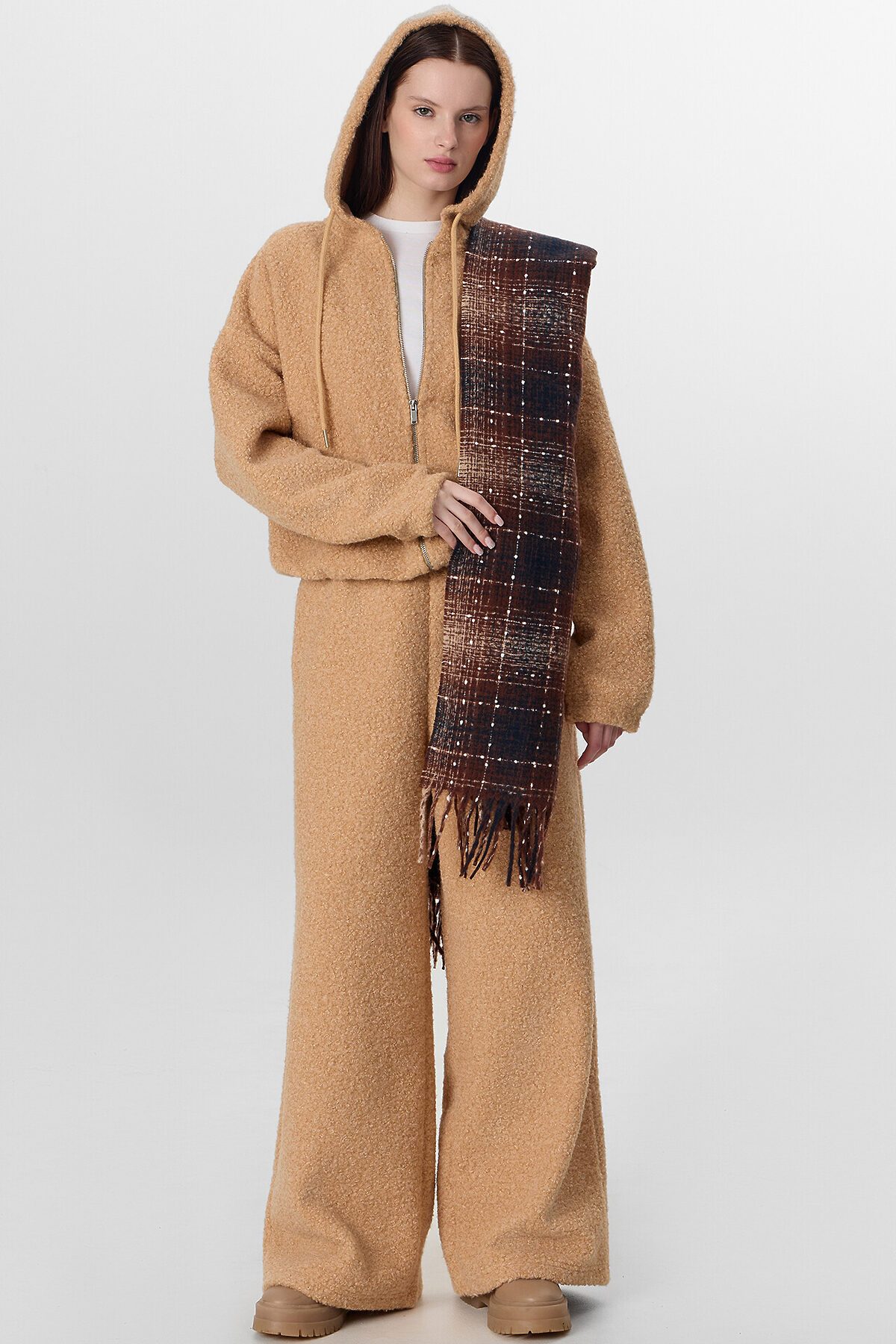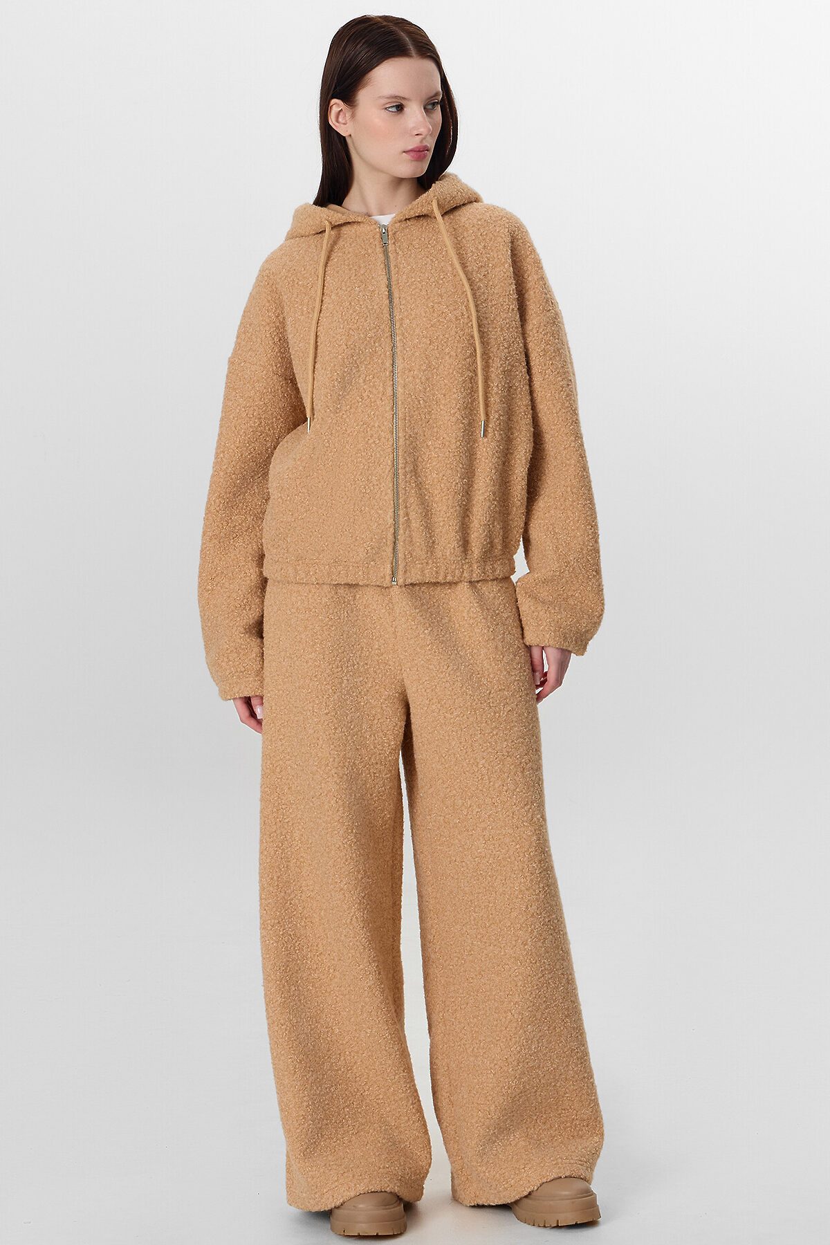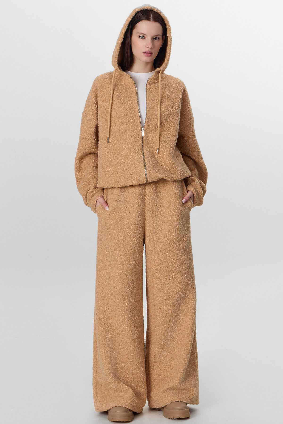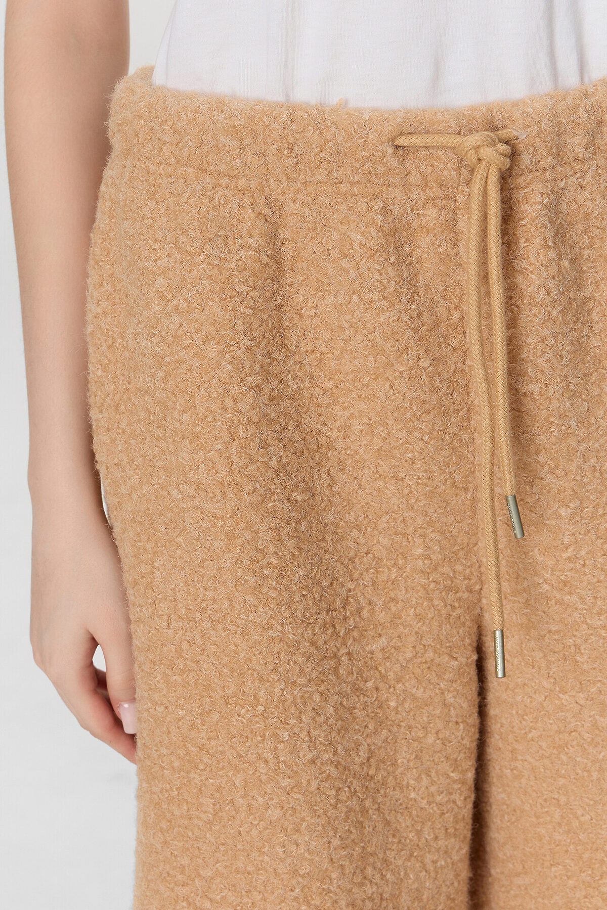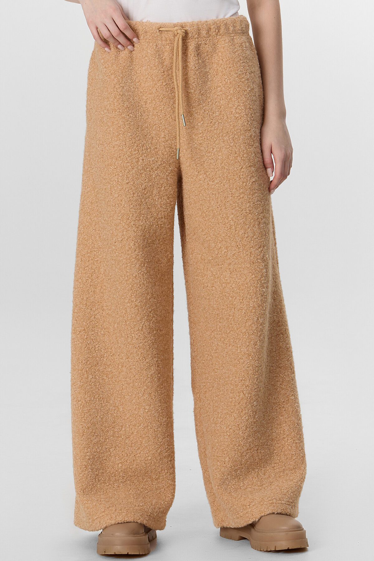 Брюки оверсайз, с цельнокроеным поясом. Внутри пояса резина 40RV и вставлен шнур с эглетом 8EKWC-1 8мм. В боковых швах карманы с кулирным полотном. Низ обработан швом вподгибку.