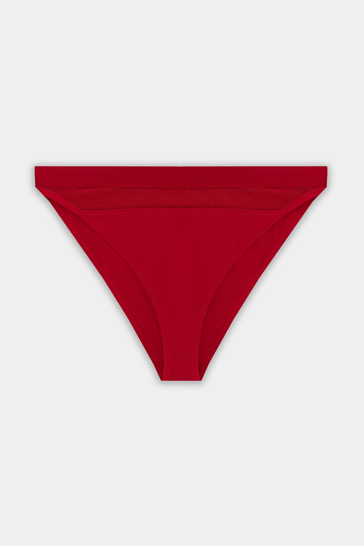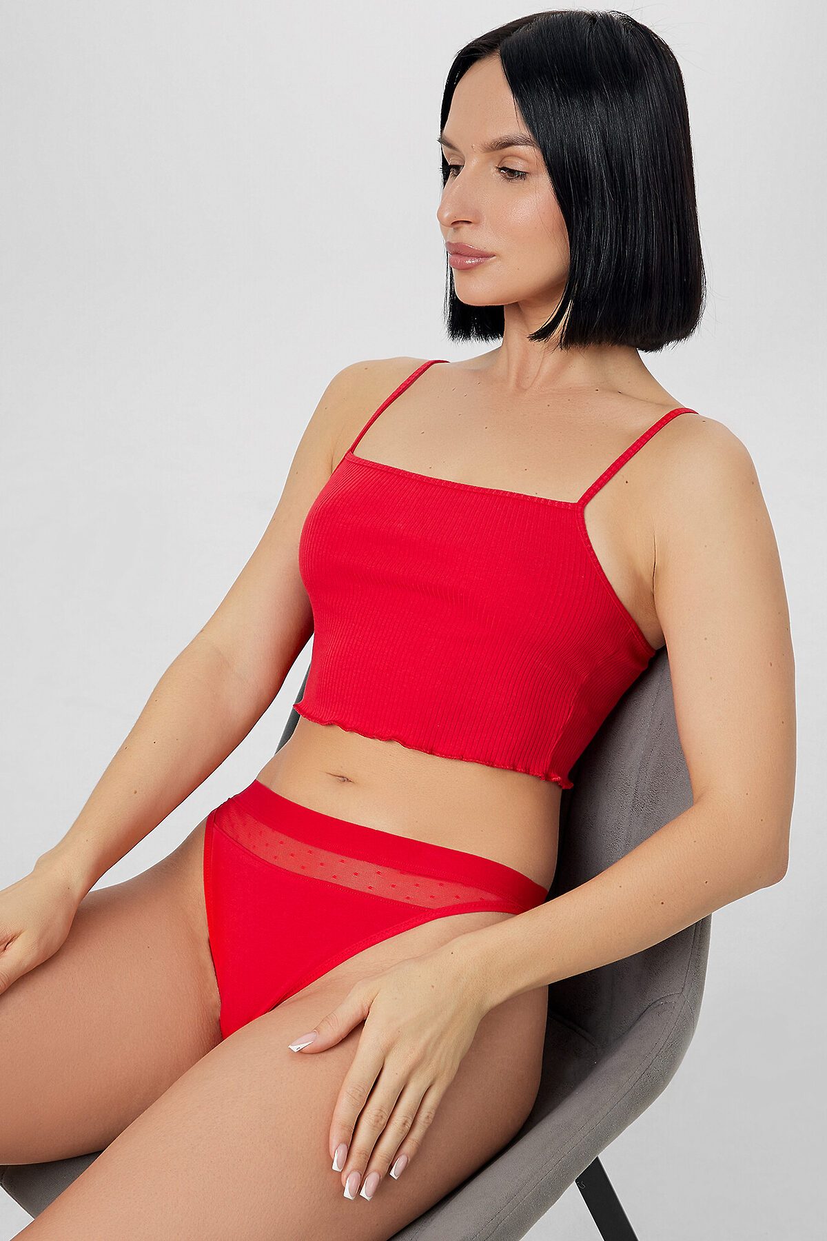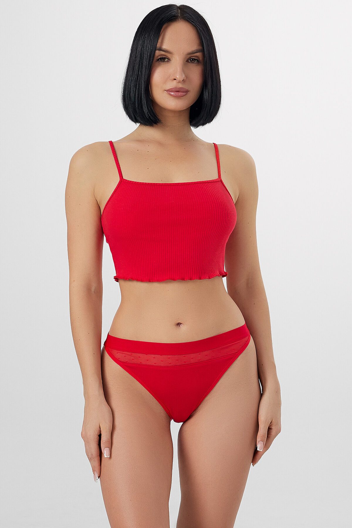 Трусы женские, средняя линия талии, силуэт - бразилиано. Передняя деталь выполнена из кружева. Ластовица из кружева на подкладке из хлопка. Задние детали выполнены из кружева. По верхнему срезу трусов жилка 6мм. По нижним срезам передней детали жилка. На передней детали декоративные обтачки из ткани.
