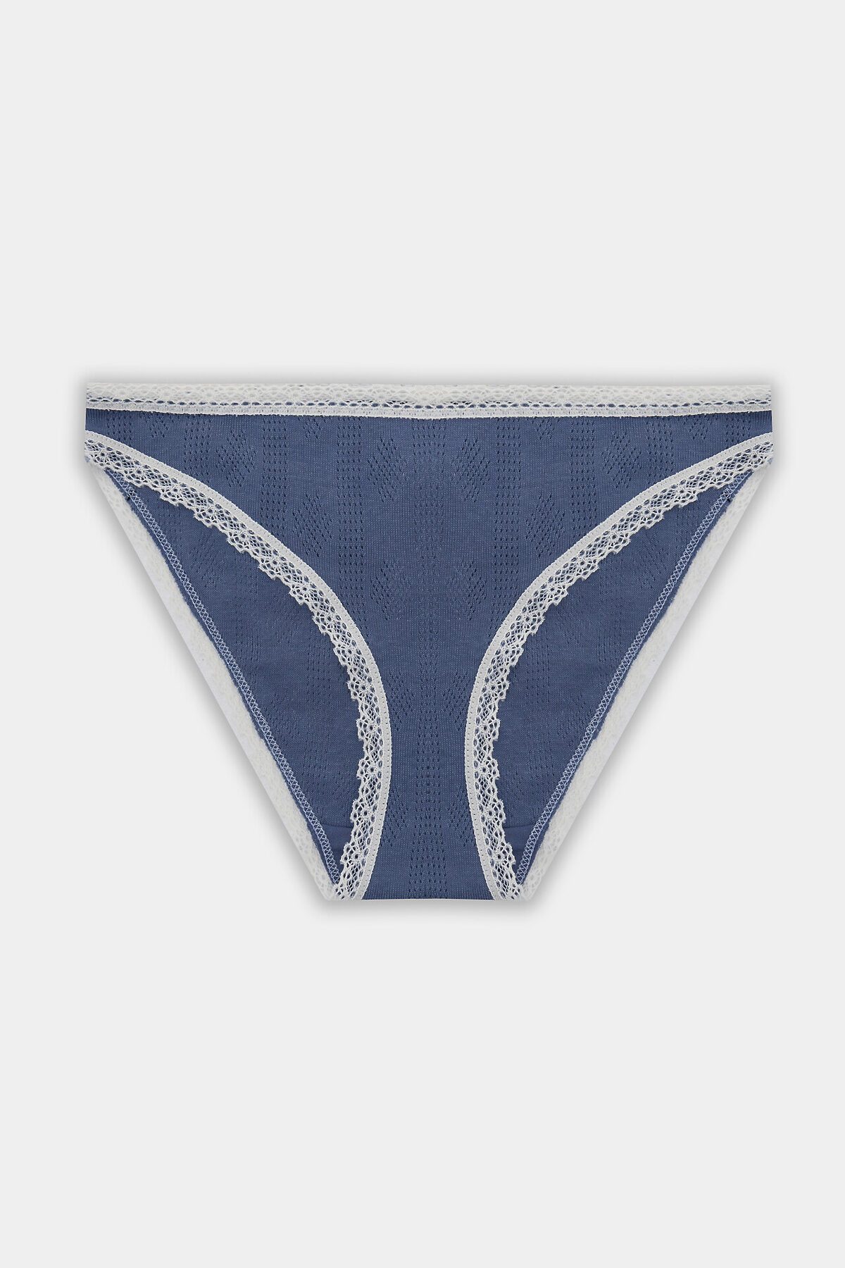 Трусы женские слипы с низкой посадкой из мелкараппортной рибаны. Передняя деталь цельная. Ластовица отлетная по переднему срезу, выполнена из кулирного полотна. Нижние и верхний срезы обработаны узким кружевом 15мм на плоскошовной машине. По верхнему срезу с изнаночной стороне эл. тесьма 6мм (жилка wt4-6, девсел 13460w).
