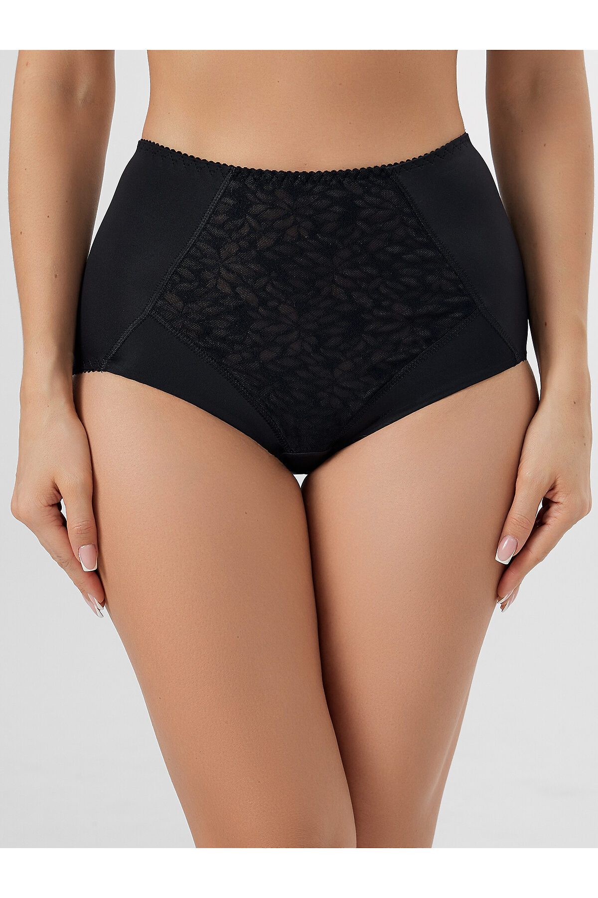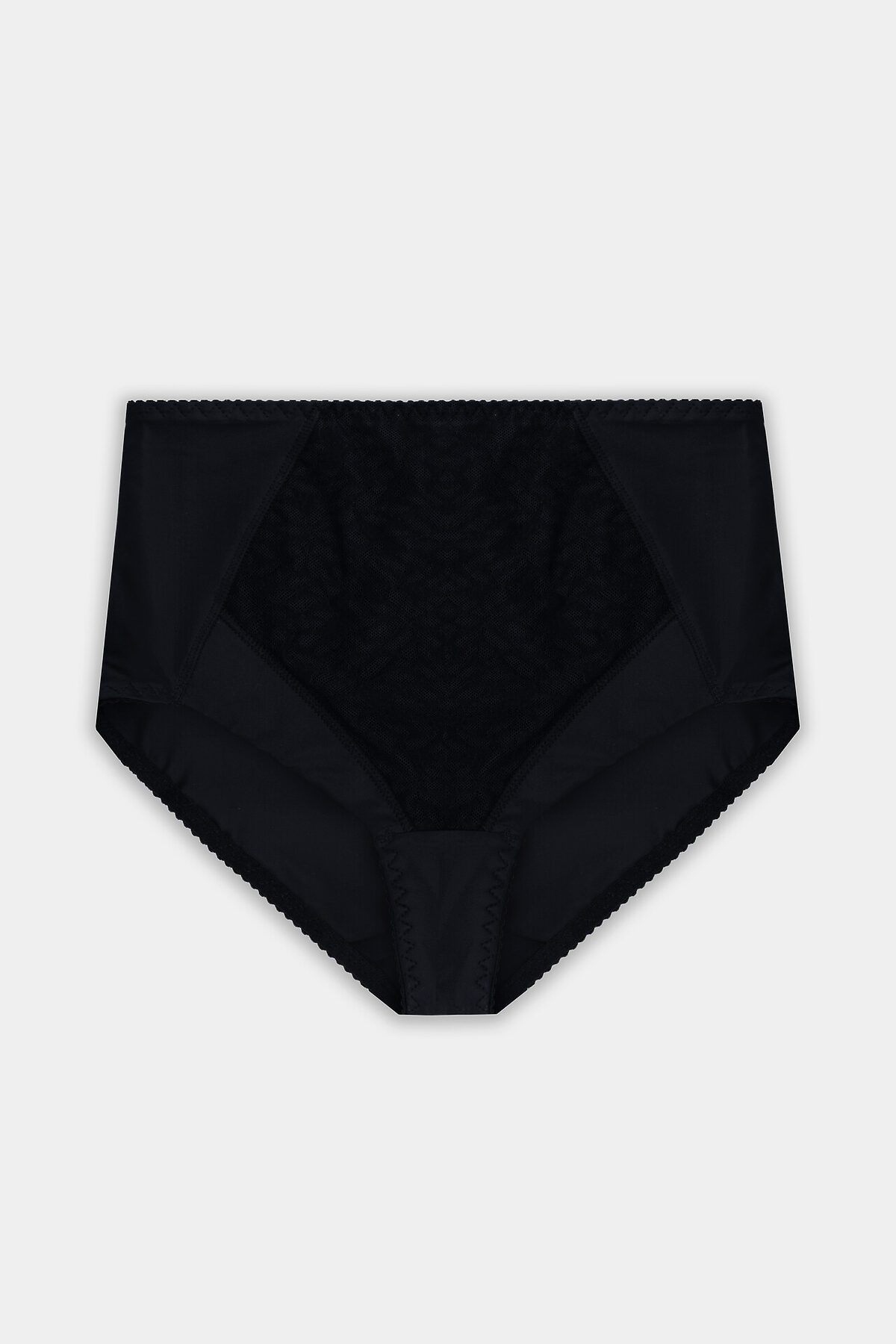 Трусы женские, силуэт макси, выполнены из трикотажного полотна микрофибра. Передняя деталь в центре декорирована кружевным полотном, на подкладке из монокапрона. Нижние детали переда двойные. Внутри по ножкам стоит эл тесьма 6мм (жилка Wt4-6, девсел 13460W). Подкладка ластовицы выполнена из кулирного полотна. Швы передних деталей, ластовицы обработаны на плоскошовной машине с верхним застилом. Срезы по ножкам зад. дет., ластовице обработаны эл. тесьмой с зубом 10мм (жесткая c/з WTE1-10 devsel 558W ) зигзагообразной строчкой. По верхнему срезу эл. тесьма 12мм (жесткая с/з WTE1-12, devsel 558W).