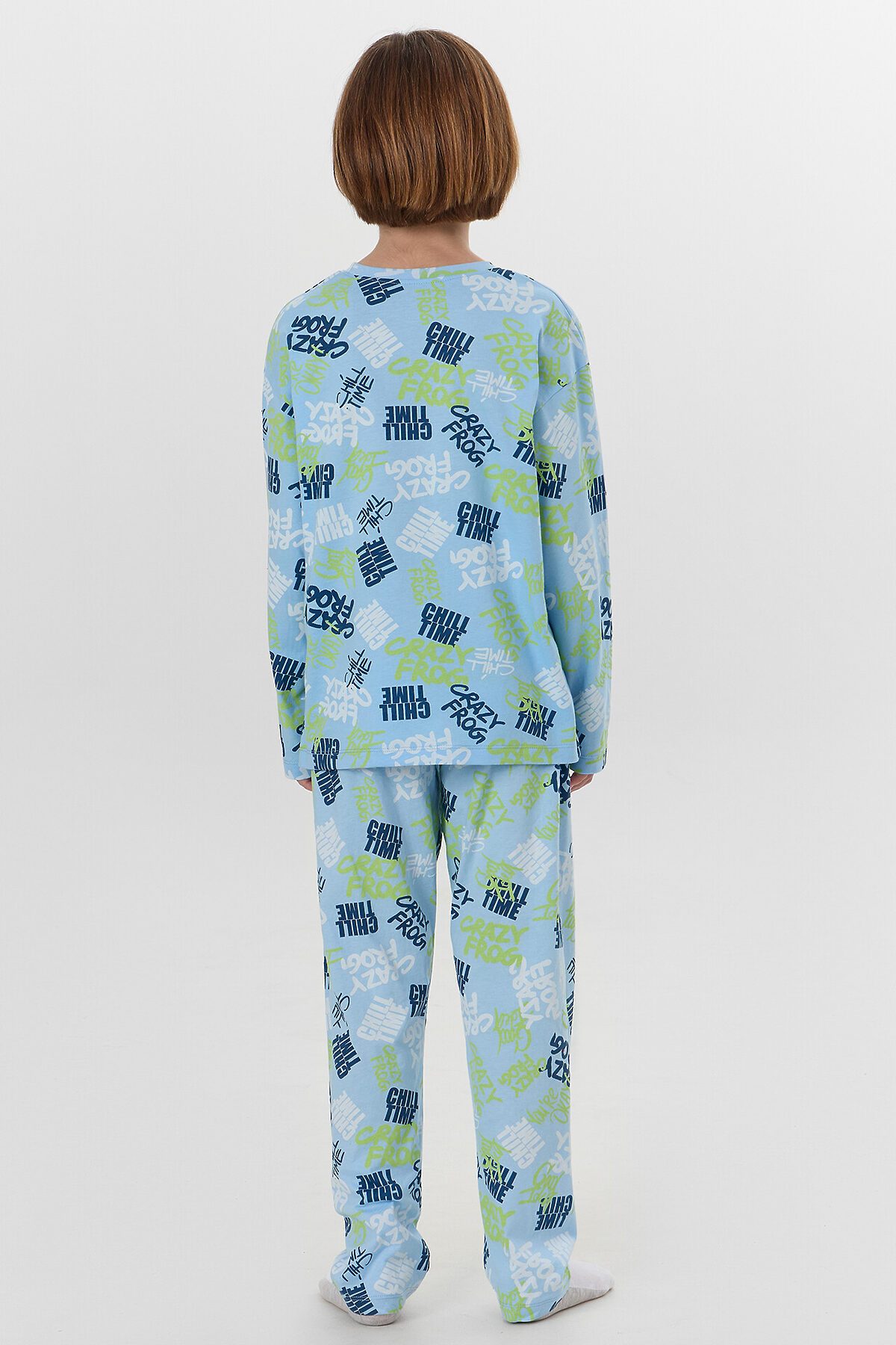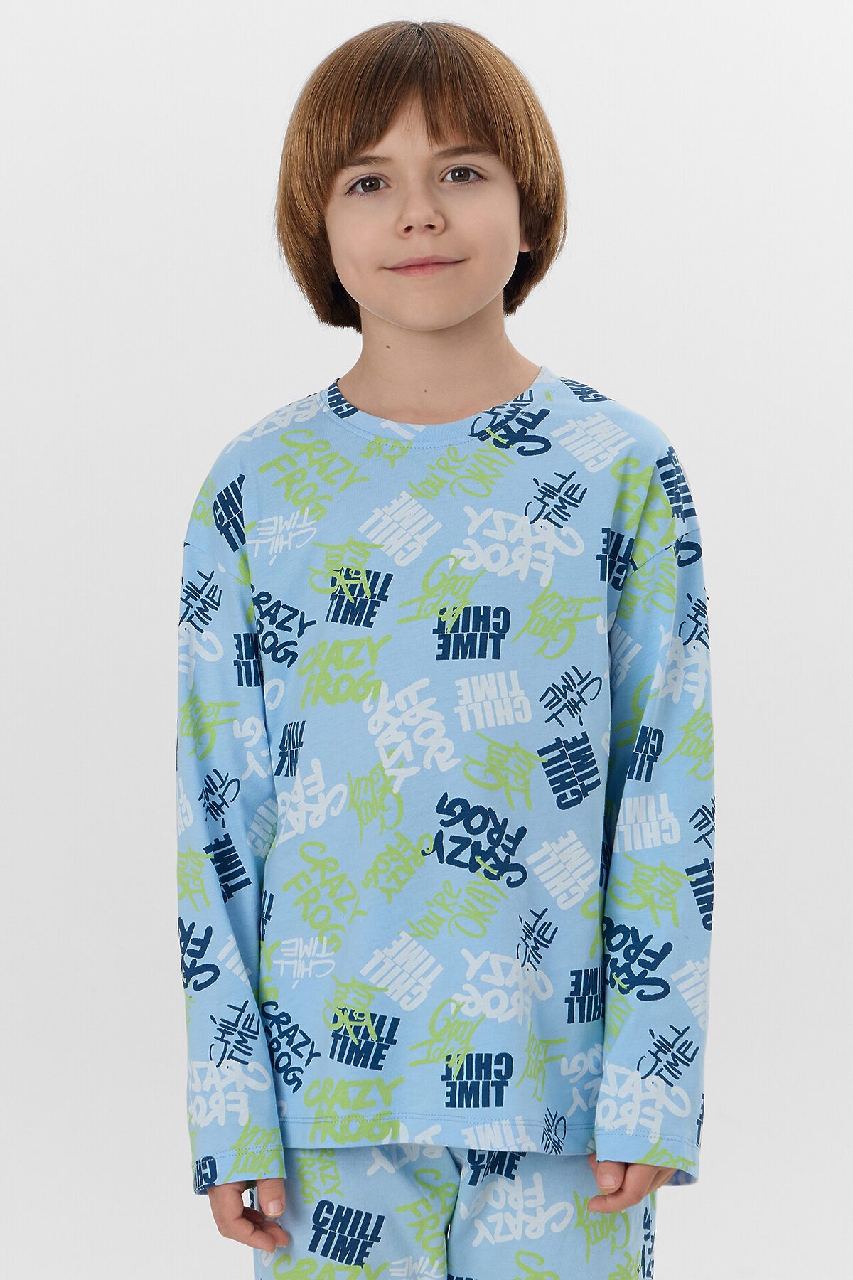 Комплект для мальчиков состоит из лонгслива и брюк. Горловина круглой формы с притачной обтачкой из основного полотна. Рукава длинные втачные, со спущенным плечом. Перед и спинка цельнокроеные. Низ лонгслива и рукавов обработан швом в подгибку. Брюки длинные, прямые. Пояс цельнокроенный с эластичной тесьмой внутри (внутренняя резина 30RV), ширина 30мм. Низ брюк застрочен вподгибку.