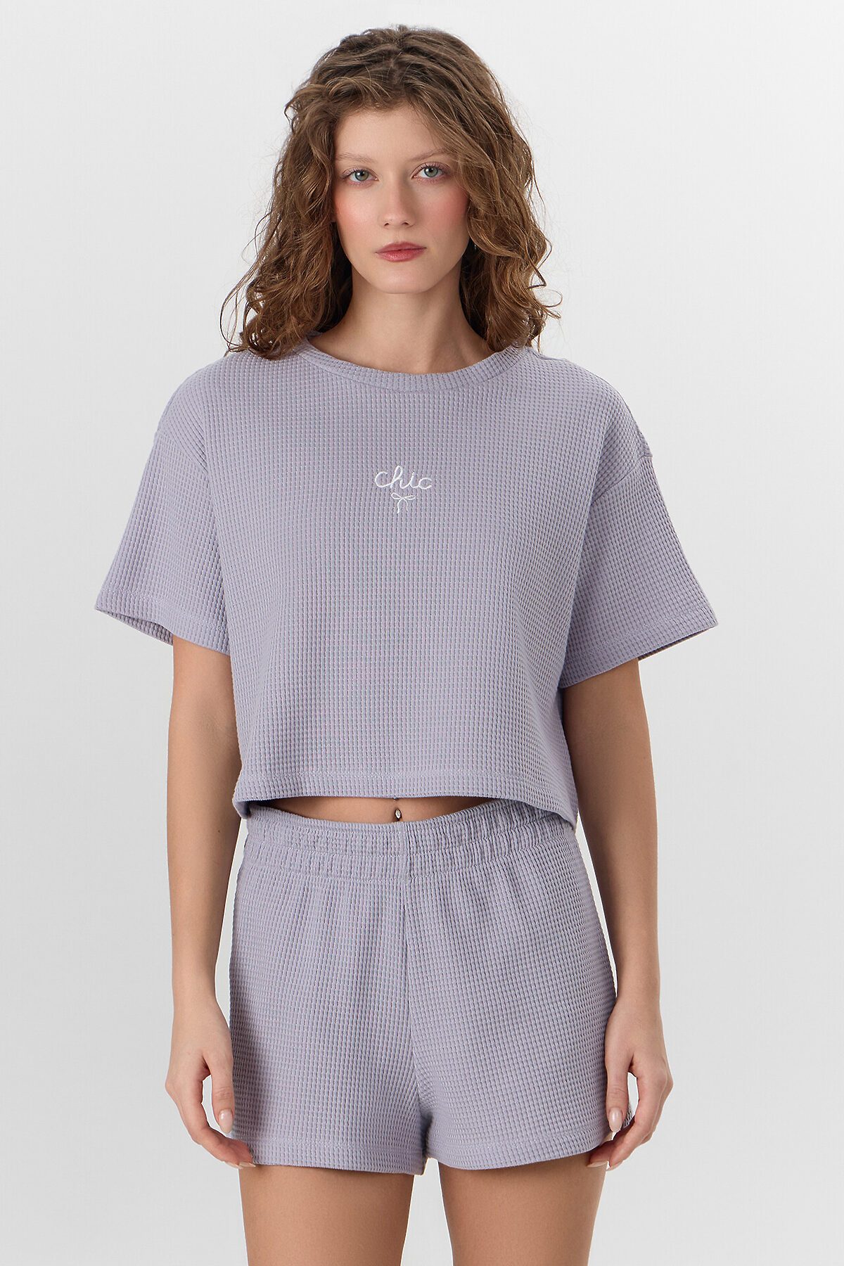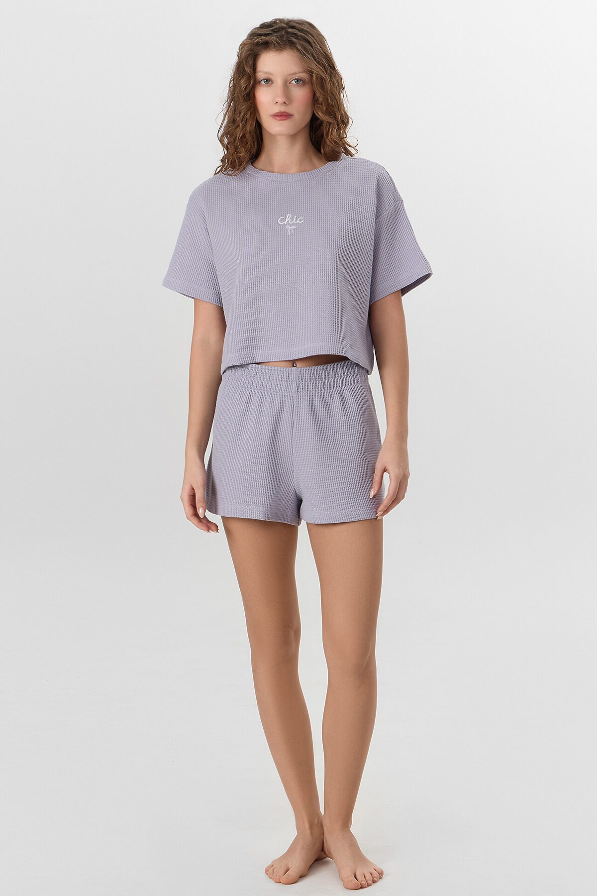 Трендовый женский комплект из натурального хлопкового полотна. Футболка свободного силуэта, укороченная, с круглым вырезом. Шорты свободные, короткие, с эластичнйо тесьмой в поясе. Рекомендуем для сна, отдыха и домашних дел