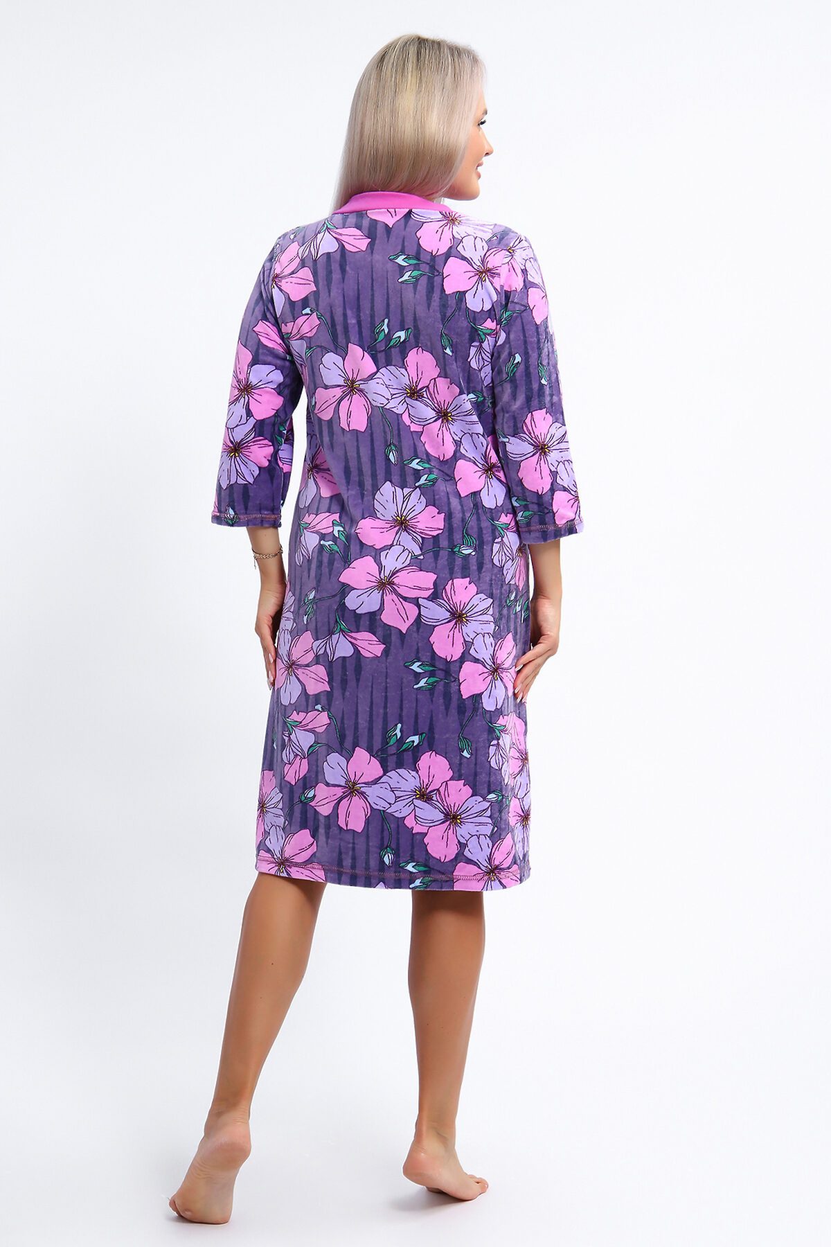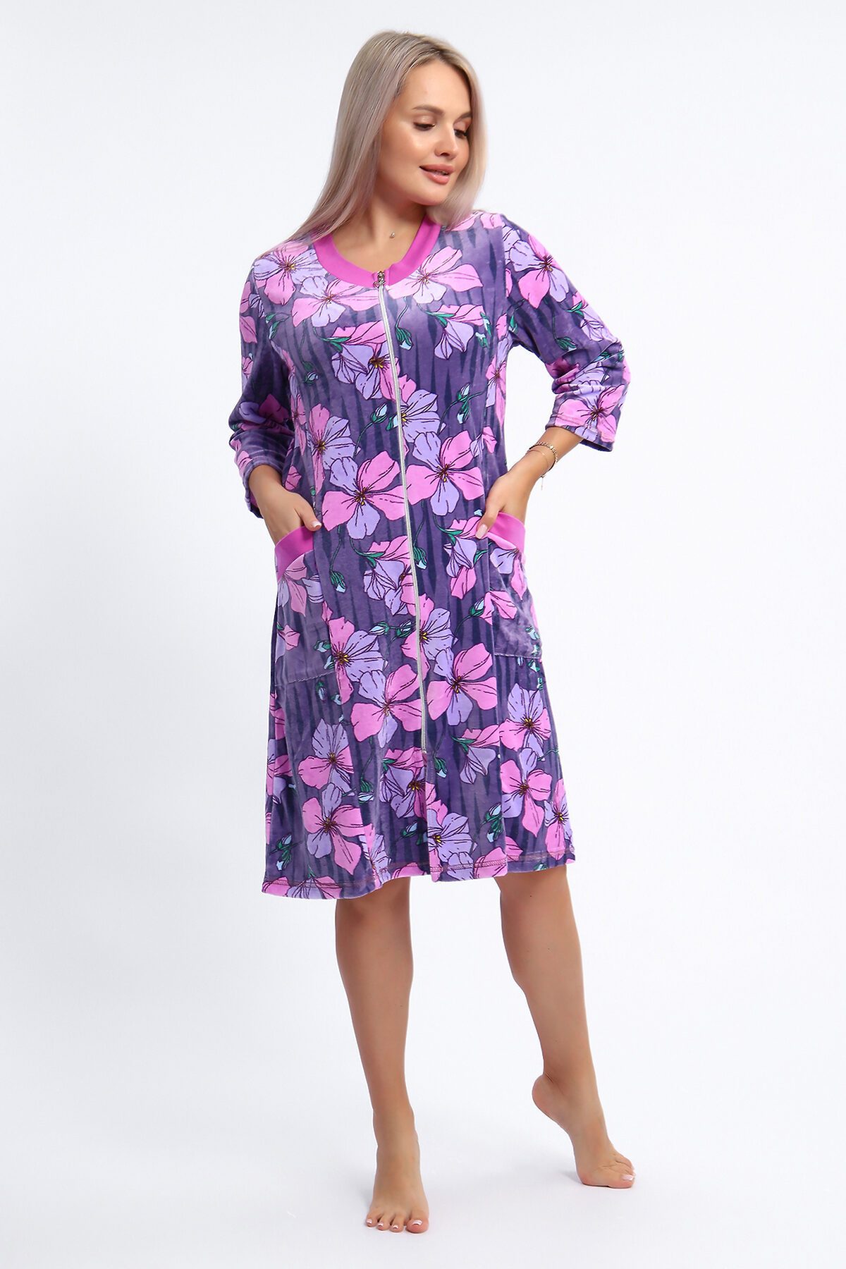 Халат женский на серебристой молнии выполнен из набивного велюра. Халат с рукавом 3/4, головина и карманы отделаны тканью контрастного цвета. Халат идеально подойдет для дома и отдыха.