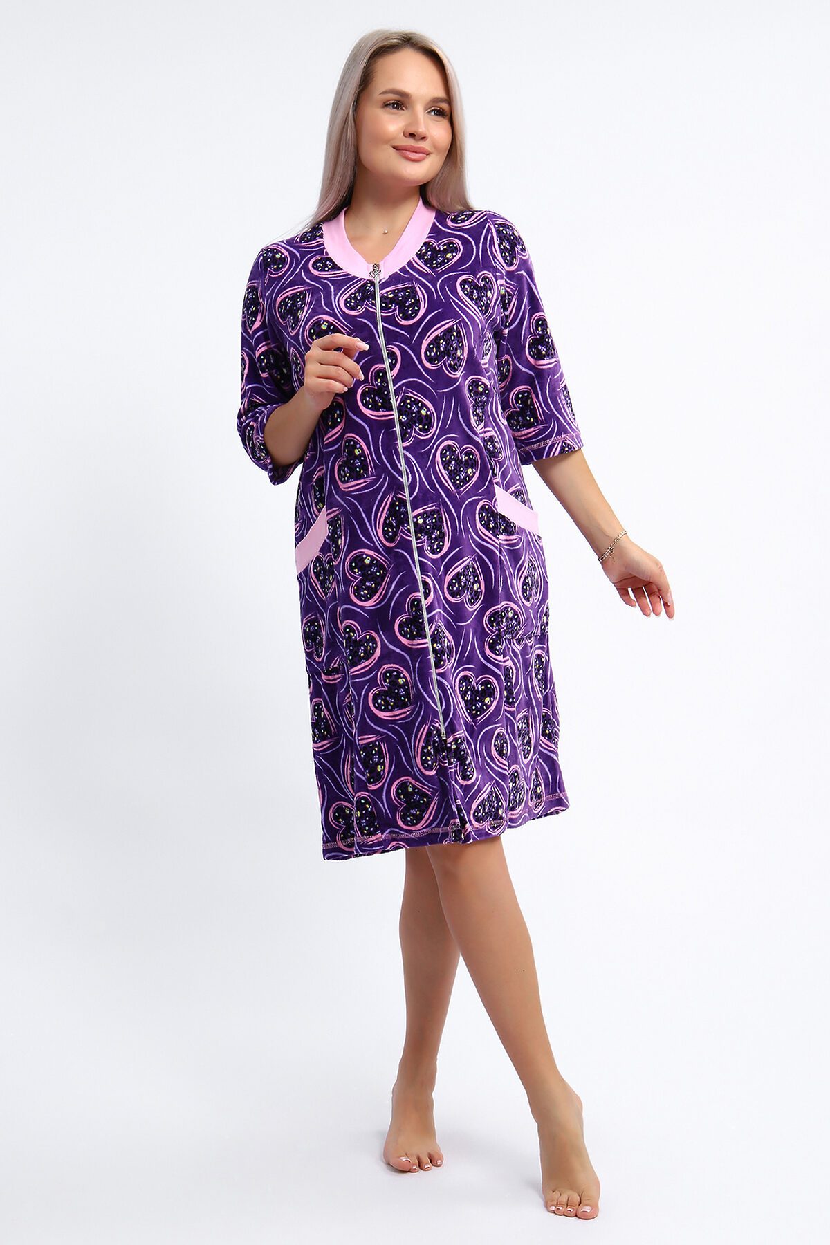 Халат женский на серебристой молнии выполнен из набивного велюра. Халат с рукавом 3/4, головина и карманы отделаны тканью контрастного цвета. Халат идеально подойдет для дома и отдыха.