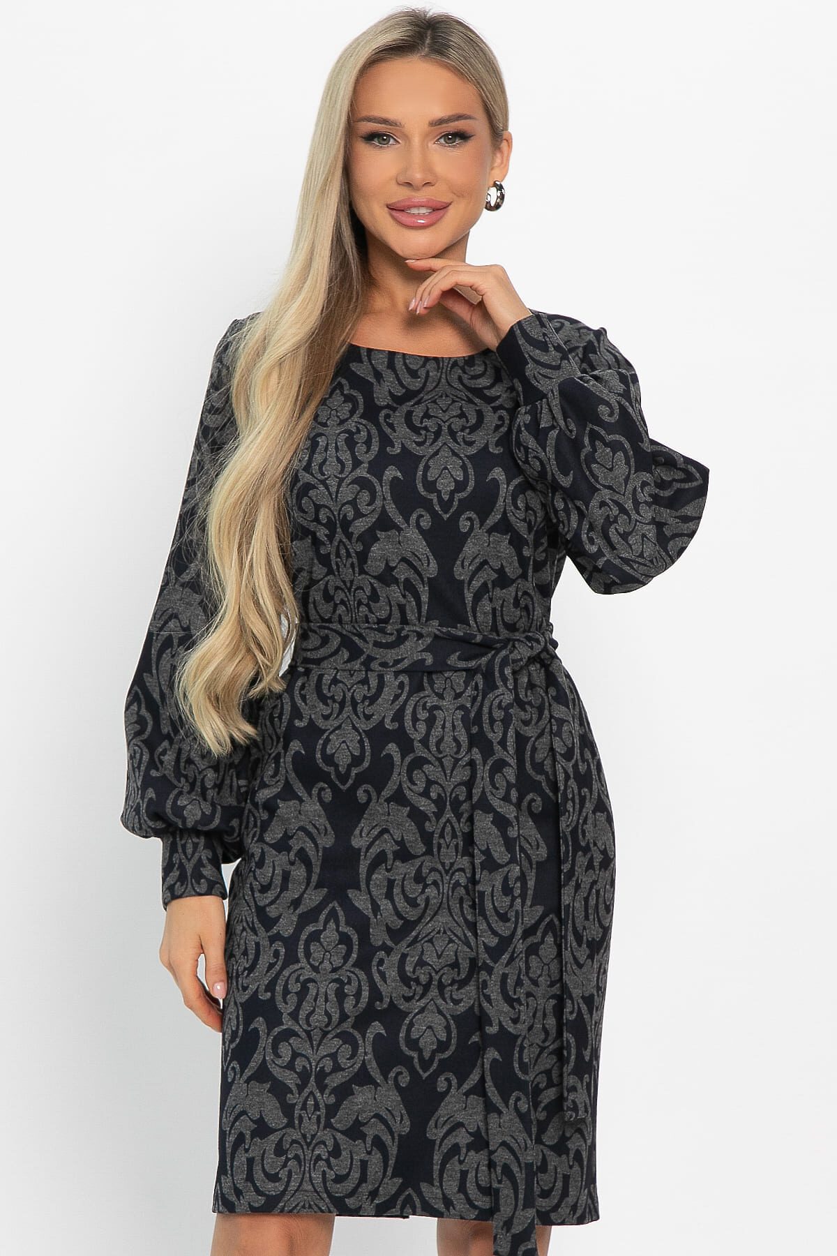 Классическое полуприлегающее платье средней длины, украшенное изысканным принтом в виде вензелей. Это платье – воплощение элегантности и утонченности. Серо-синий цвет придаёт изделию особый шик и роскошь, делая его идеальным выбором для праздничных мероприятий и особых случаев. Втачной рукав полной длины заканчивается сборкой и манжетой. Разрез сзади внизу обеспечивает удобство при движении. Оно создано для того, чтобы подчеркнуть вашу неповторимую красоту.