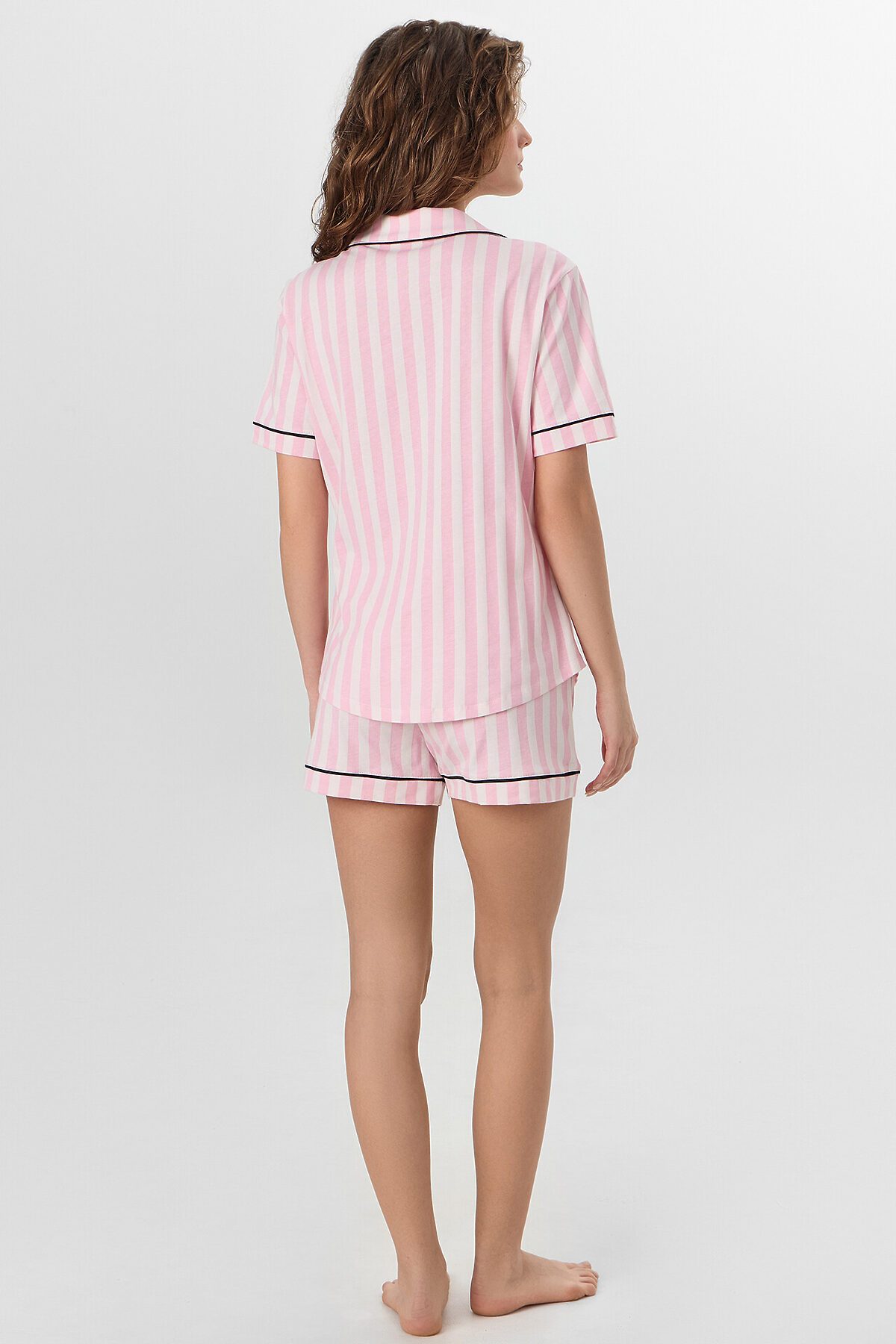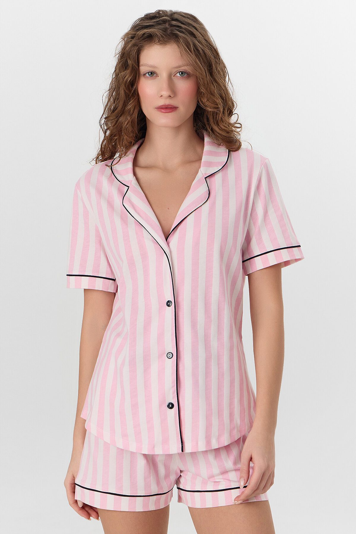 Пижама женская с шортами — это воплощение уюта и элегантности для вашего домашнего отдыха. Комплект в «костюмном стиле» состоит из прямого жакета с отложным воротником, а также свободных мини шорт с эластичным поясом. Жакет застегивается на пуговицы и украшен контрастными кантами по рукавам, воротнику и передней части, что добавляет образу стильную завершенность. Шорты дополнены атласной тесьмой, которая завязывается на изящный бантик, подчеркивая нежность и внимание к деталям.