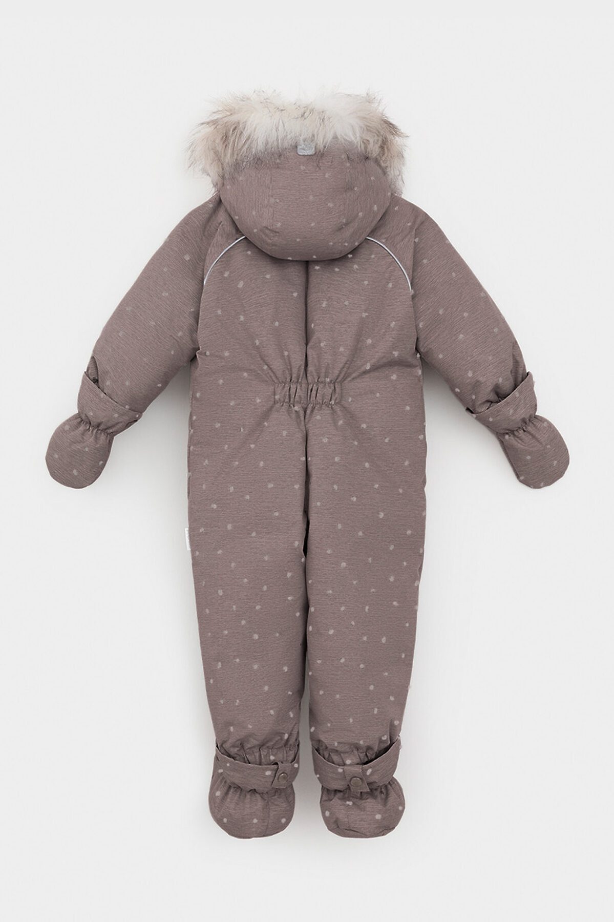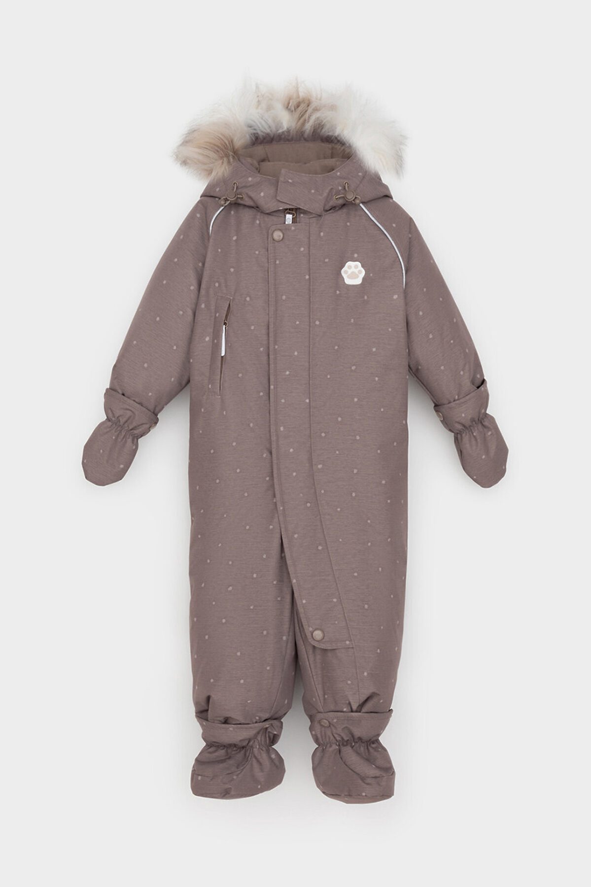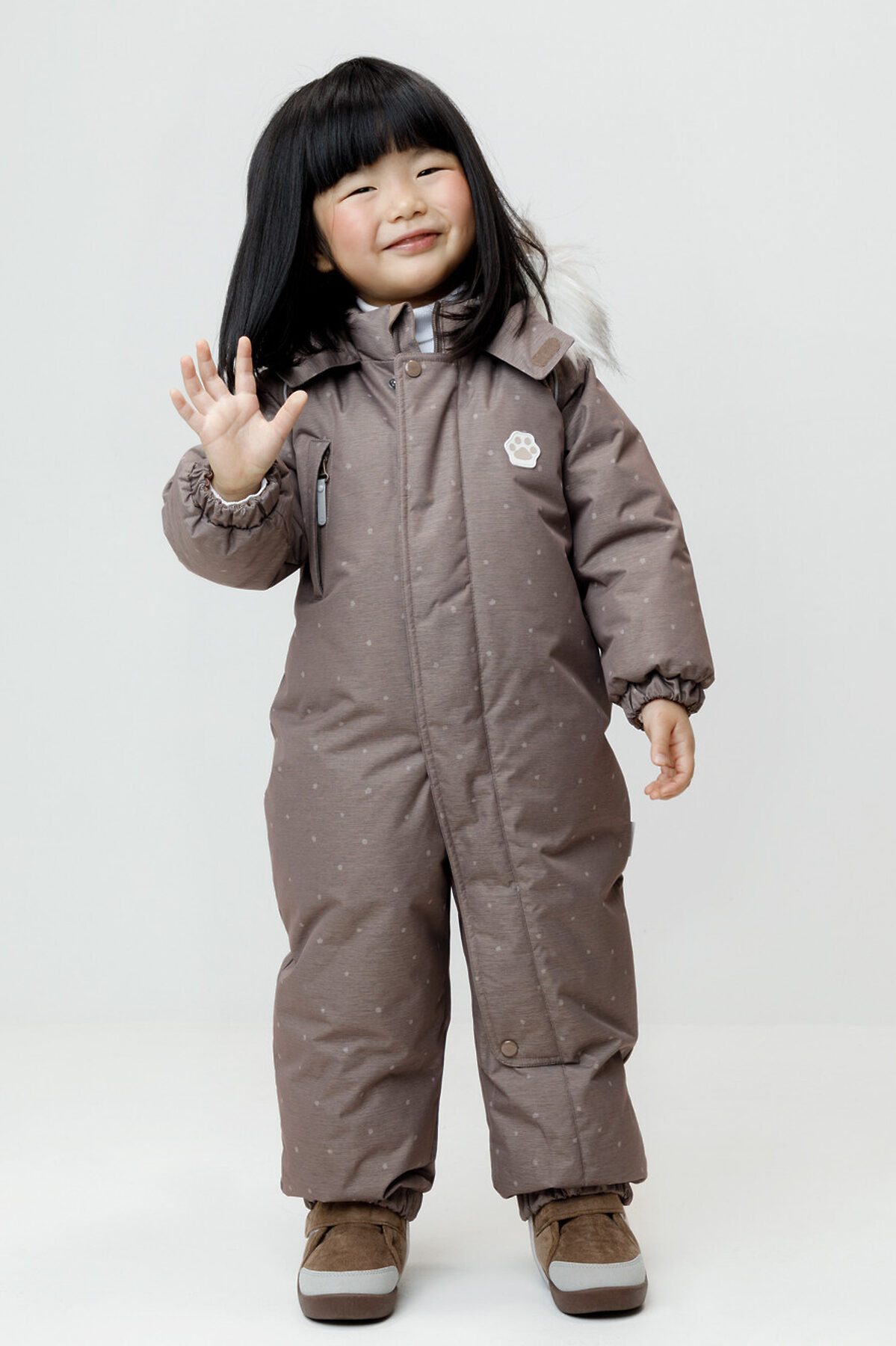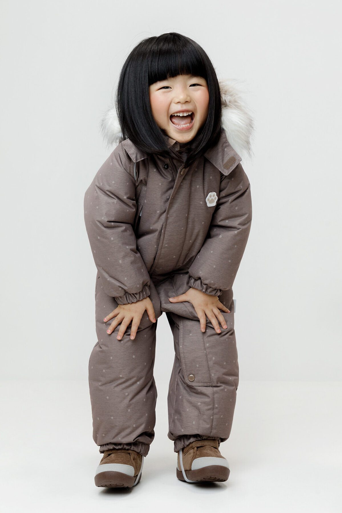 Зимний комбинезон ясельный с натуральным утеплителем из гусиного пуха (70%) и пера (30%). Выполнен из мембранной ткани с дополнительной тефлоновой обработкой, которая предохраняет изделие от загрязнений и отталкивает влагу. Подклад выполнен из 100% хлопка. Комбинезон застёгивается на молнию и внешнюю планку на липучках, предусмотрена защита подбородка. Несъёмный капюшон имеет эластичную утяжку со стопперами и отстёгивающийся мех на молнии. Резинка по спинке для лучшего прилегания. На груди карман на молнии. По рукавам и низу изделия эластичные манжеты, на ножках отстёгивающиеся силиконовые штрипки. В размерах с 68-74 по 80-86 в комплекте идут рукавицы и пинетки. Во всех изделиях верхнего ассортимента для безопасности ребёнка предусмотрены светоотражающие элементы.