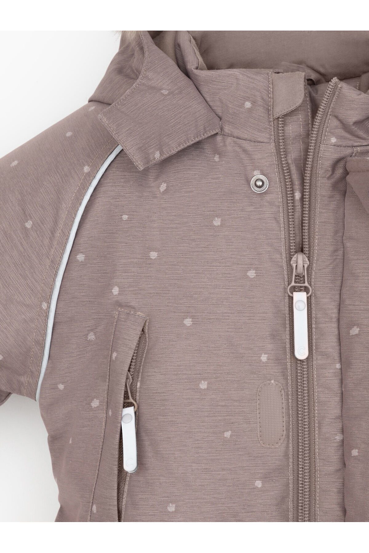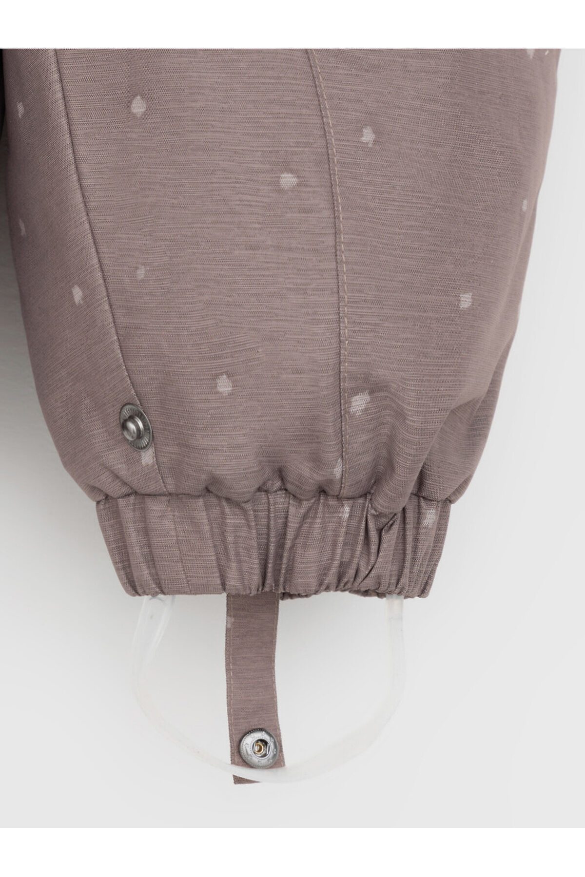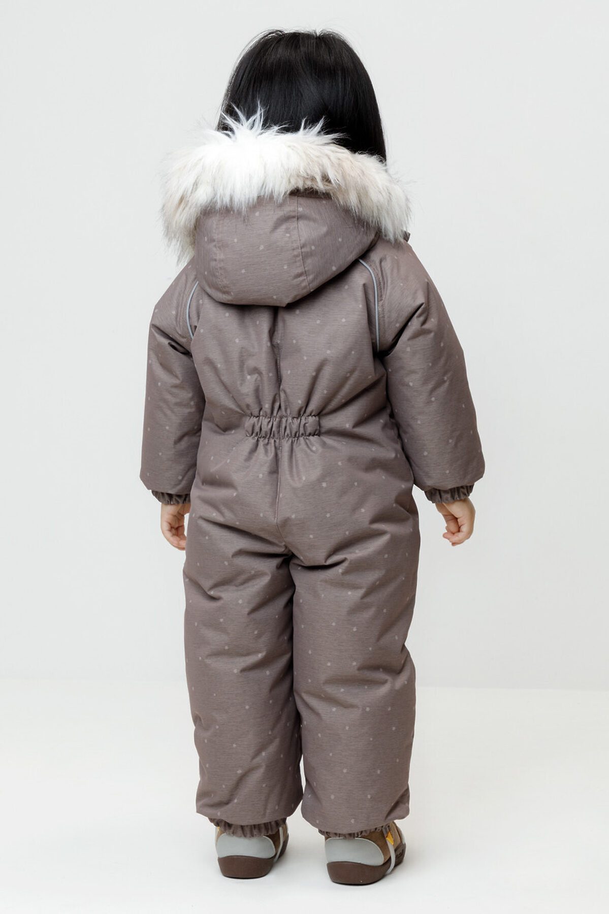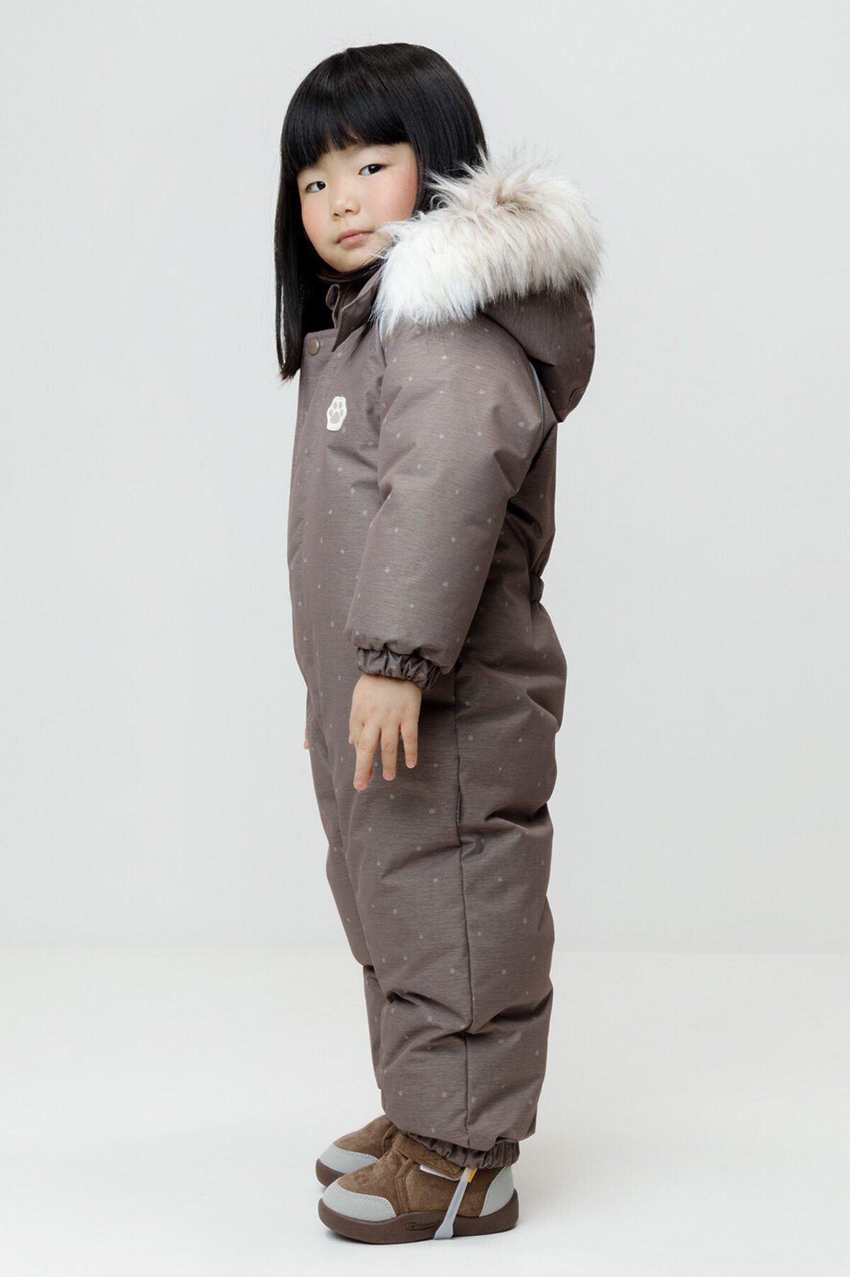 Зимний комбинезон ясельный с натуральным утеплителем из гусиного пуха (70%) и пера (30%). Выполнен из мембранной ткани с дополнительной тефлоновой обработкой, которая предохраняет изделие от загрязнений и отталкивает влагу. Подклад выполнен из 100% хлопка. Комбинезон застёгивается на молнию и внешнюю планку на липучках, предусмотрена защита подбородка. Несъёмный капюшон имеет эластичную утяжку со стопперами и отстёгивающийся мех на молнии. Резинка по спинке для лучшего прилегания. На груди карман на молнии. По рукавам и низу изделия эластичные манжеты, на ножках отстёгивающиеся силиконовые штрипки. В размерах с 68-74 по 80-86 в комплекте идут рукавицы и пинетки. Во всех изделиях верхнего ассортимента для безопасности ребёнка предусмотрены светоотражающие элементы.
