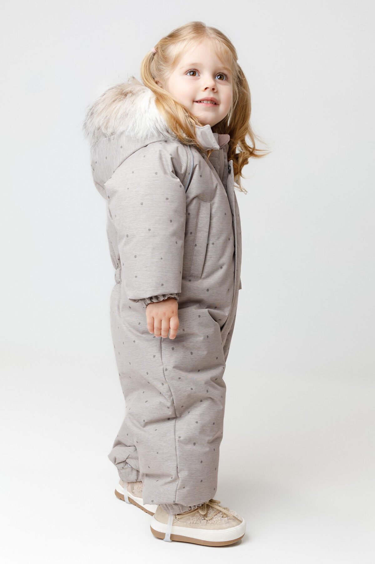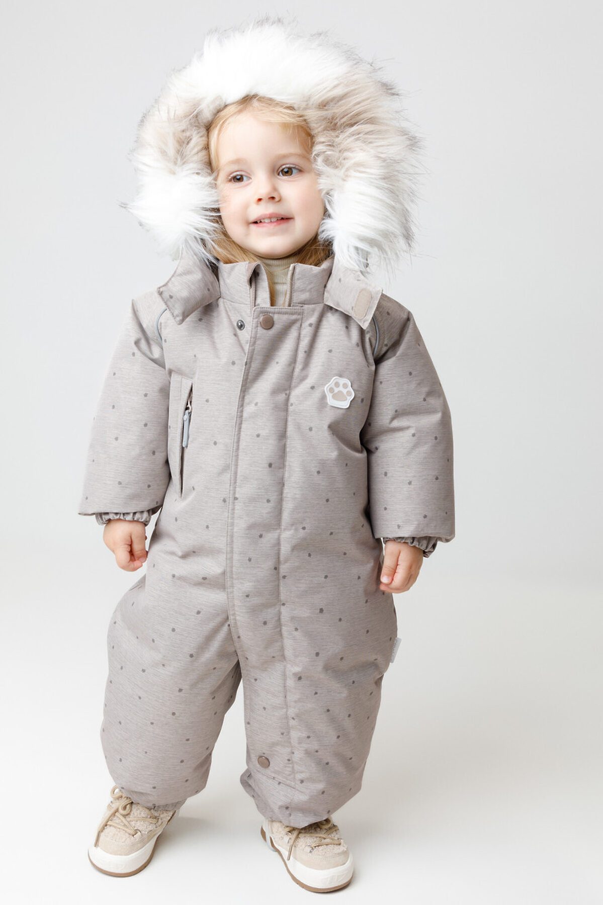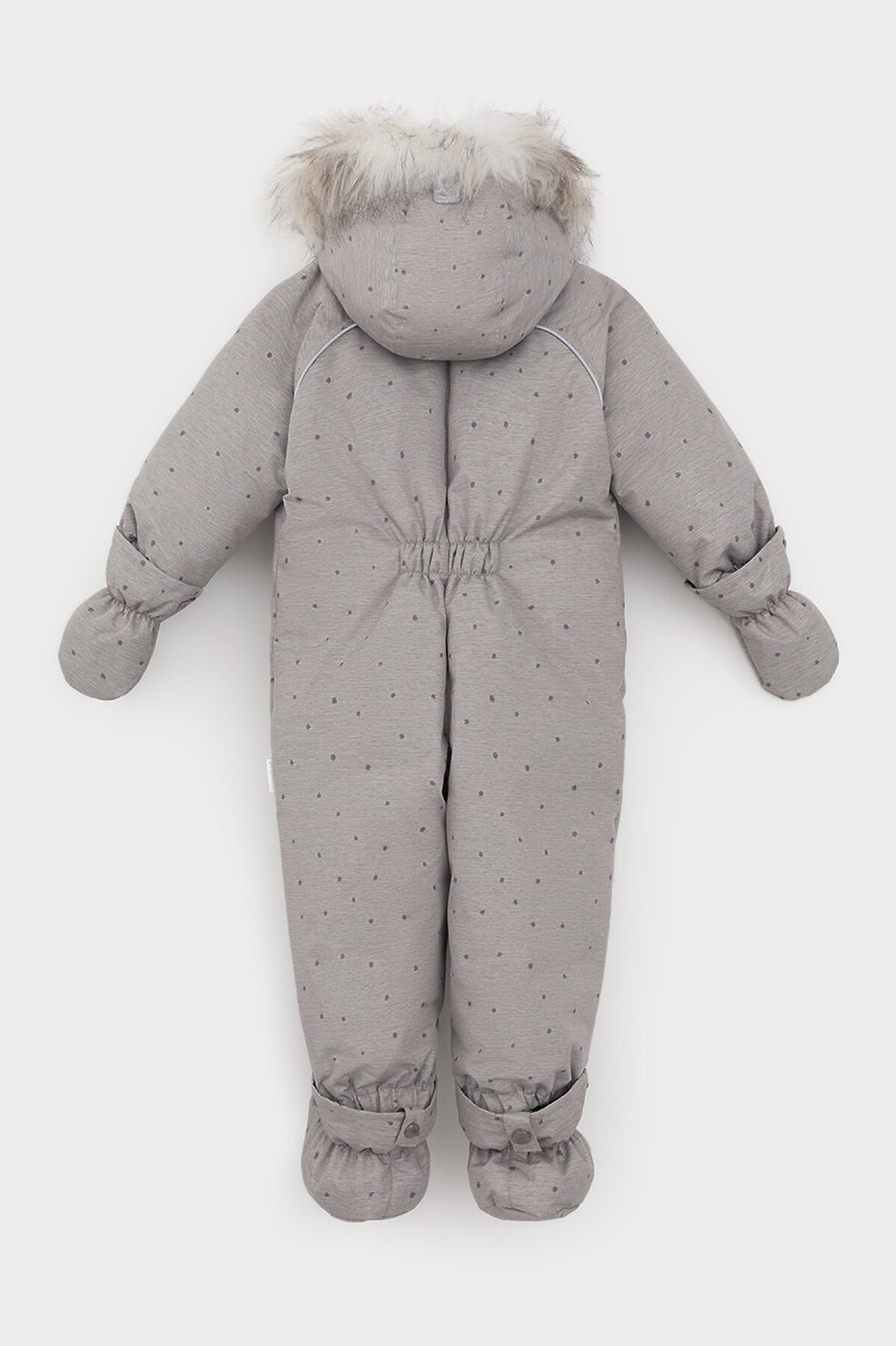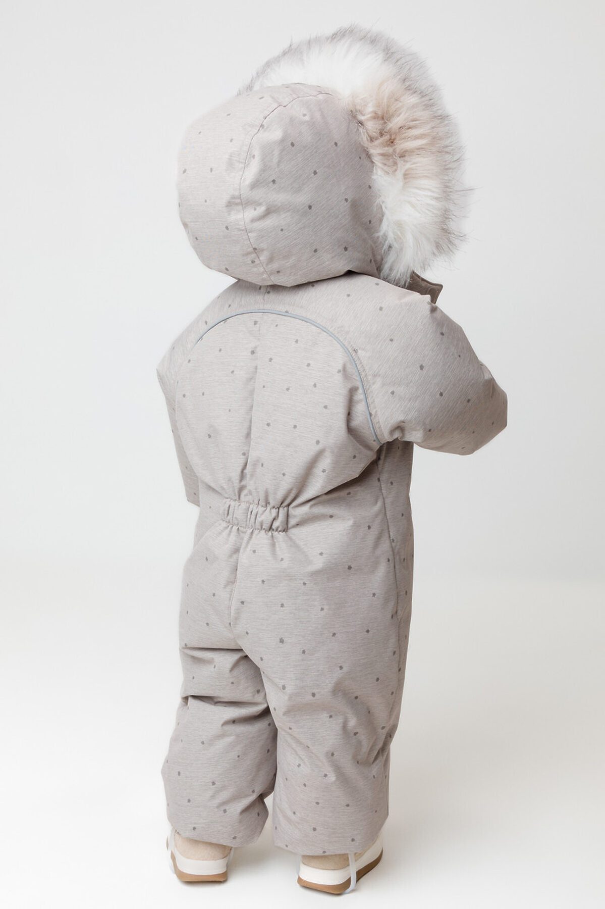 Зимний комбинезон ясельный с натуральным утеплителем из гусиного пуха (70%) и пера (30%). Выполнен из мембранной ткани с дополнительной тефлоновой обработкой, которая предохраняет изделие от загрязнений и отталкивает влагу. Подклад выполнен из 100% хлопка. Комбинезон застёгивается на молнию и внешнюю планку на липучках, предусмотрена защита подбородка. Несъёмный капюшон имеет эластичную утяжку со стопперами и отстёгивающийся мех на молнии. Резинка по спинке для лучшего прилегания. На груди карман на молнии. По рукавам и низу изделия эластичные манжеты, на ножках отстёгивающиеся силиконовые штрипки. В размерах с 68-74 по 80-86 в комплекте идут рукавицы и пинетки. Во всех изделиях верхнего ассортимента для безопасности ребёнка предусмотрены светоотражающие элементы.