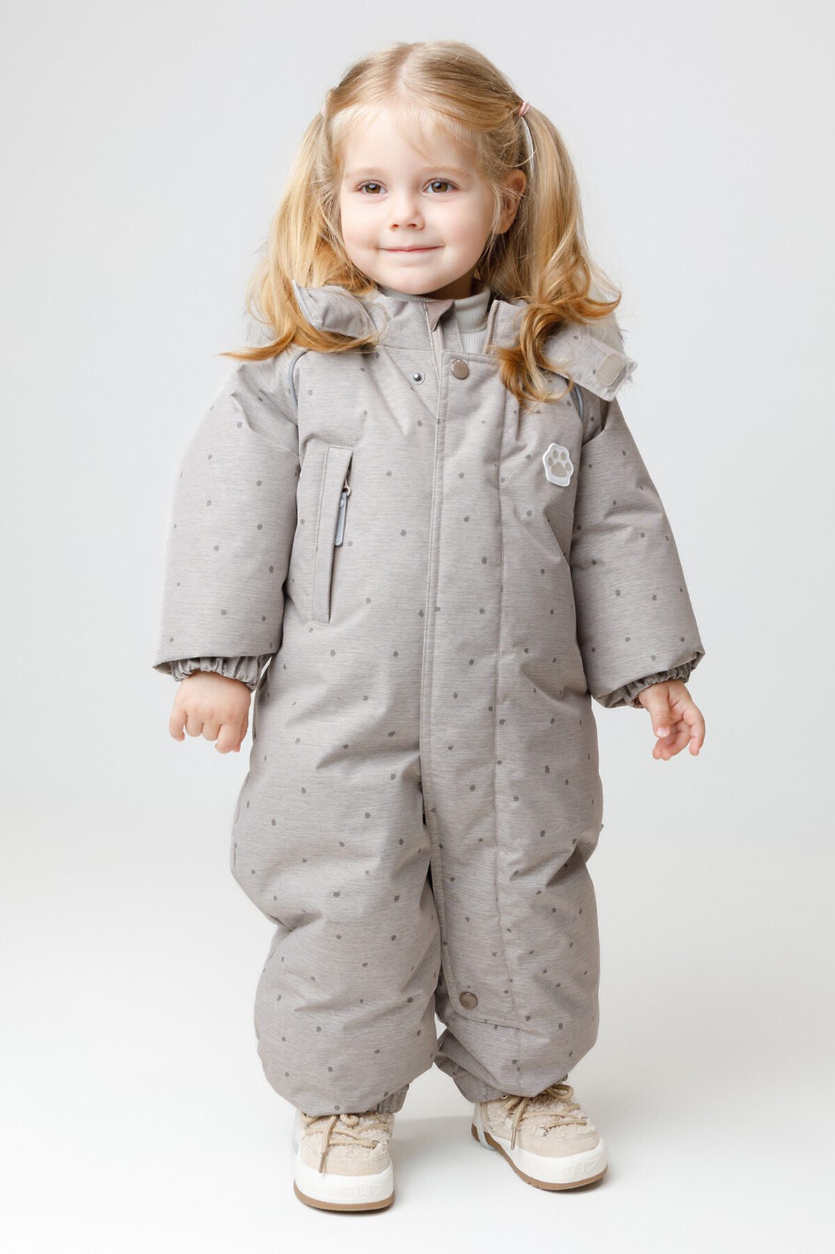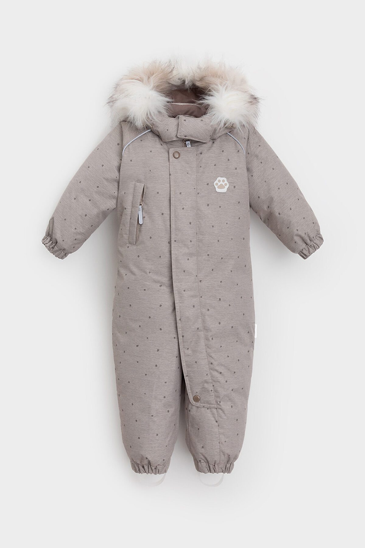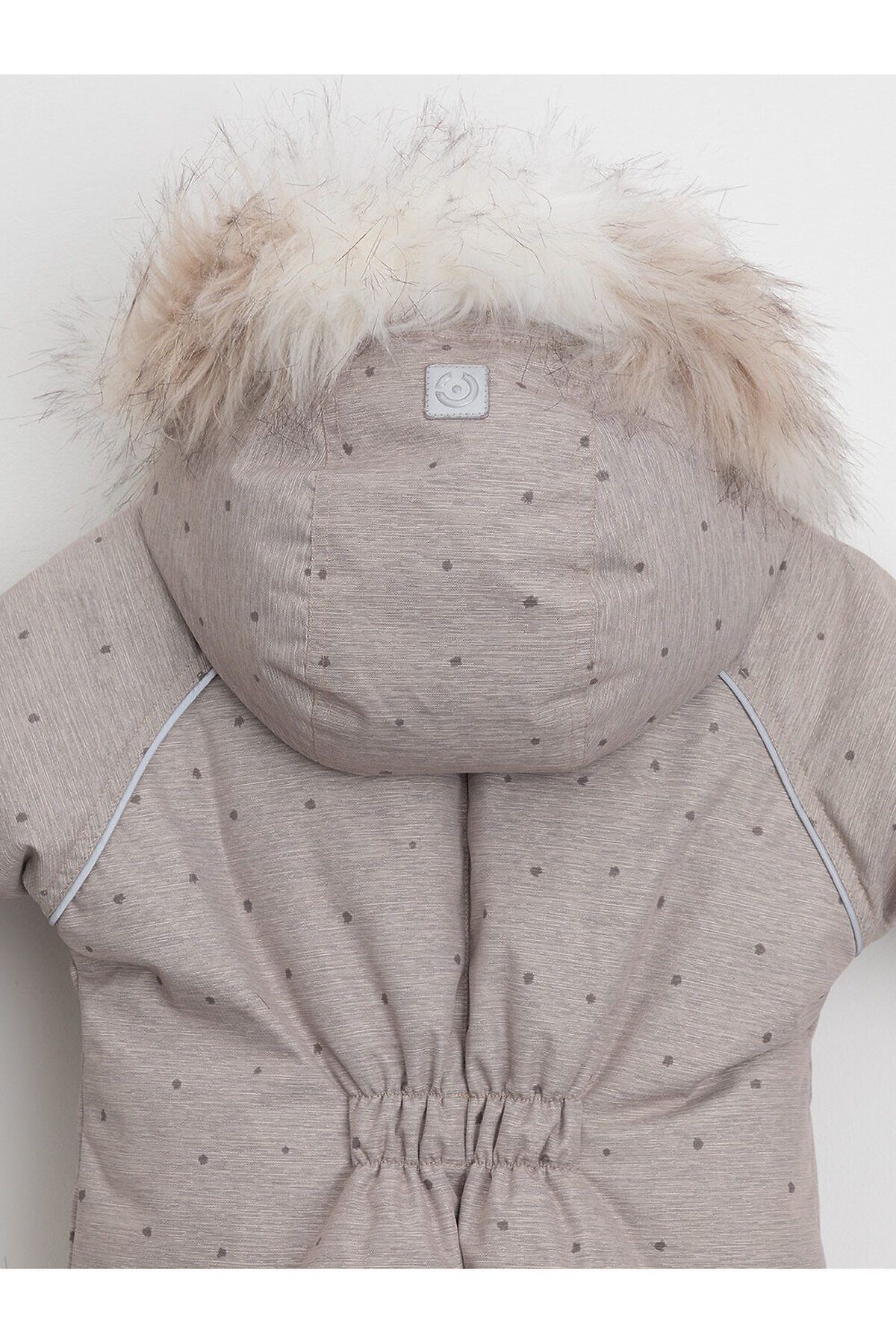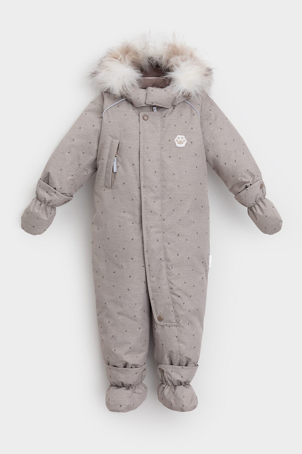 Зимний комбинезон ясельный с натуральным утеплителем из гусиного пуха (70%) и пера (30%). Выполнен из мембранной ткани с дополнительной тефлоновой обработкой, которая предохраняет изделие от загрязнений и отталкивает влагу. Подклад выполнен из 100% хлопка. Комбинезон застёгивается на молнию и внешнюю планку на липучках, предусмотрена защита подбородка. Несъёмный капюшон имеет эластичную утяжку со стопперами и отстёгивающийся мех на молнии. Резинка по спинке для лучшего прилегания. На груди карман на молнии. По рукавам и низу изделия эластичные манжеты, на ножках отстёгивающиеся силиконовые штрипки. В размерах с 68-74 по 80-86 в комплекте идут рукавицы и пинетки. Во всех изделиях верхнего ассортимента для безопасности ребёнка предусмотрены светоотражающие элементы.