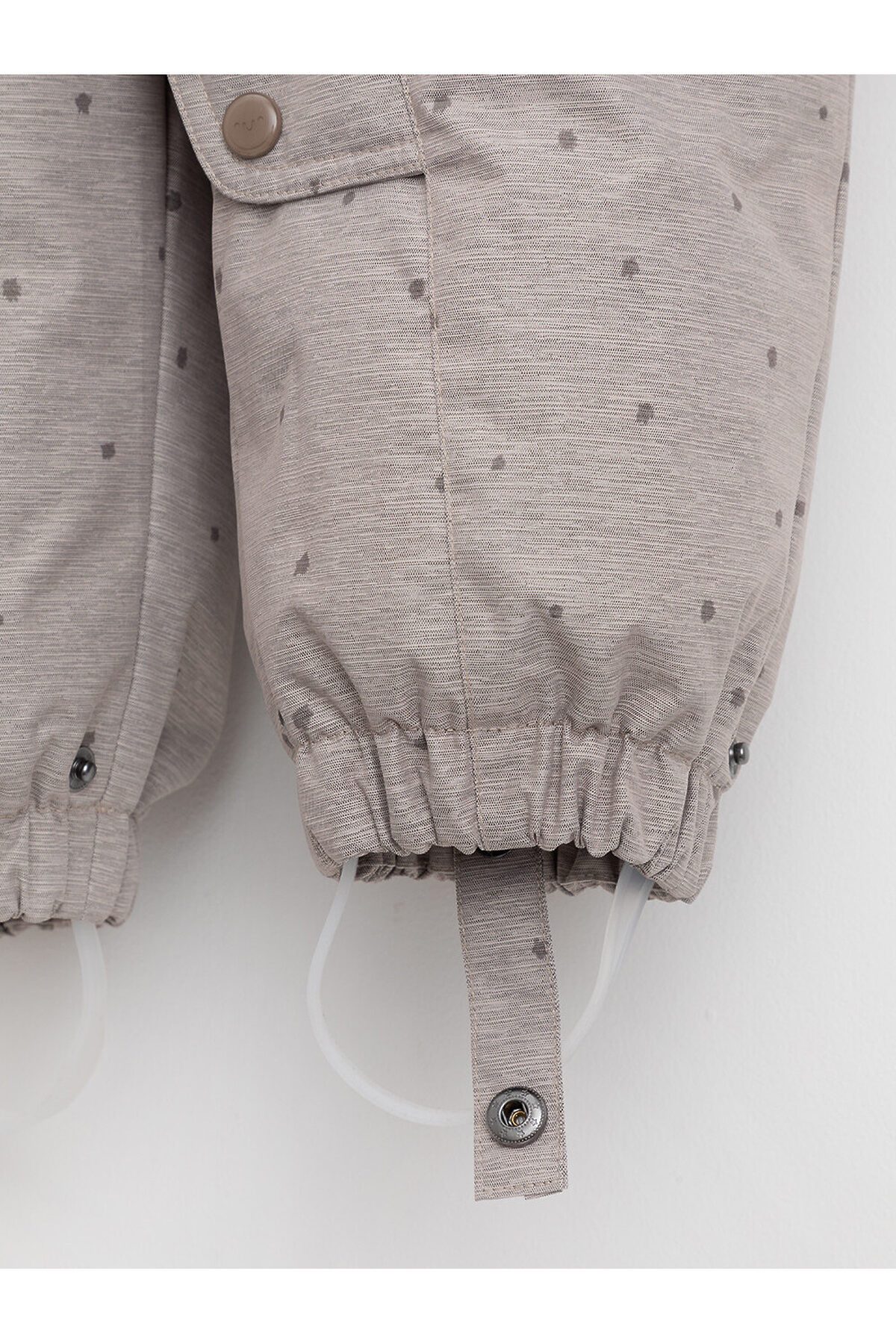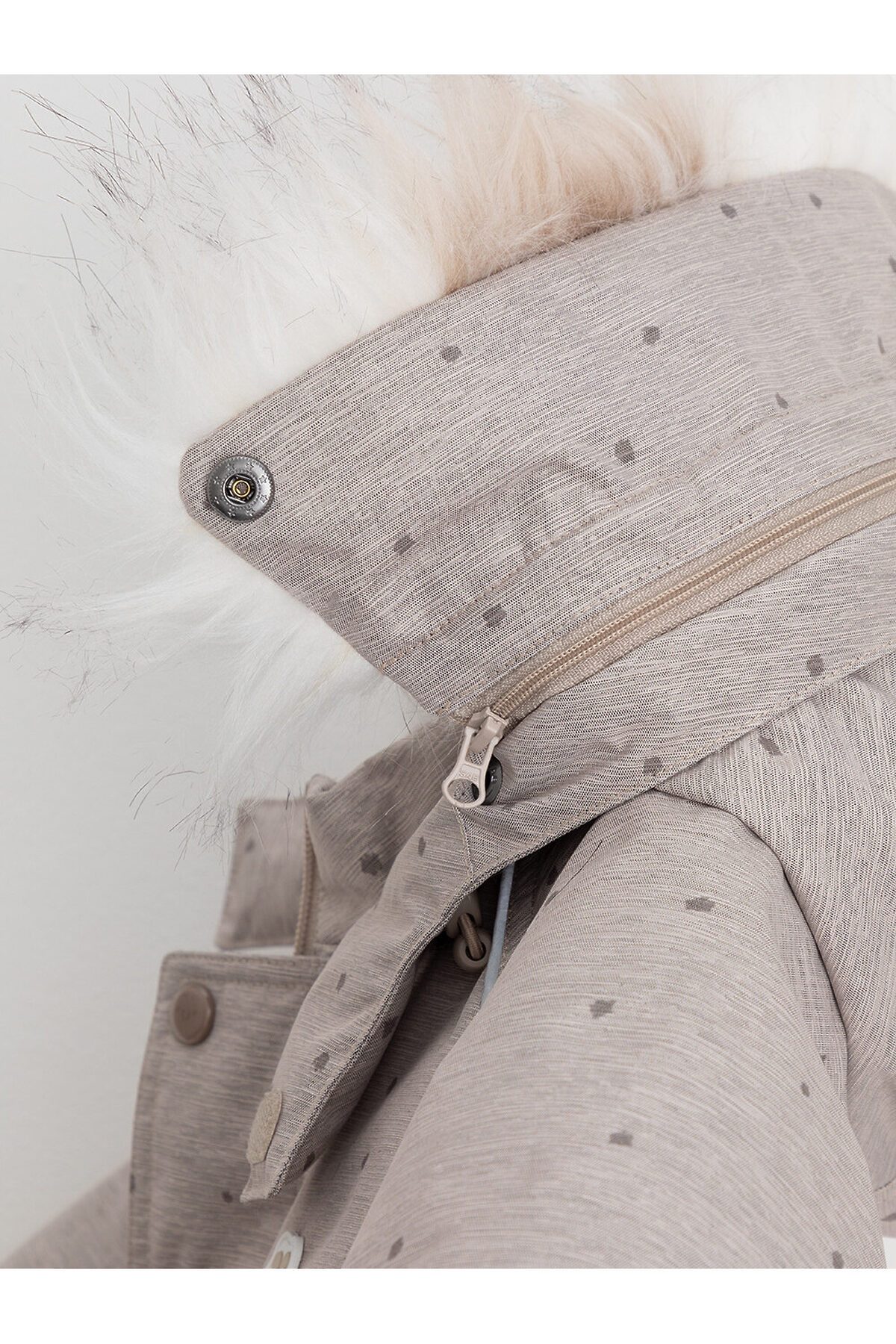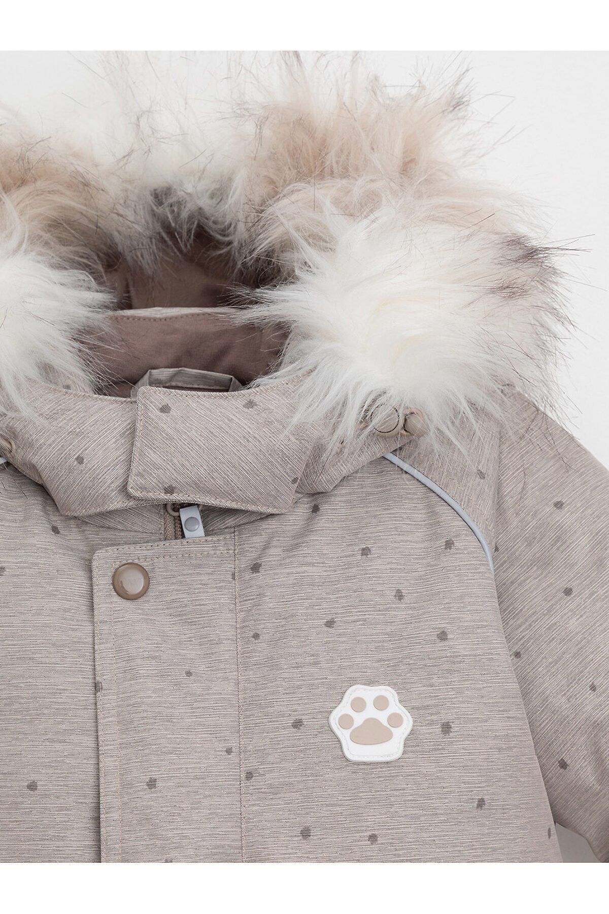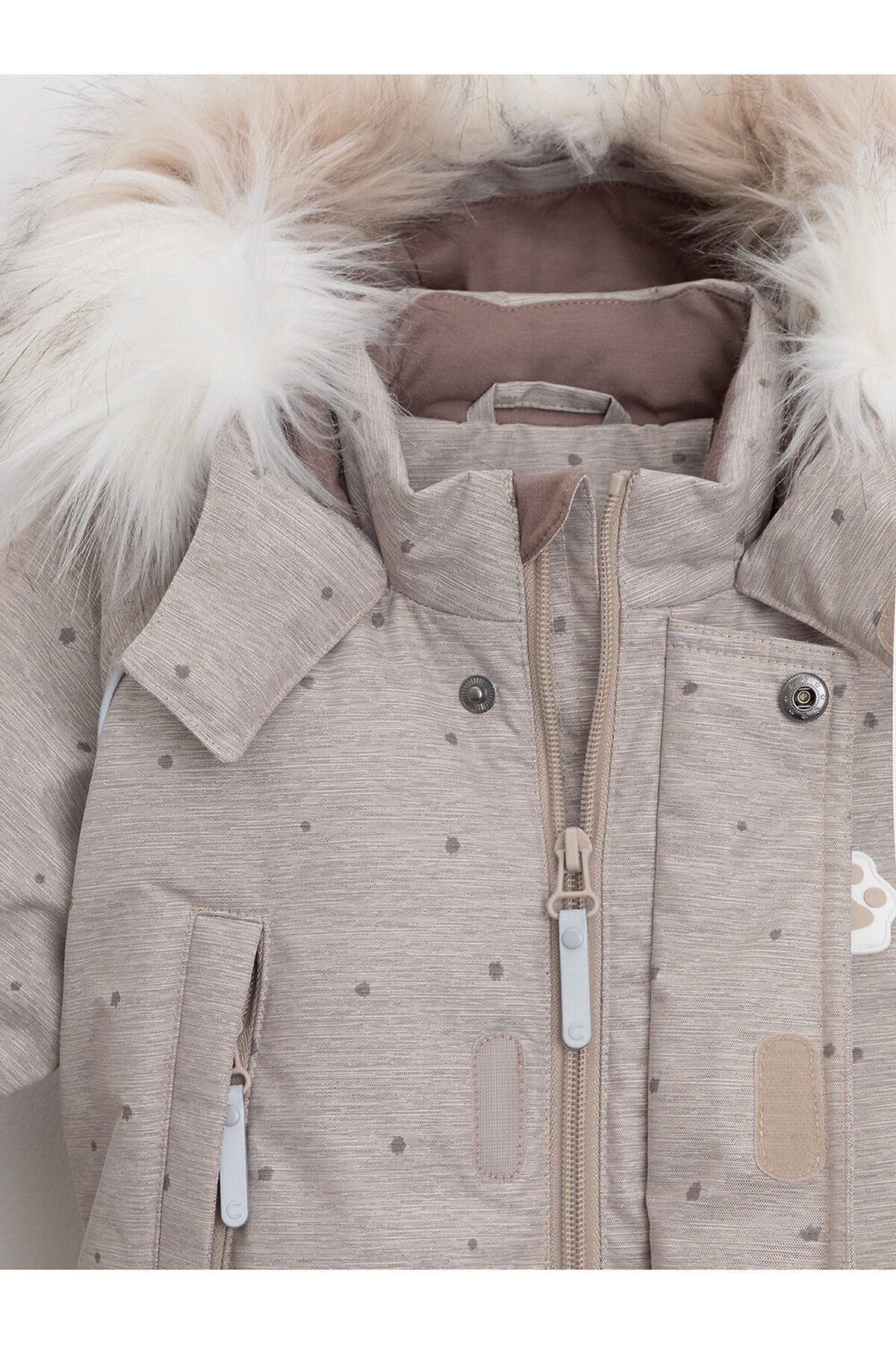 Зимний комбинезон ясельный с натуральным утеплителем из гусиного пуха (70%) и пера (30%). Выполнен из мембранной ткани с дополнительной тефлоновой обработкой, которая предохраняет изделие от загрязнений и отталкивает влагу. Подклад выполнен из 100% хлопка. Комбинезон застёгивается на молнию и внешнюю планку на липучках, предусмотрена защита подбородка. Несъёмный капюшон имеет эластичную утяжку со стопперами и отстёгивающийся мех на молнии. Резинка по спинке для лучшего прилегания. На груди карман на молнии. По рукавам и низу изделия эластичные манжеты, на ножках отстёгивающиеся силиконовые штрипки. В размерах с 68-74 по 80-86 в комплекте идут рукавицы и пинетки. Во всех изделиях верхнего ассортимента для безопасности ребёнка предусмотрены светоотражающие элементы.