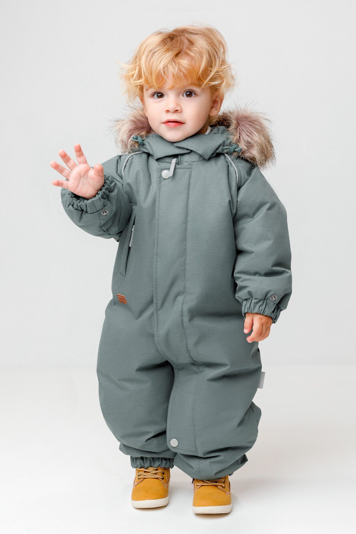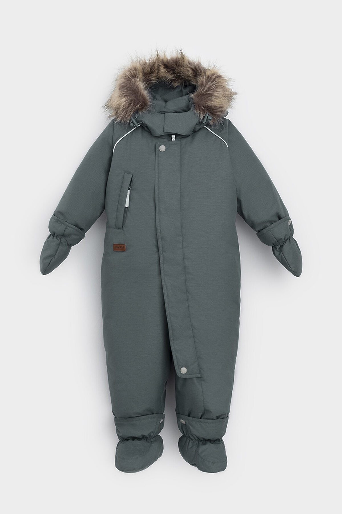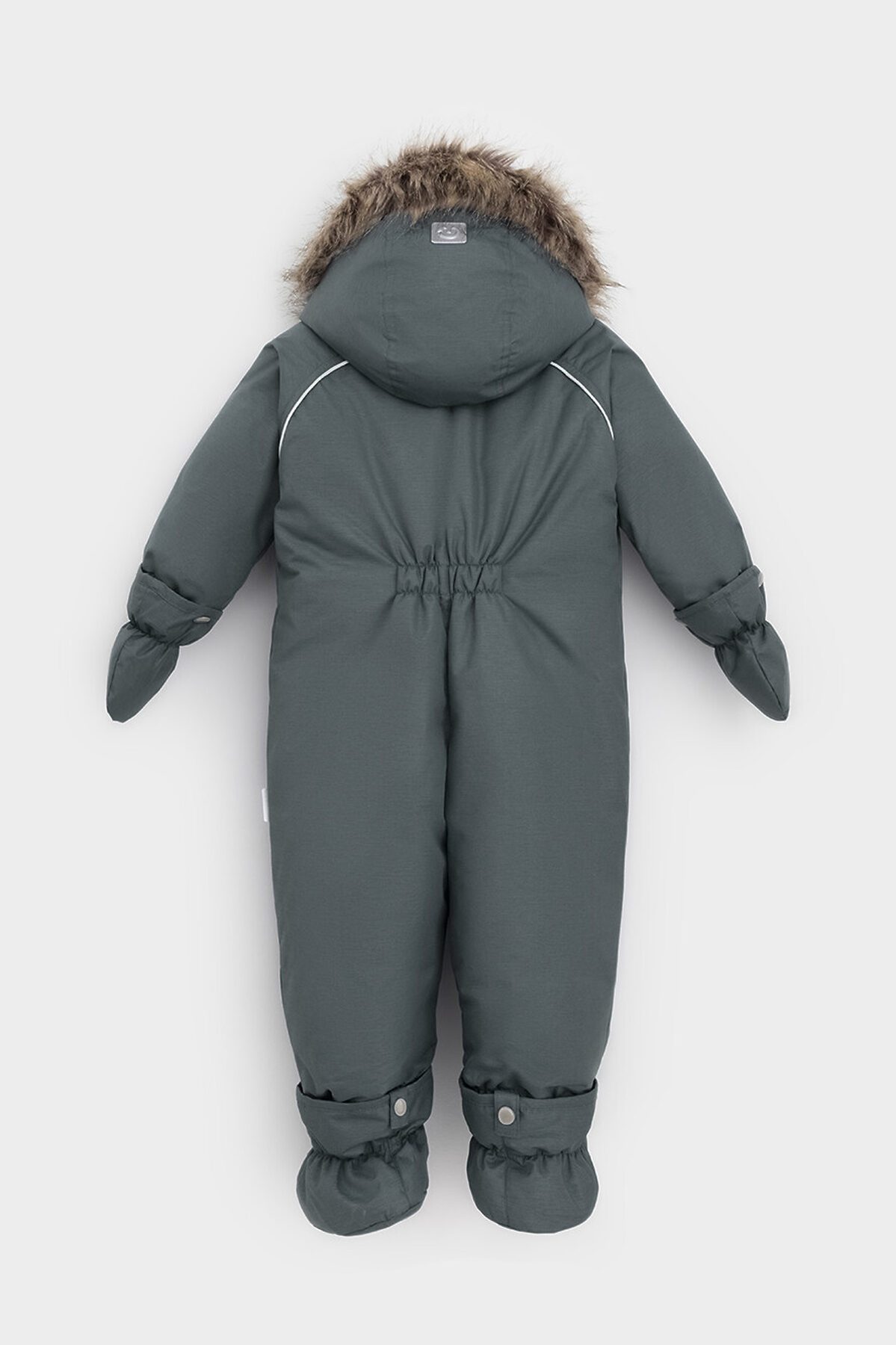 Зимний комбинезон ясельный с натуральным утеплителем из гусиного пуха (70%) и пера (30%). Выполнен из мембранной ткани с дополнительной тефлоновой обработкой, которая предохраняет изделие от загрязнений и отталкивает влагу. Подклад выполнен из 100% хлопка. Комбинезон застёгивается на молнию и внешнюю планку на липучках, предусмотрена защита подбородка. Несъёмный капюшон имеет эластичную утяжку со стопперами и отстёгивающийся мех на молнии. Резинка по спинке для лучшего прилегания. На груди карман на молнии. По рукавам и низу изделия эластичные манжеты, на ножках отстёгивающиеся силиконовые штрипки. В размерах с 68-74 по 80-86 в комплекте идут рукавицы и пинетки. Во всех изделиях верхнего ассортимента для безопасности ребёнка предусмотрены светоотражающие элементы.