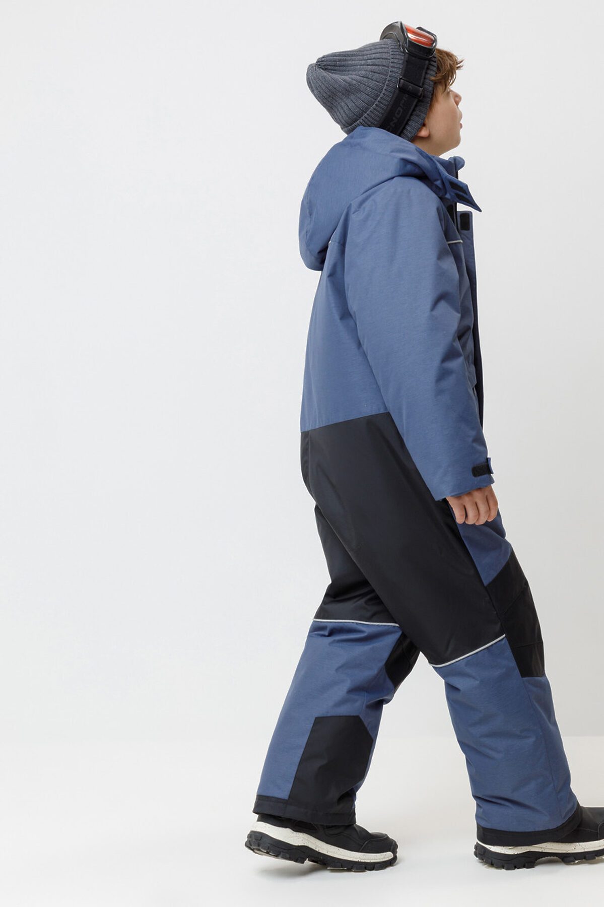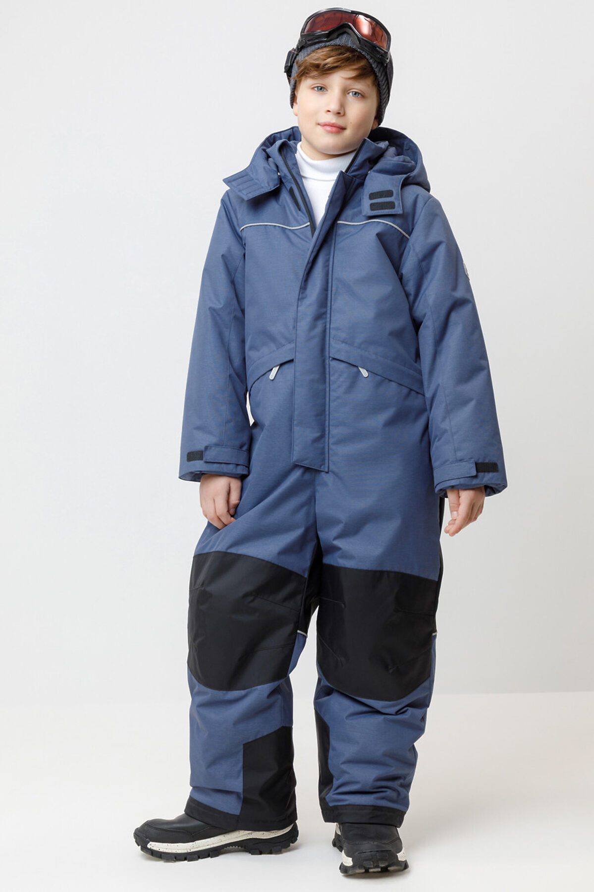 Зимний комбинезон для мальчика с утеплителем Fellex®: 250 г/м2 . Выполнен из мембранной ткани с дополнительной тефлоновой обработкой, которая предохраняет изделие от загрязнений и отталкивает влагу. Подклад выполнен из 100% полиэстера Tricot. Комбинезон застёгивается на молнию и внешнюю планку на липучках и кнопках, предусмотрена защита подбородка. Съёмный капюшон имеет эластичную резинку по бокам. Резинка по спинке обеспечивает лучшее прилегание. По бокам два кармана на молнии. На рукавах эластичные внутренние манжеты, ширина регулируется при помощи липучки. Внутренняя противоснежная юбка по низу изделия защищает обувь от попадания снега и удерживает комбинезон в закреплённом положении. В размерах с 98-104 по 116-122 предусмотрены отстёгивающиеся штрипки. Во всех изделиях верхнего ассортимента для безопасности ребёнка предусмотрены светоотражающие элементы