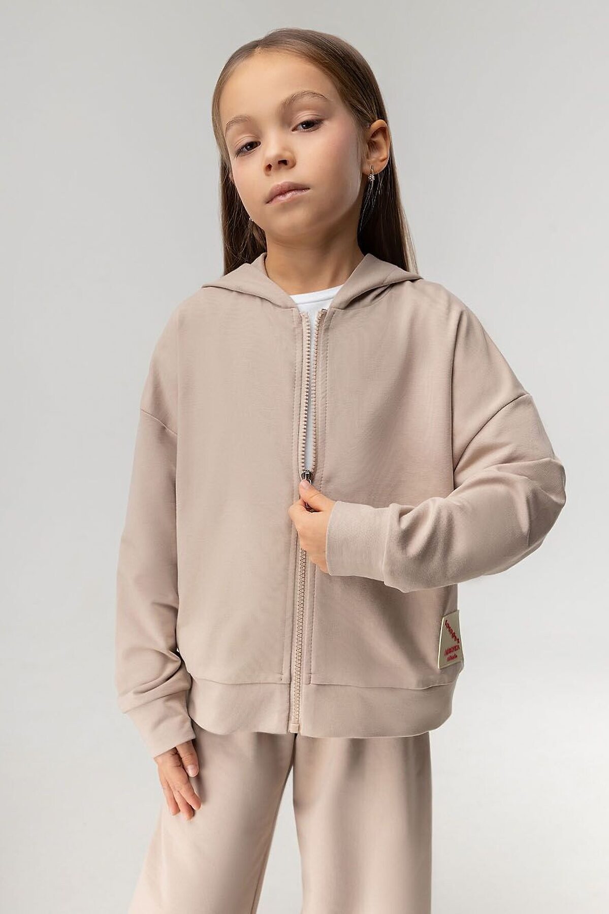 Костюм для детей дошкольного возраста. Толстовка укороченная, прямого силуэта, с центральной бортовой застёжкой на тесьму молния, на притачном поясе по низу изделия, со спущенным плечом, с втачными рукавами с притачной манжетой, с втачным капюшоном. Брюки прямые свободные с цельнокроеным поясом с внутренней резинкой. Низ ровный.