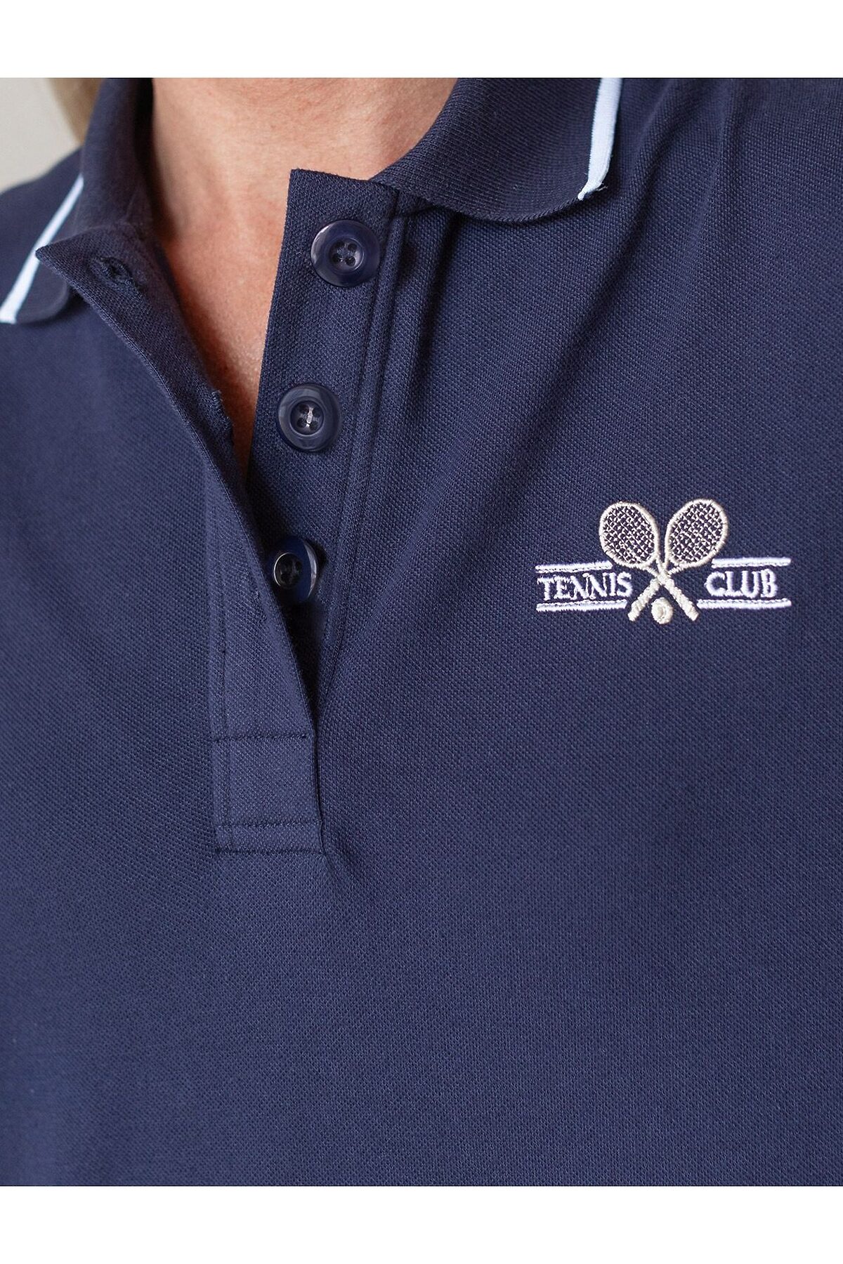 Платье-поло выполнено из фактурного трикотажа. Перевод принта: Теннисный клуб Идеальный выбор для тех, кто ценит комфорт и стиль. Изделие обеспечивает свободу движений и сохраняет свою форму в течение долгого времени. Классический крой теннисного платья подчеркивает фигуру и женственность. Практичная длина позволяет свободно двигаться даже при активных движениях. Подходит для спорта, дама и повседневного аутфита.