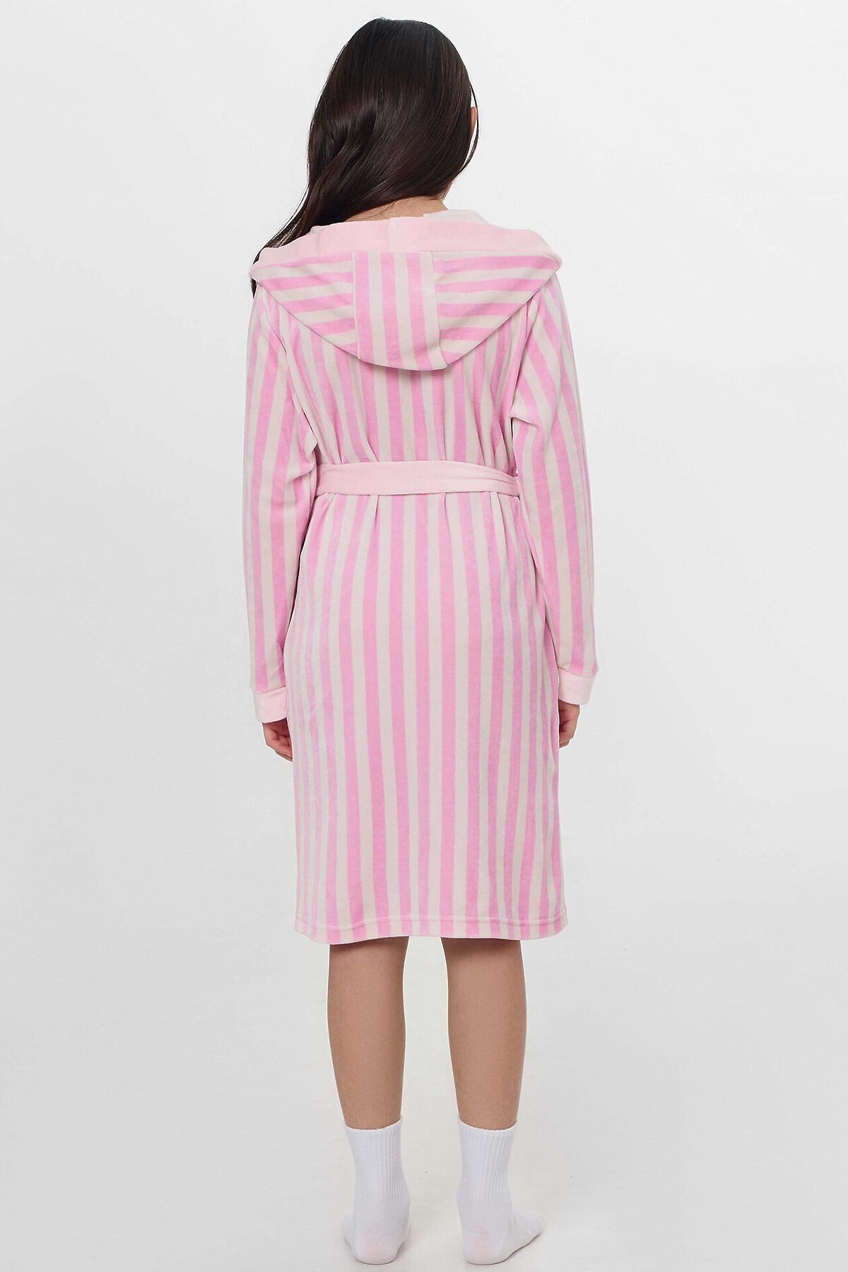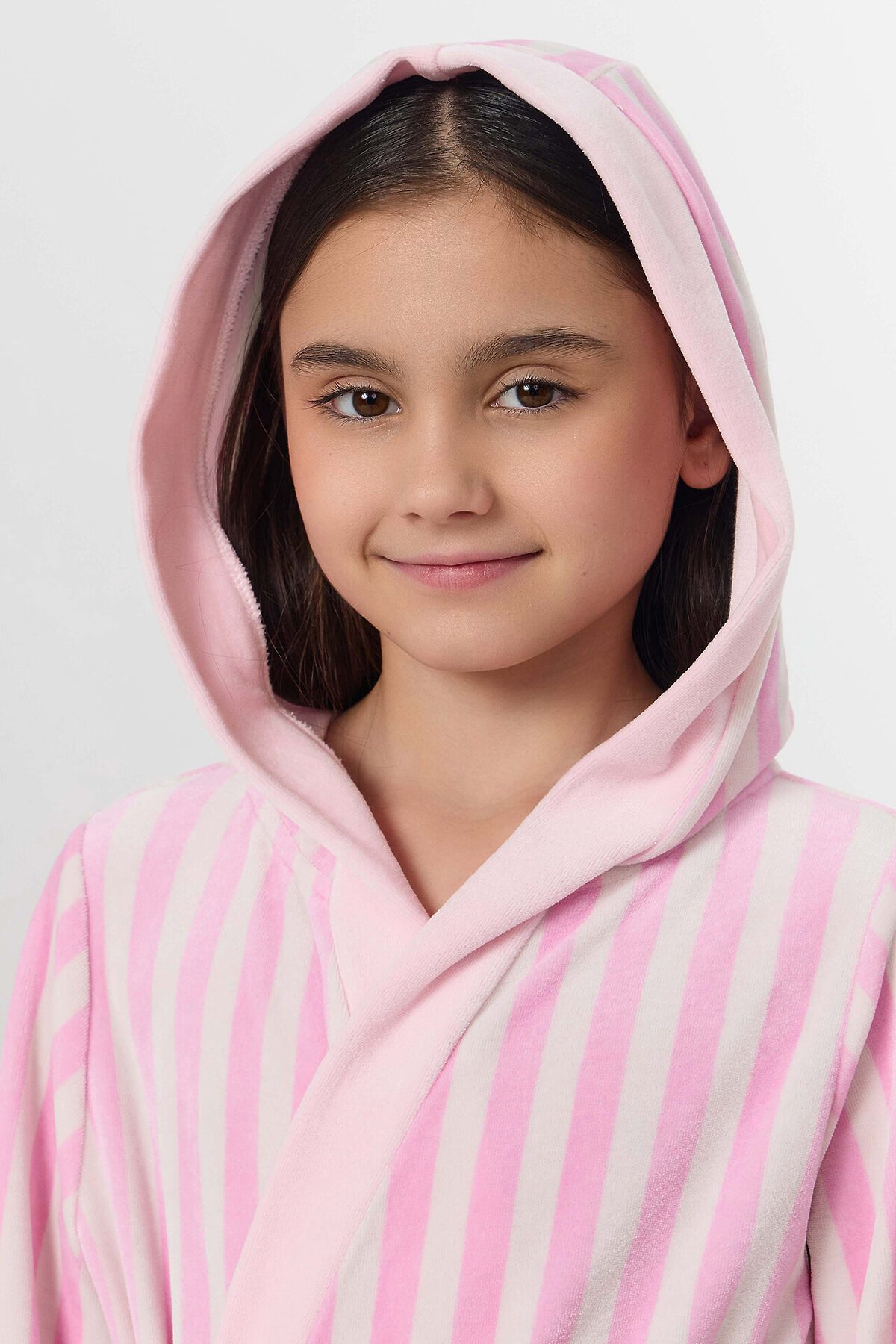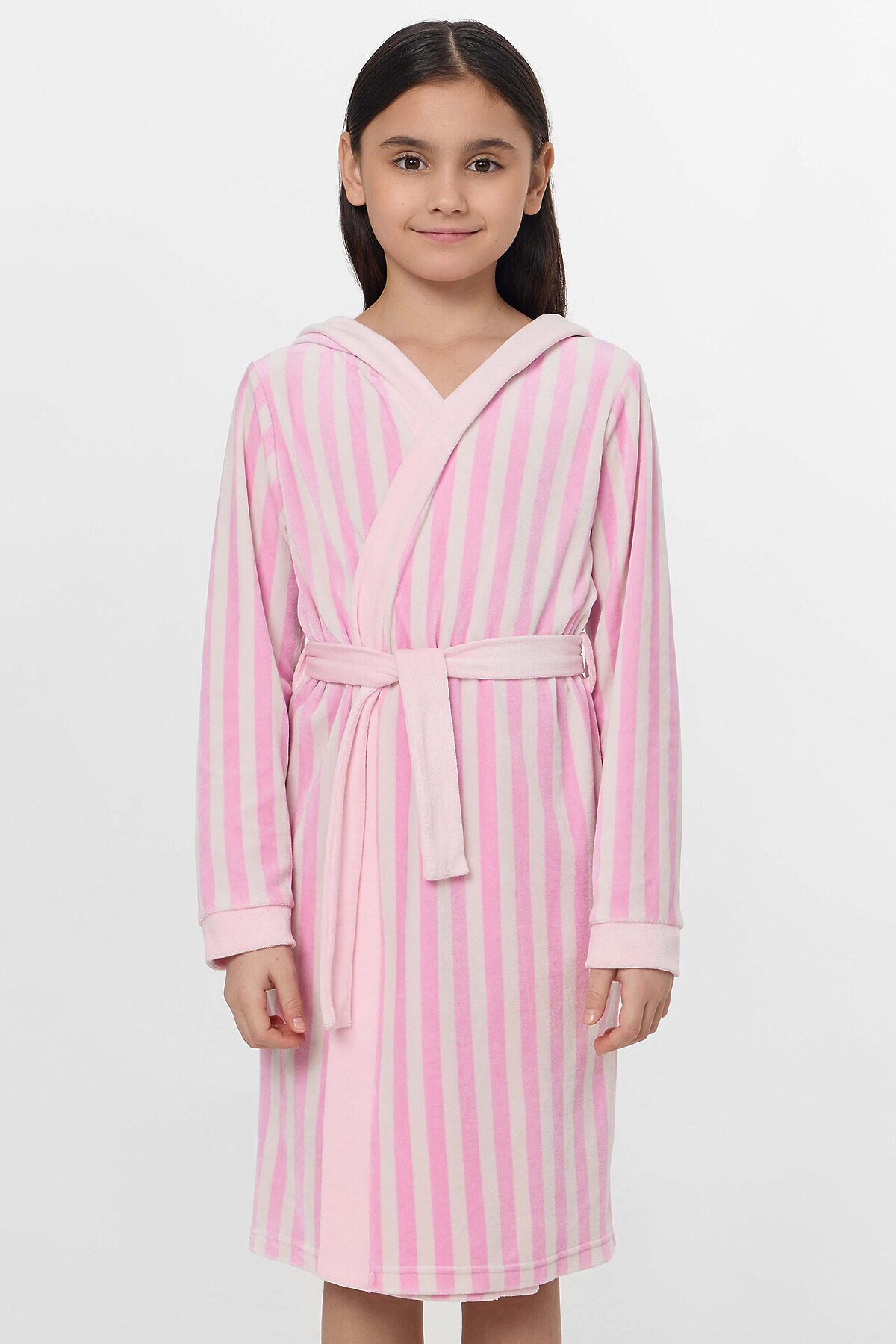 Халат для девочек, для отдыха изготовлен из велюра. Силуэт прямой, длина ниже коленей. Халат с запахом, с капюшоном, с съемным поясом, продетым в шлевки в боковых швах. Концы пояса свободно завязываются. В боковых швах обработаны карманы. Рукава длинные с манжетами, втачены в открытые проймы. Спинка цельнокроеная. По срезам борта и капюшона притачена планка. Низ изделия застрочен на 2-хигольной плоскошовной машине. По срезу втачивания капюшона настрочена тесьма и вешалка из бейки из велюра.