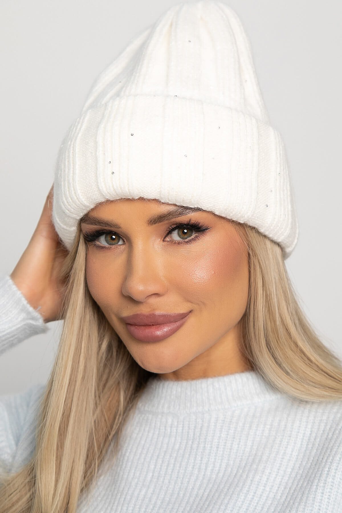 Эта двухслойная шапка с отворотом — идеальный аксессуар для зимнего периода. Выполненная с вязкой в полоску и добавлением люрексной нити с пайетками в плетении, она не только обеспечивает тепло, но и становится стильным визуальным акцентом в вашем образе.