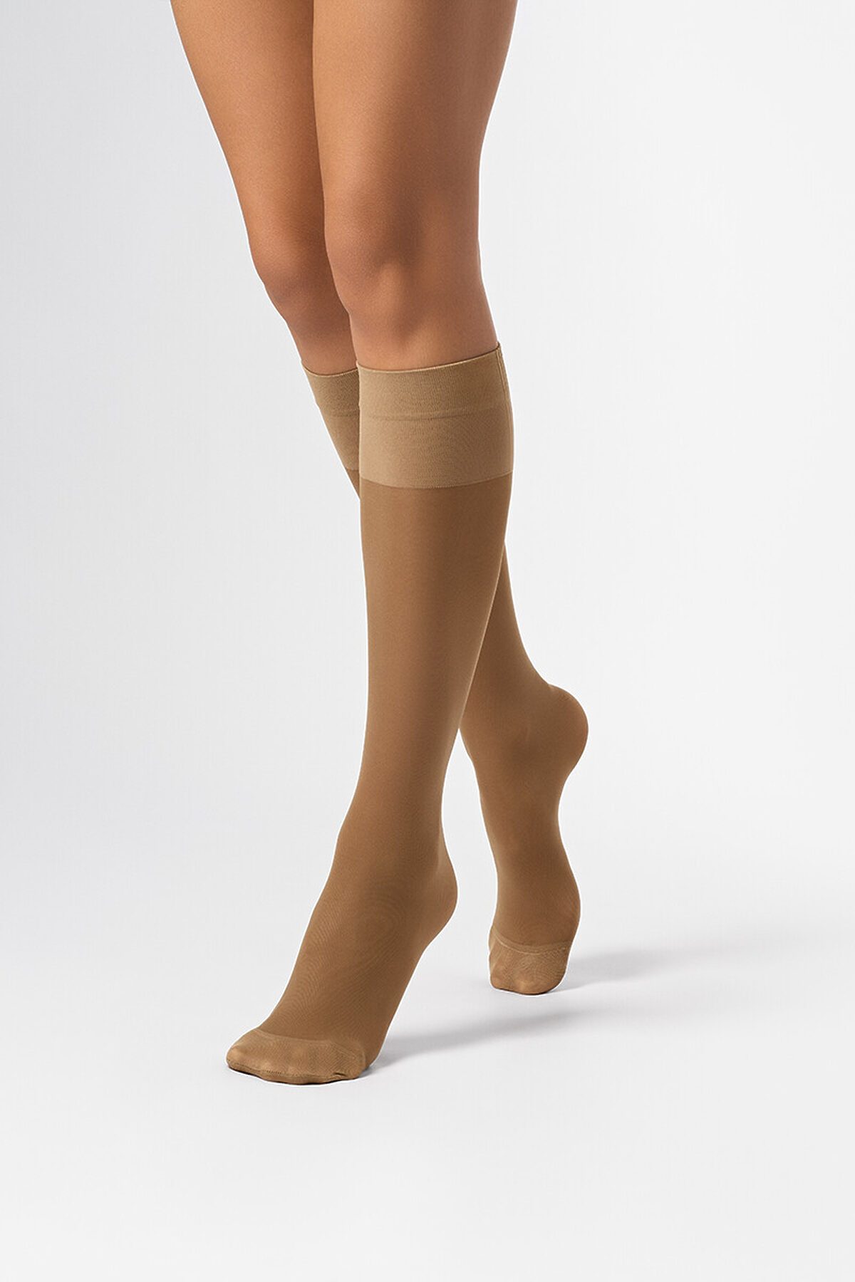 Матовые эластичные гольфы 40 DEN с распределённым давлением по ноге. Удобная резинка дифференцированной конструкции обеспечивает максимальный комфорт и мягко фиксирует гольфы на ноге, а укреплённый мысок повышает износостойкость и прочность. Распределённое давление создаёт лёгкий микромассажный эффект, который снижает ощущение усталости и поддерживает мышечный тонус в течение всего дня. Гольфы легко впишутся в любой гардероб: они элегантно дополнят строгий деловой образ или станут стильным элементом расслабленного повседневного наряда. Гольфы универсально сочетаются как с лаконичными деловыми образами, так и с расслабленными повседневными аутфитами. Идеальный баланс стиля, комфорта и элегантности.
