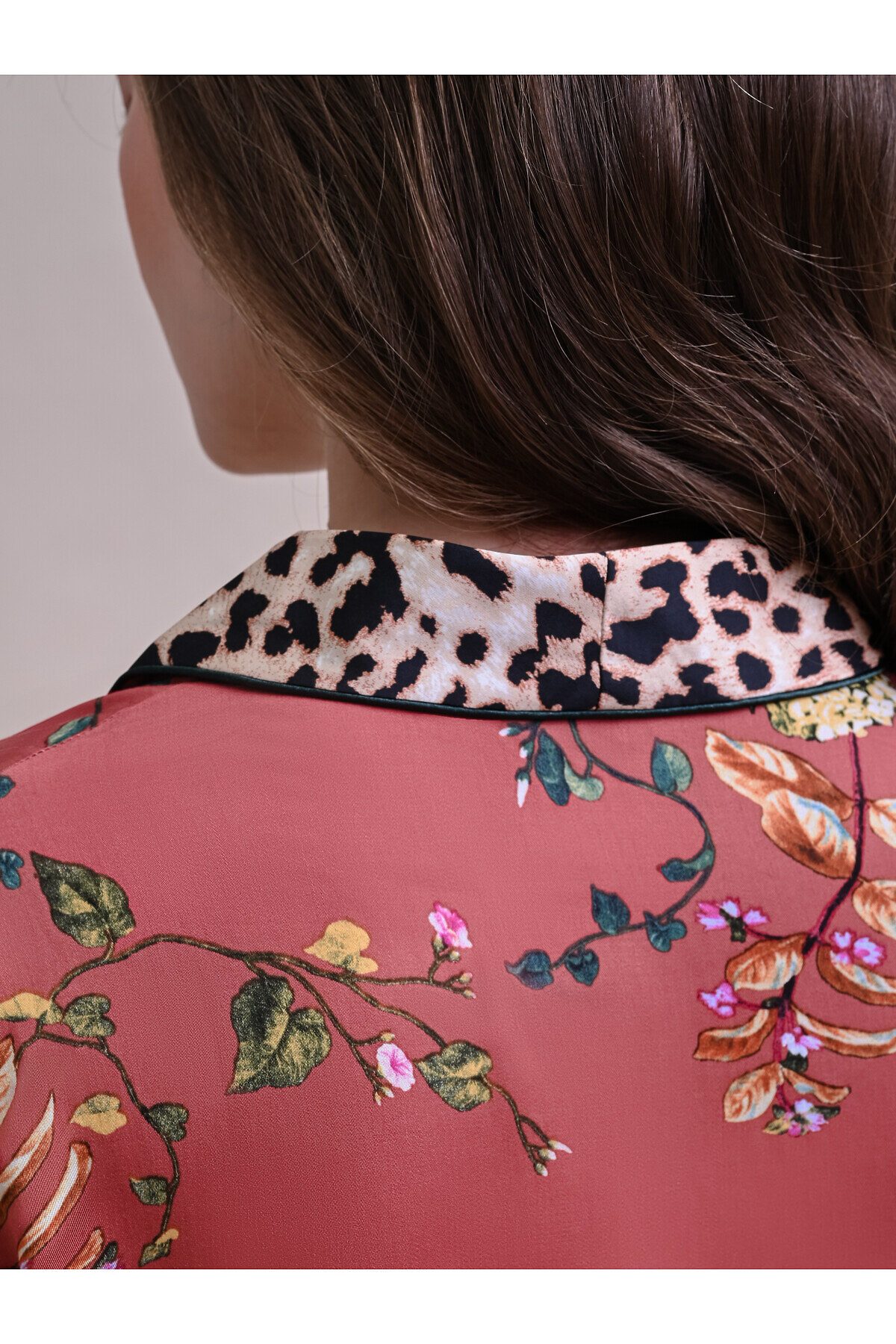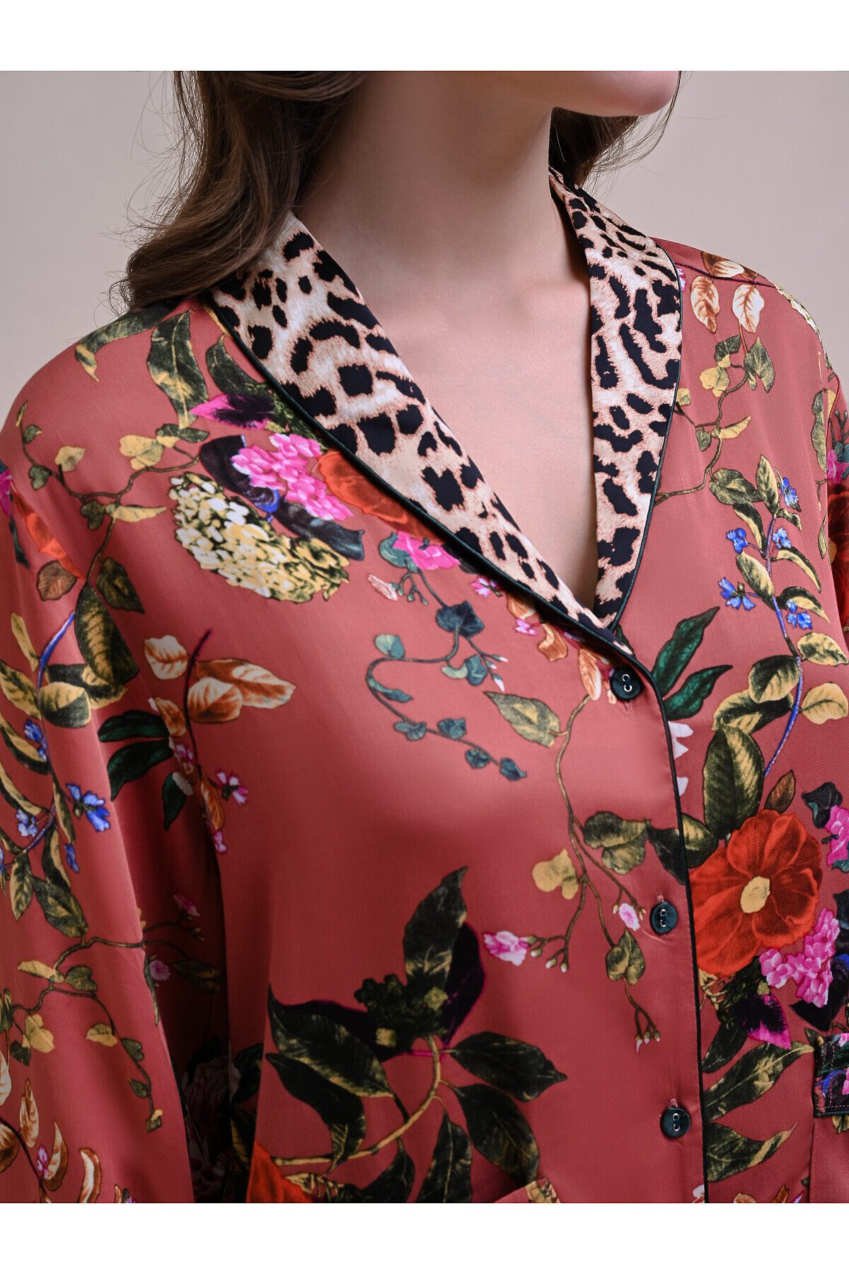 Домашняя пижама от торговой марки Индефини. В комплекте рубашка с брюками. Рубашка из вискозы, красно-коричневого цвета, с цветочным принтом, со вставками леопардового принта, с длинными рукавами, с воротником-отворотом, с кармашками по бокам, на пуговичках, прямая, свободного кроя. Брюки из вискозы, красно-коричневого цвета, с цветочным принтом, со вставками леопардового принта, на мягкой резинке, прямые, свободного кроя.