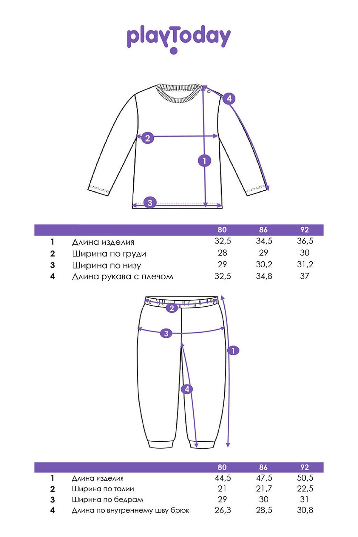 Детский трикотажный комплект для мальчика от PlayToday — яркий, удобный и практичный вариант на каждый день. В нём ребёнку будет комфортно и в детском саду, и дома, и на прогулке. Мягкая хлопковая ткань с эластаном тянется, дышит и не стесняет движений — идеальный выбор для активного малыша. Преимущества модели: + застёжка на кнопки на плече — легко надеть даже на самого подвижного ребёнка + яркий принт — поднимает настроение + мягкий пояс на резинке со шнурком — удобная посадка, которая не давит + низ брюк на резинке — фиксирует штанины, не давая им задираться + отсутствие карманов — безопасно и удобно для малышей Этот детский трикотажный костюм идеально подойдёт для игр, прогулок и занятий в садике. Ткань хорошо держит форму, сохраняет яркость цвета даже после множества стирок и дарит полный комфорт малышу. Совет по стилю: Футболку и брюки можно носить вместе или отдельно, комбинируя с другими вещами из коллекции PlayToday. Размеры: модель представлена на рост 80, 86 и 92 см — подходит для мальчиков от 1 года до 3 лет. Детский трикотажный комплект для мальчика от PlayToday — это удобный костюм для детского сада, дома и прогулок, в котором малышу всегда комфортно и легко двигаться.