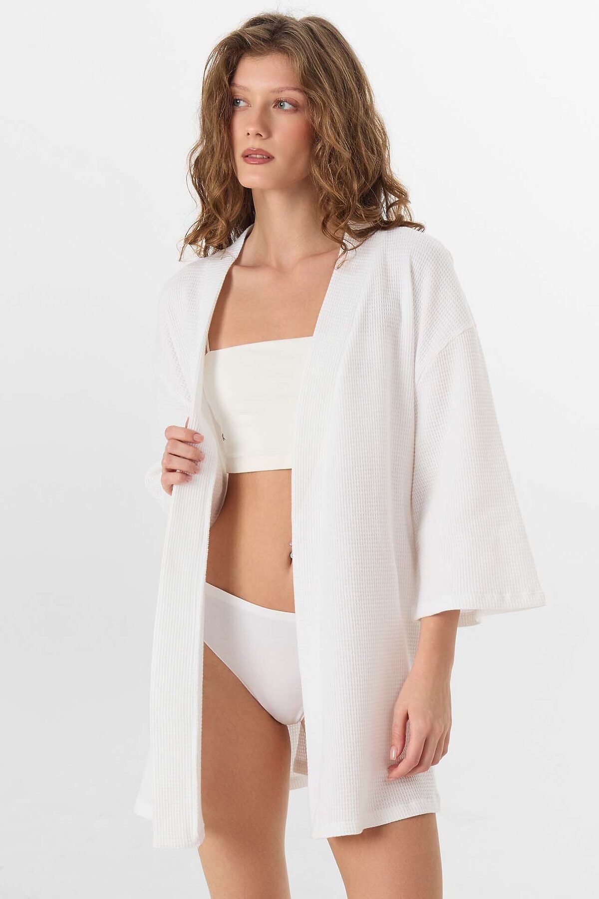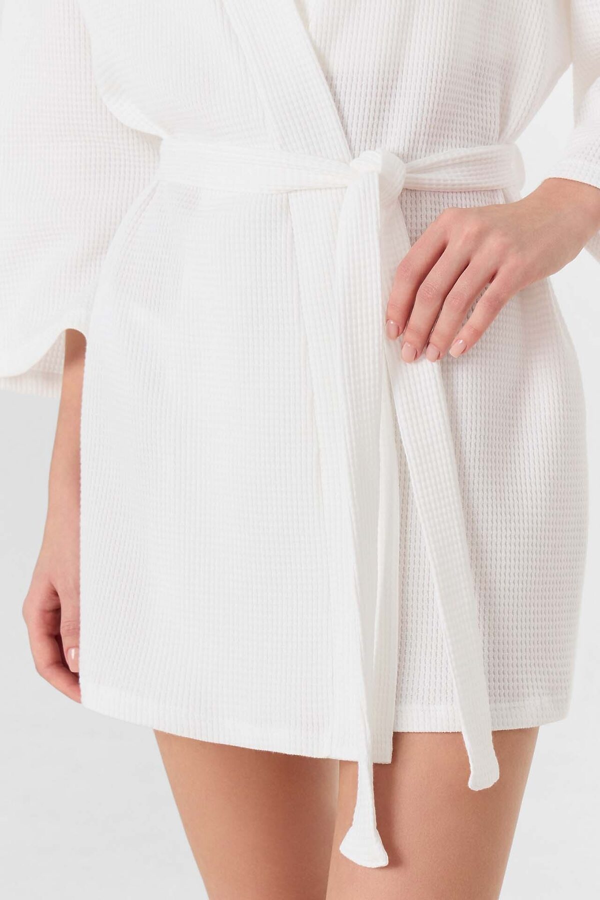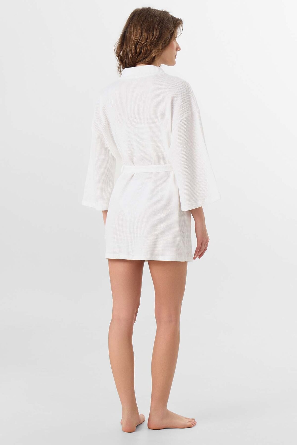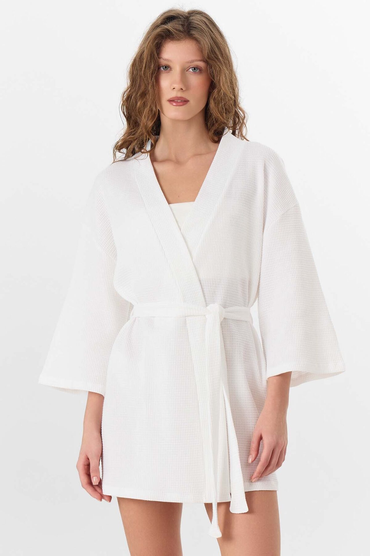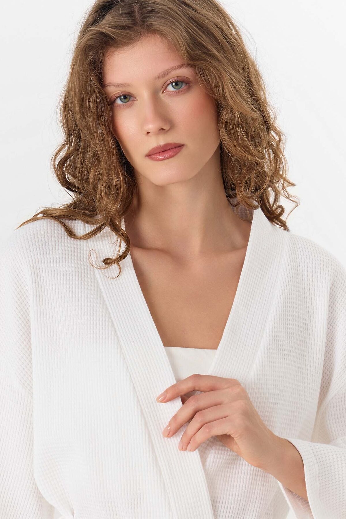 Халат прямого силуэта, укороченный. Спинка цельнокроеная. Халат с запахом, со съемным поясом, продетым в шлевки в боковых швах. Концы пояса свободно завязываются. Рукава чуть укороченные. По срезам борта и горловины притачена планка. Нижние срезы рукавов и халата подложены.