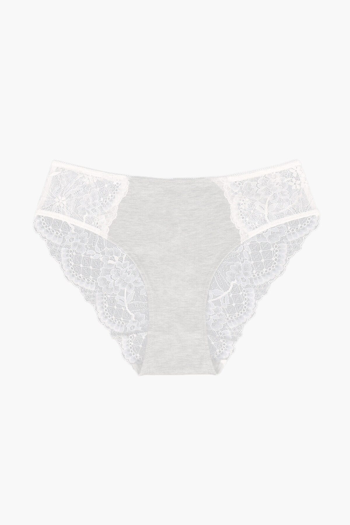 Женские трусы со средней посадкой сшиты из бамбуковой ткани. Передняя часть выполнена из гладкого трикотажа, задняя — из тонкого кружева с цветочным рисунком. Крой закрывает линию бедра и сидит ровно за счет эластичного пояса. Материал мягкий и гладкий и подходит для ежедневной носки.