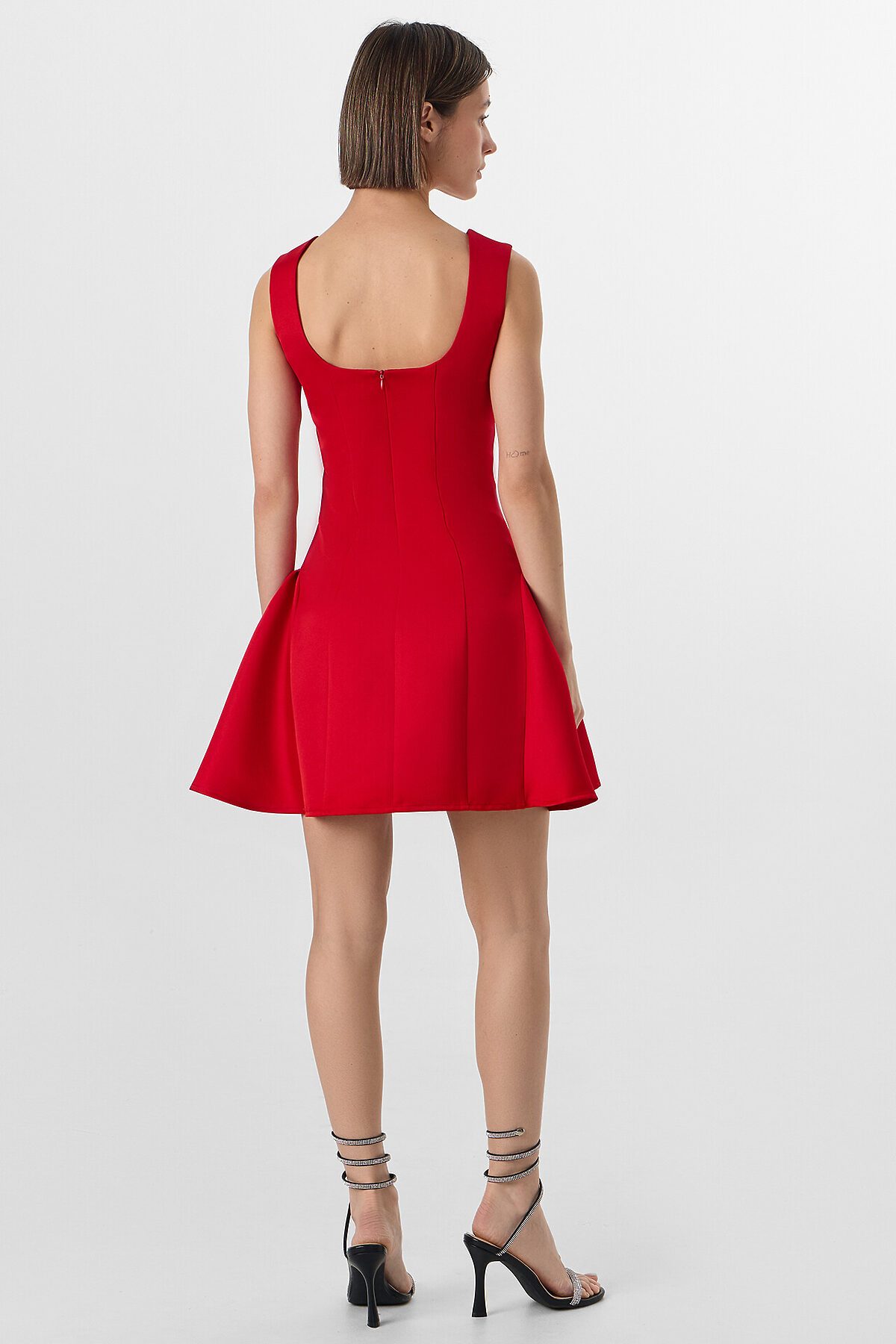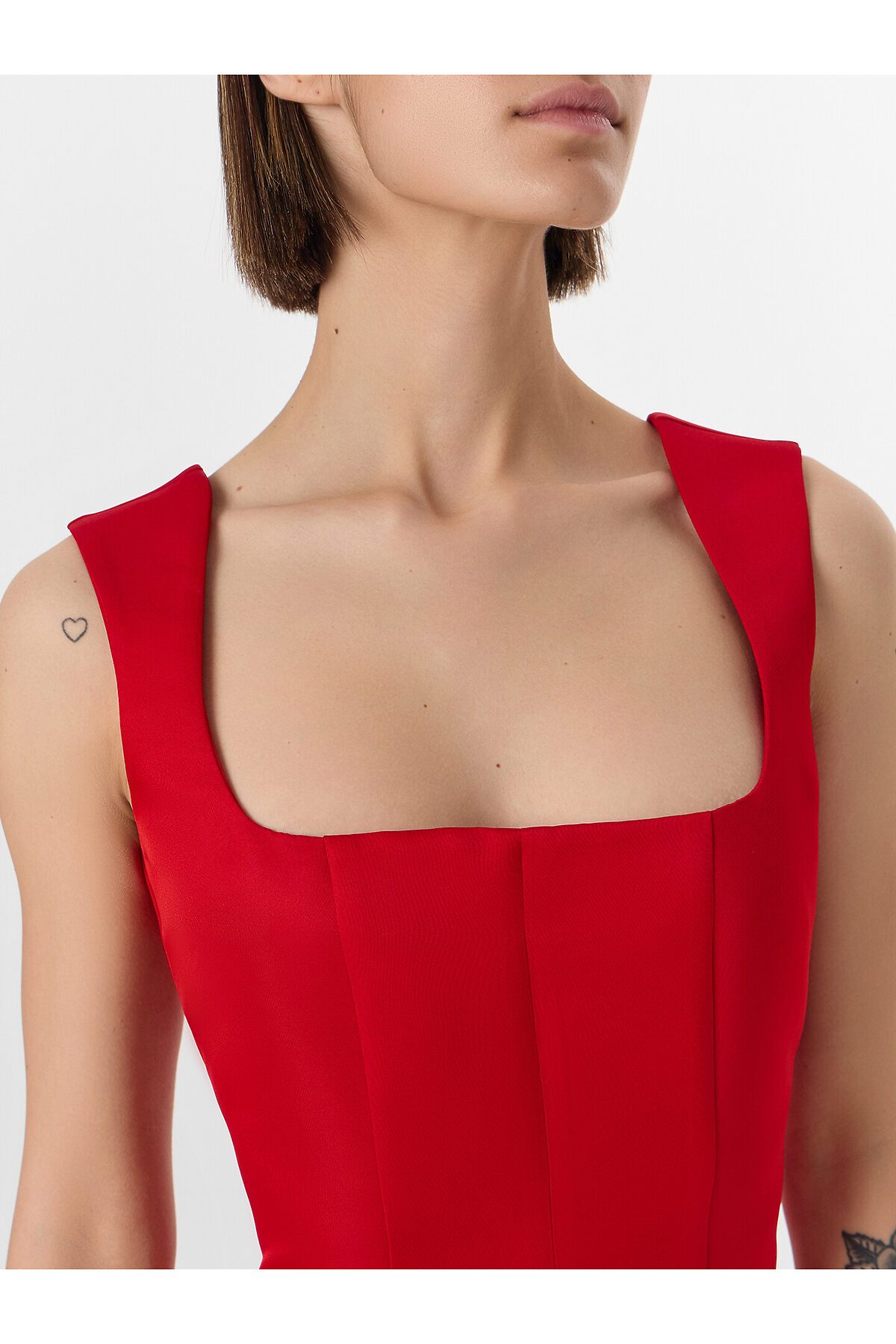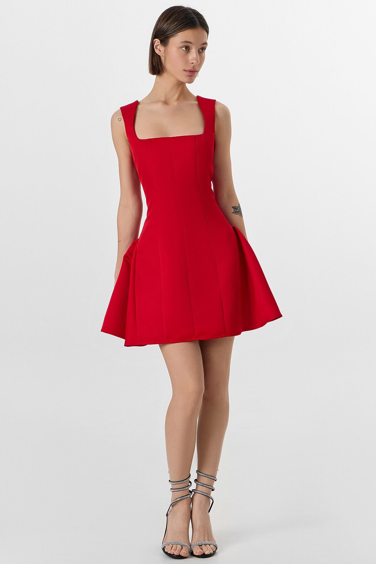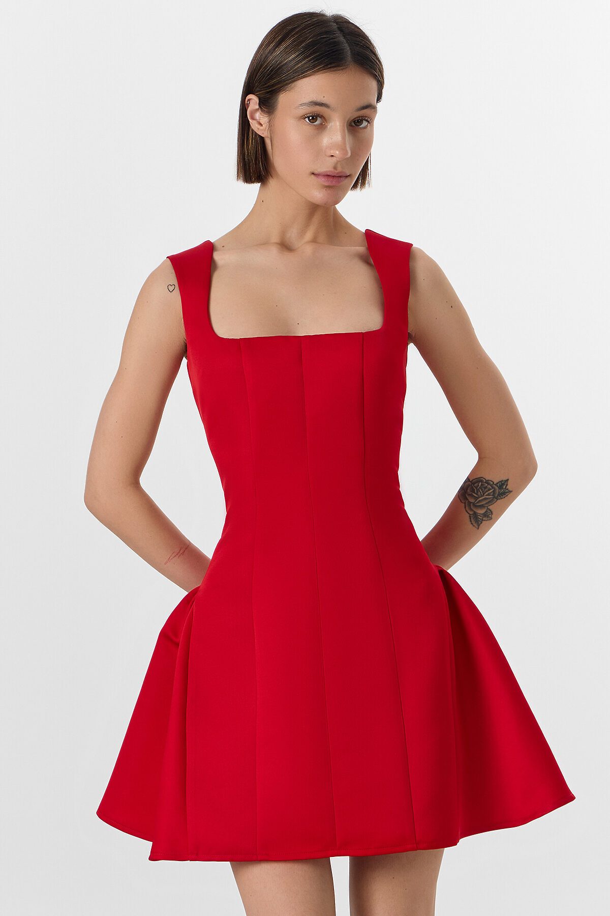 Красное нарядное платье с вырезом каре создает образ уверенной женственности. Модель мини-длины с изящными драпировками по боковым швам юбки мягко подчеркивает фигуру, подчеркивая изящество линий.