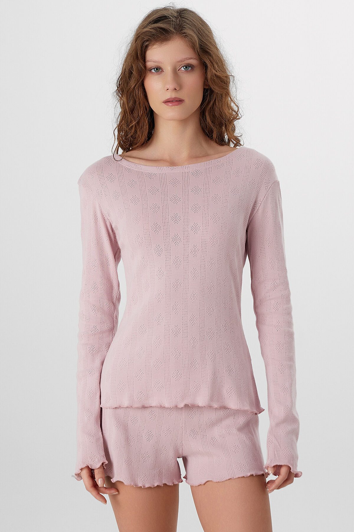 Джемпер полуприлегающего силуэта с удлиненными рукавами и овальной горловиной мягко облегает фигуру, не стесняя движений во время сна. Шорты с эластичным поясом на резинке плотно сидят на талии, сохраняя идеальную посадку. Оба элемента обработаны на микрооверлоке — эта технология предотвращает деформацию швов и продлевает срок службы комплекта после многократных стирок.
