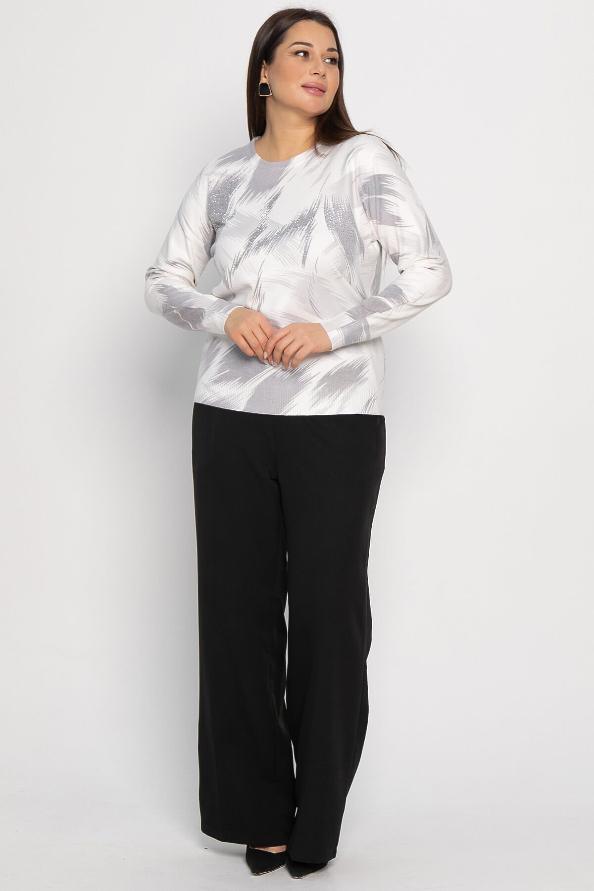 Лонгслив в серо-белых тонах прямого кроя с длинными рукавами станет отличным дополнением к вашему повседневному гардеробу. Его округлый вырез и манжеты на резинке обеспечивают комфортную посадку, а широкая резинка внизу изделия добавляет удобство в носке. Этот лонгслив украшен стразами, что придает ему стильный вид. Благодаря универсальному дизайну, он легко сочетается с различными элементами гардероба — от джинсов до юбок, позволяя создавать разнообразные образы. Добавьте этот лонгслив в свою коллекцию и наслаждайтесь его удобством и стильным внешним видом каждый день!