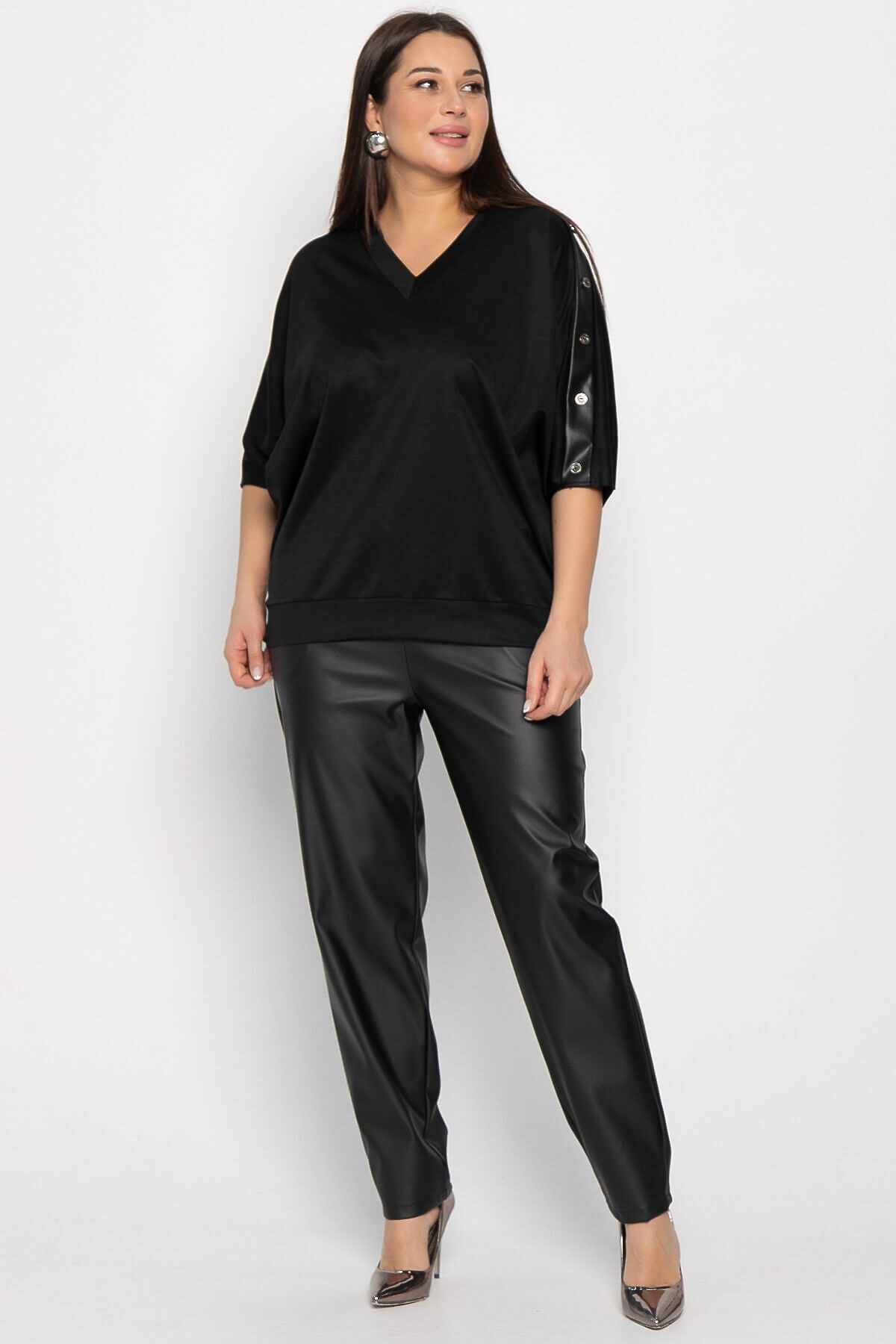 Представляем стильный и современный костюм-двойку, который может стать основой вашего гардероба. Этот комплект, включающий удобную трикотажную блузу и элегантные брюки из экокожи, идеально подходит как для повседневных образов, так и для особых мероприятий. Особенностью блузы является декоративная планка из экокожи, расположенная на одном из плечевых швов. Эта деталь, украшенная стильными пуговицами, придаёт блузе уникальный и завершённый вид, создавая интересный визуальный контраст.