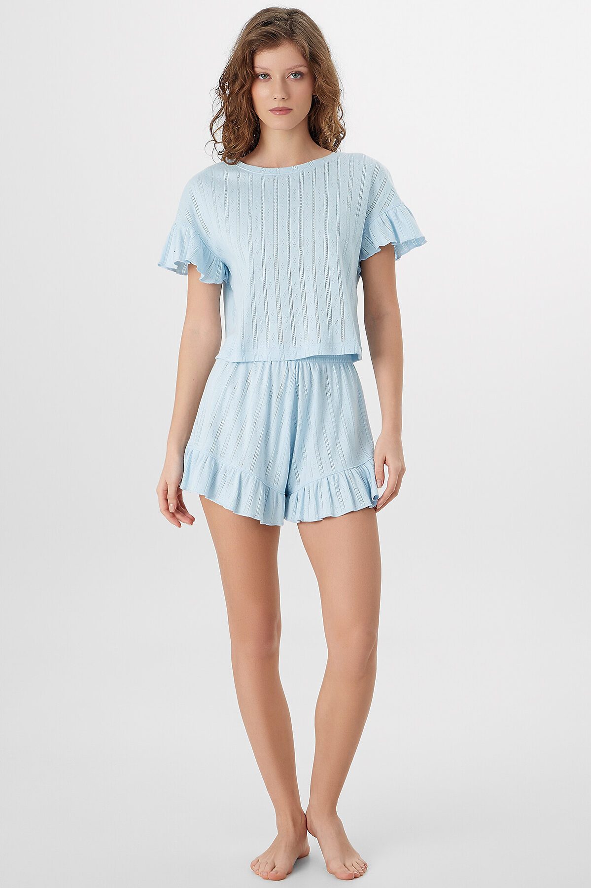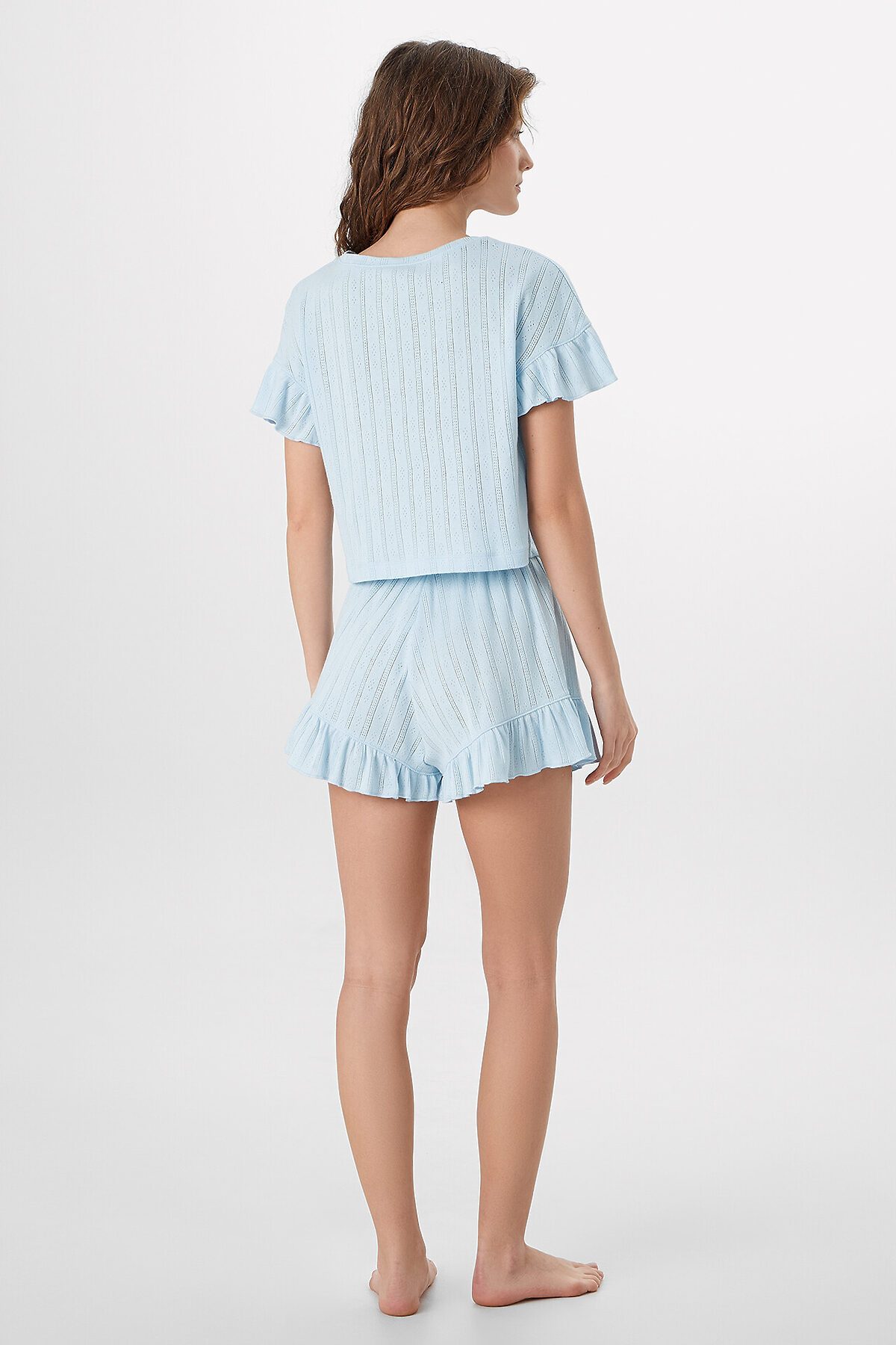 Джемпер свободного силуэта, укороченный. Перед и спинка цельнокроеные. Рукав цельнокроеный, короткий. По низу рукавов рюши, обработанные на микрооверлоке. Горловина круглой формы, обработана обтачкой. Низ изделия вподгибку. Шорты свободного силуэта, укороченные, с посадкой на талии. Пояс цельнокроеный, с втачной эластичной тесьмой 30RV. По шву сидения силиконовая лента 4мм, Sil-4. По низу шорт рюши, обработанные на микрооверлоке.