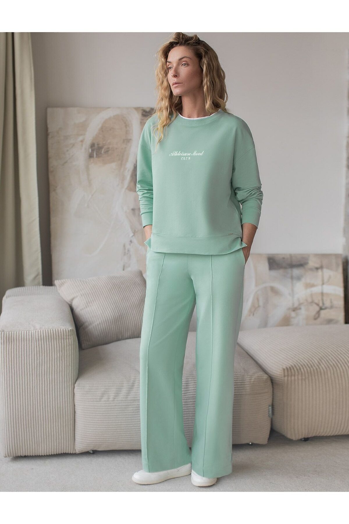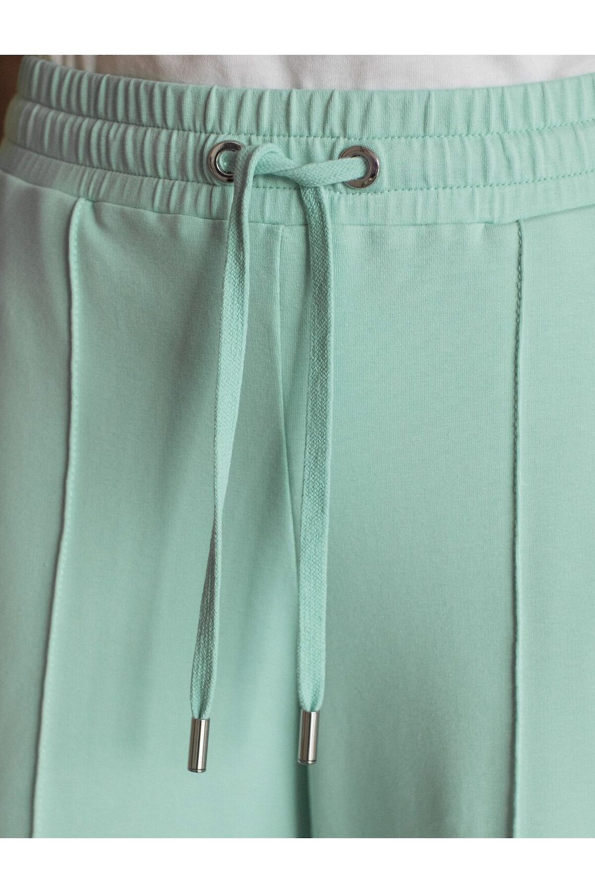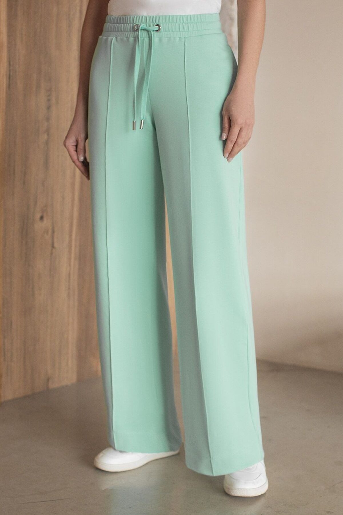 Брюки мятного цвета прямого кроя выполнены из премиального футера-двухнитки. Лаконичный силуэт поддерживают застроченные стрелки, зрительно вытягивающие силуэт. Удобный пояс на резинке регулируется хлопковым шнурком с золотистой фурнитурой. Наличие эластана в составе изделия гарантирует комфорт и долговечность изделия. Эластичный материал хорошо пропускает воздух, позволяя телу дышать, и легко тянется, не ограничивая движения. Эти уютные брюки созданного для вашего комфорта. Нежный и стильный вариант подходит на любую фигуру, благодаря своей идеальной посадке. Свободный прямой крой обеспечивает свободу движений и максимальное удобство в любых ситуациях, поэтому они подойдут и на большие размеры, включая 56 размер. Стильный расклешенный крой добавляет изюминку в ваш образ. Эти брюки универсальны и могут стать отличным вариантом, как для занятий, так и для повседневной носки. Они легко вписываются в повседневный образ, благодаря универсальности и элегантности. Достоинства фигуры подчеркиваются, а силуэт визуально вытягивается за счет кроя палаццо и стрелок. В этих спортивных брюках вы будете чувствовать себя комфортно и уверенно, наслаждаясь каждым моментом дня. Рекомендуем сочетать с артикулами: D49.160, D49.168