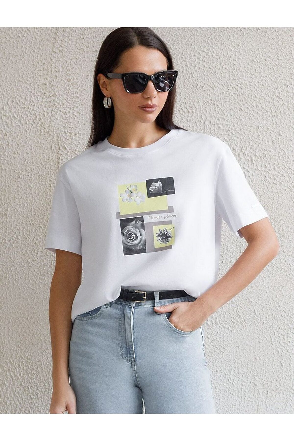 Модная футболка белого цвета привлекает внимание своим интересным дизайном и ярким принтом. Благодаря прямому крою изделие комфортно садится на любую фигуру, в том числе на большие размеры, и не сковывает движений. Круглый вырез подчеркивает современный стиль, а натуральный материал из хлопка с добавлением эластана обеспечивает удобство в повседневной носке и приятные тактильные ощущения. Прочность и износостойкая структура позволяют сохранять свежий внешний вид после множества стирок. Принт в виде цветов и надписи нанесен красками с устойчивым покрытием, перевод надписи: Flower power - Цветочная сила. Стильная футболка гармонично вписывается в любой гардероб и подойдет для прогулок, отдыха или неформальных встреч. Благодаря особенностям кроя модель хорошо сидит, скрывая недостатки и подчеркивая достоинства. Яркая футболка идеально сочетается с базовыми вещами, позволяя создавать новые интересные образы каждый день.